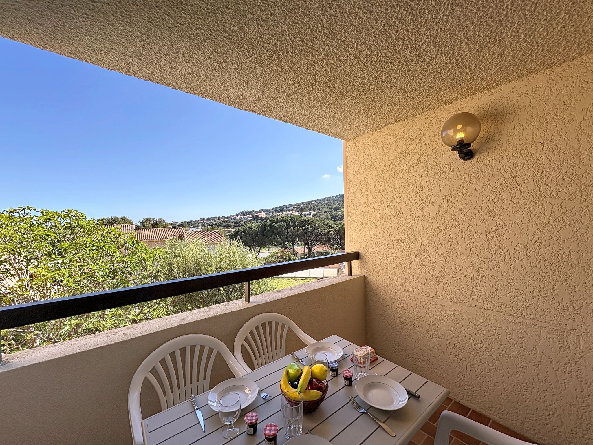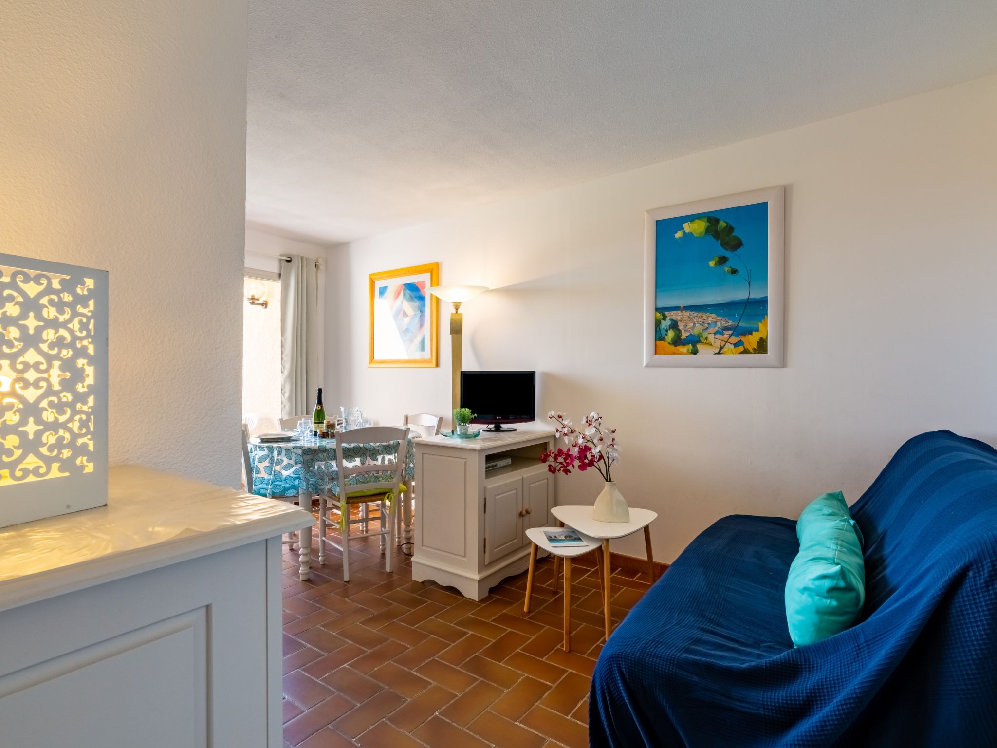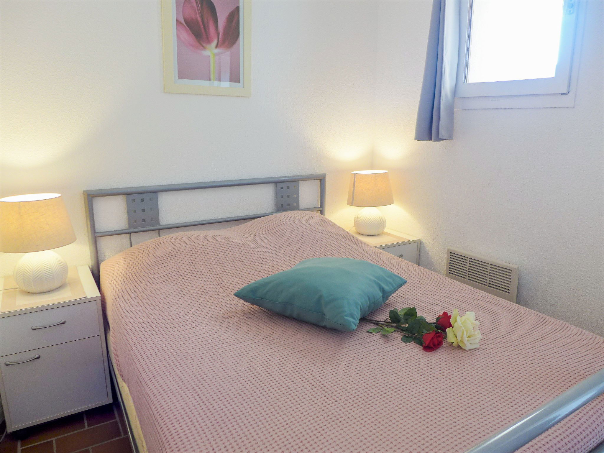 2-room apartment 40 m2 on 1st floor. Simple furnishings: living room with panoramic window with TV (flat screen), DVD and fan. Exit to the terrace. Sleeping alcove, without wardrobe with 1 x 2 bunk beds (80 cm, length 190 cm), fan. 1 room with 1 french bed (1 x 140 cm, length 190 cm), fan. Kitchenette (2 induction hot plates, toaster, kettle, microwave, electric coffee machine). Shower, sep. WC. Electric heating. Terrace 5 m2, roofed. Terrace furniture, deck chairs (2). Partial view of the sea. Facilities: washing machine, iron, hair dryer. Internet (WiFi, extra). Reserved parking space n A151/472. Please note: 1 small pet/ dog allowed. TV only FR. Smoke alarm. 83107000216J5