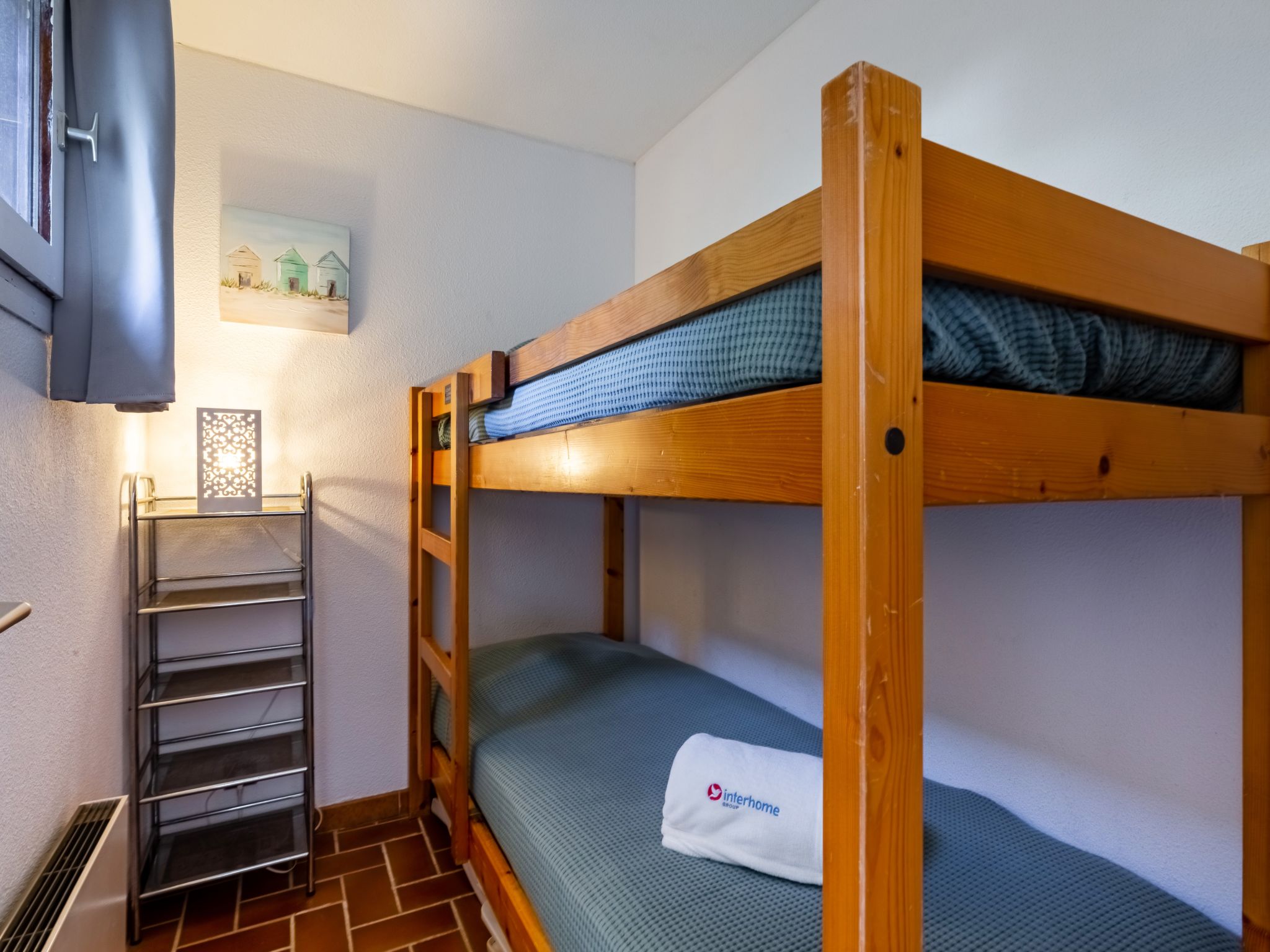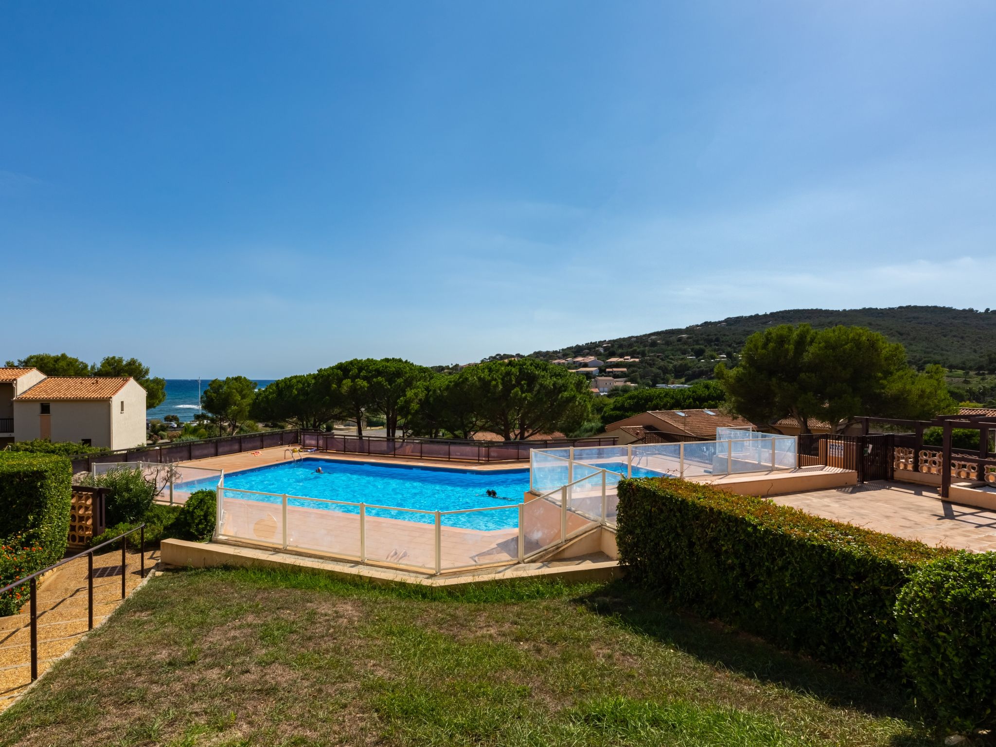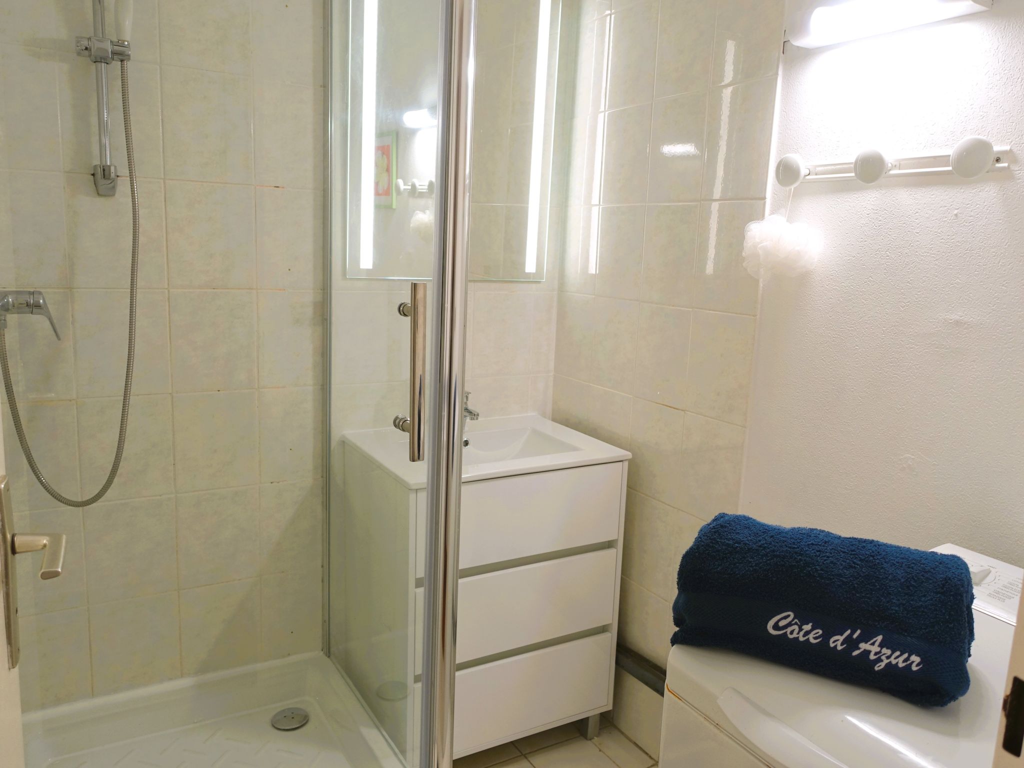 2-room apartment 40 m2 on 1st floor. Simple furnishings: living room with panoramic window with TV (flat screen), DVD and fan. Exit to the terrace. Sleeping alcove, without wardrobe with 1 x 2 bunk beds (80 cm, length 190 cm), fan. 1 room with 1 french bed (1 x 140 cm, length 190 cm), fan. Kitchenette (2 induction hot plates, toaster, kettle, microwave, electric coffee machine). Shower, sep. WC. Electric heating. Terrace 5 m2, roofed. Terrace furniture, deck chairs (2). Partial view of the sea. Facilities: washing machine, iron, hair dryer. Internet (WiFi, extra). Reserved parking space n A151/472. Please note: 1 small pet/ dog allowed. TV only FR. Smoke alarm. 83107000216J5