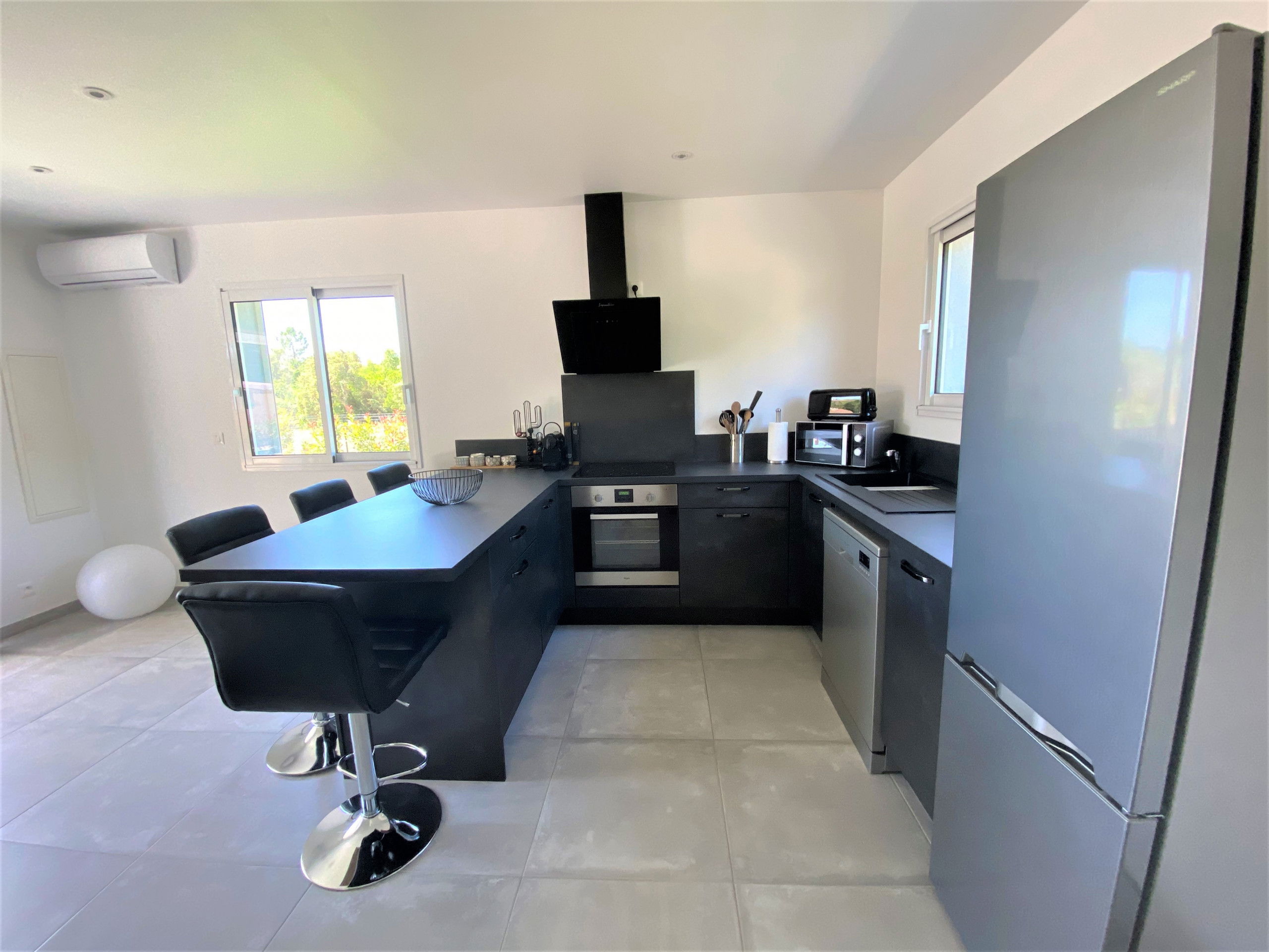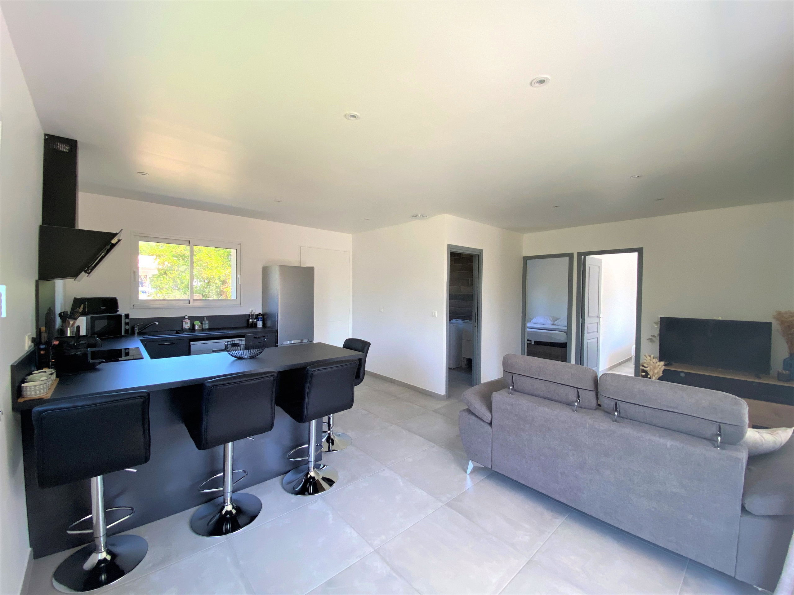 - A living room with a fully equipped American kitchen