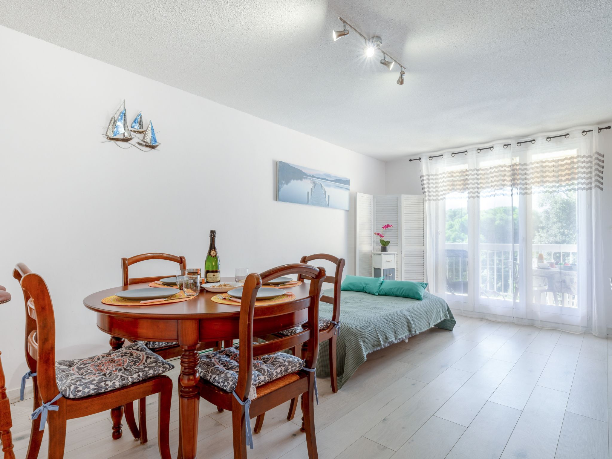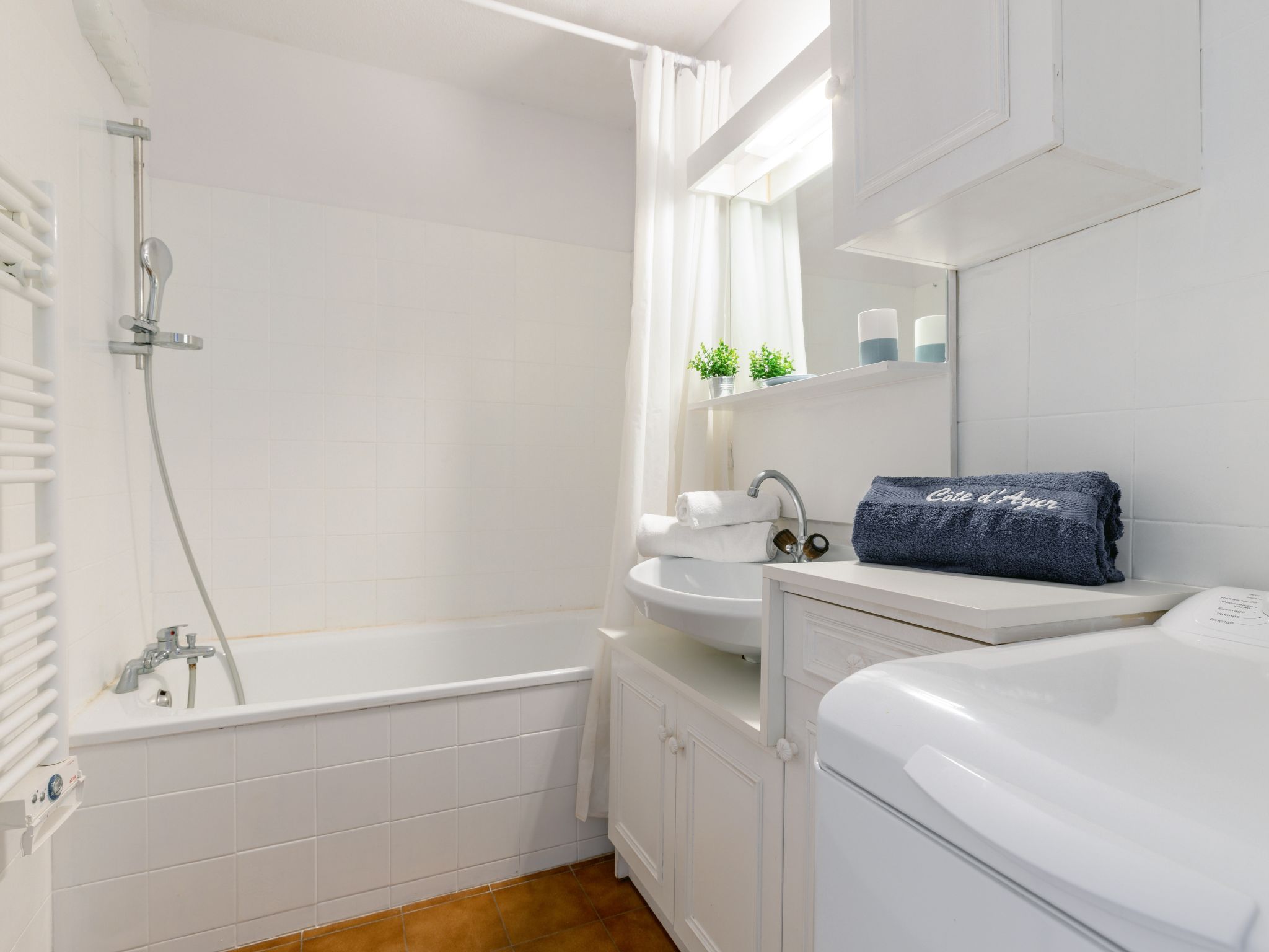 2-room apartment 41 m2 on 2nd floor. Comfortable furnishings: living/dining room with 1 double sofabed (1 x 140 cm, length 190 cm), TV (flat screen), DVD. Exit to the balcony. 1 room with 1 french bed (1 x 140 cm, length 190 cm). Open kitchen (dishwasher, 3 induction hot plates, toaster, kettle, freezer, electric coffee machine, Capsules for coffee machine (Senseo) extra, combination microwave). Bathroom, sep. WC. Heating. Balcony 6 m2. Balcony furniture, electric barbecue, deck chairs (2). Facilities: washing machine, iron, hair dryer. Internet (WiFi, free). Garage space n 7375 (1 car) at 200 m. Please note: smoke alarm, no lift.