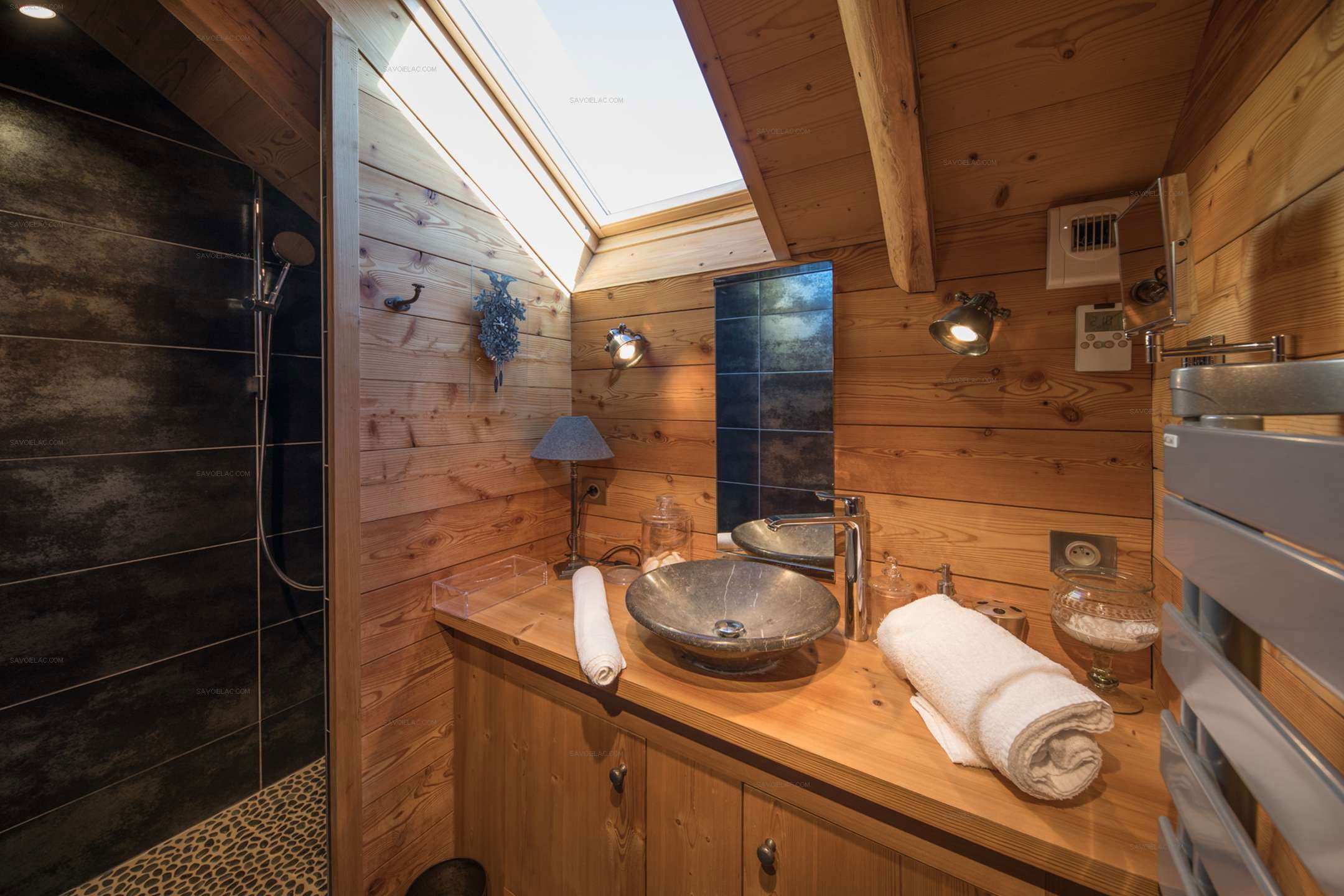 Bathroom 2: Ensuite with bedroom 1, shower, sink, towel dryer.