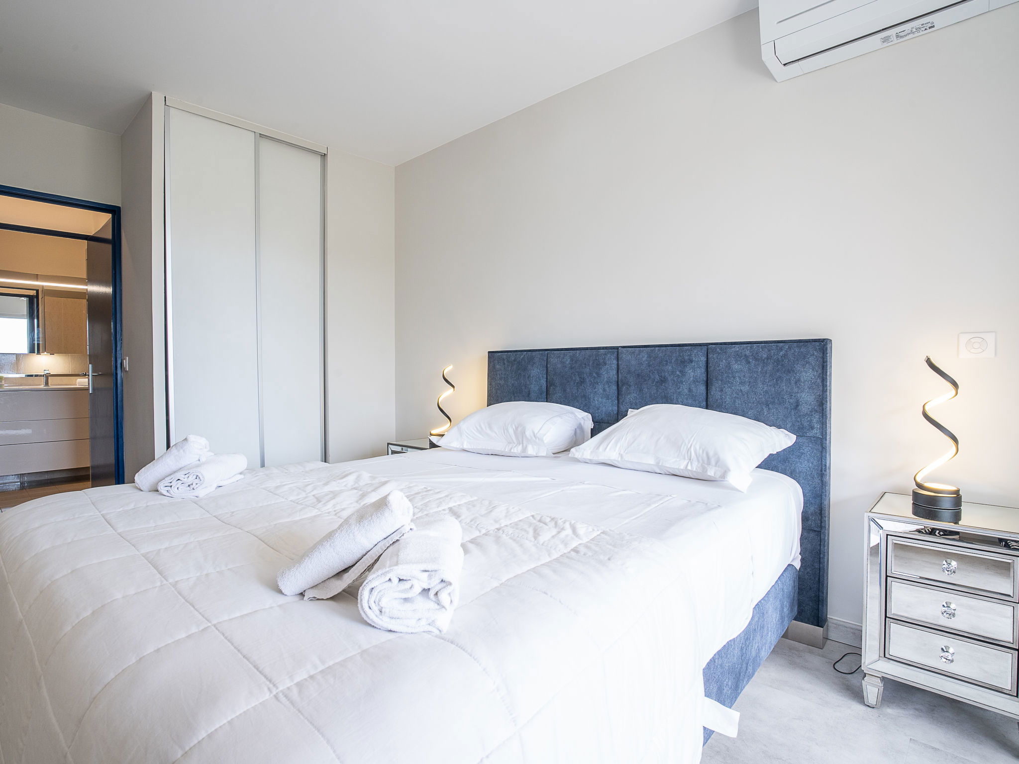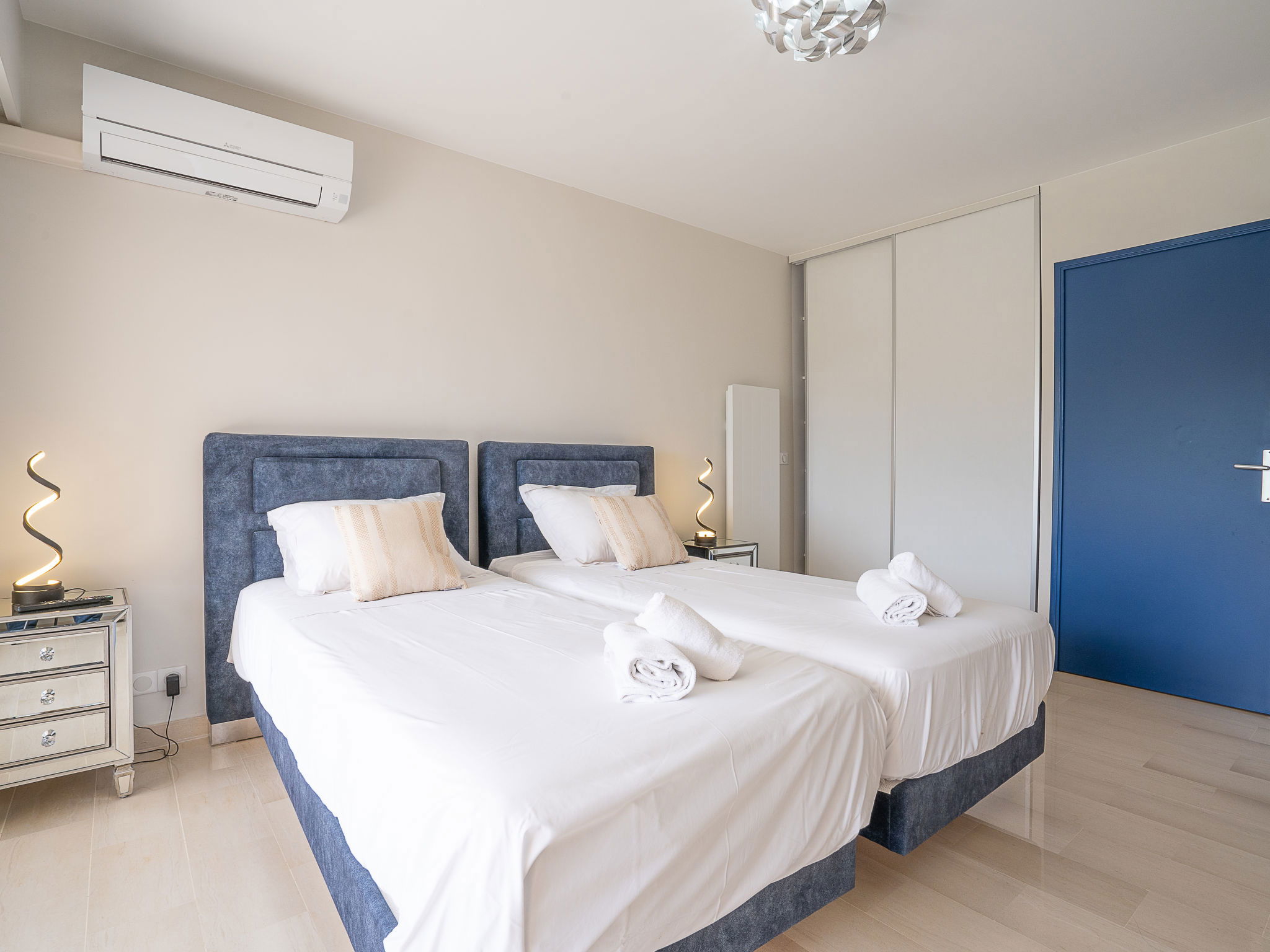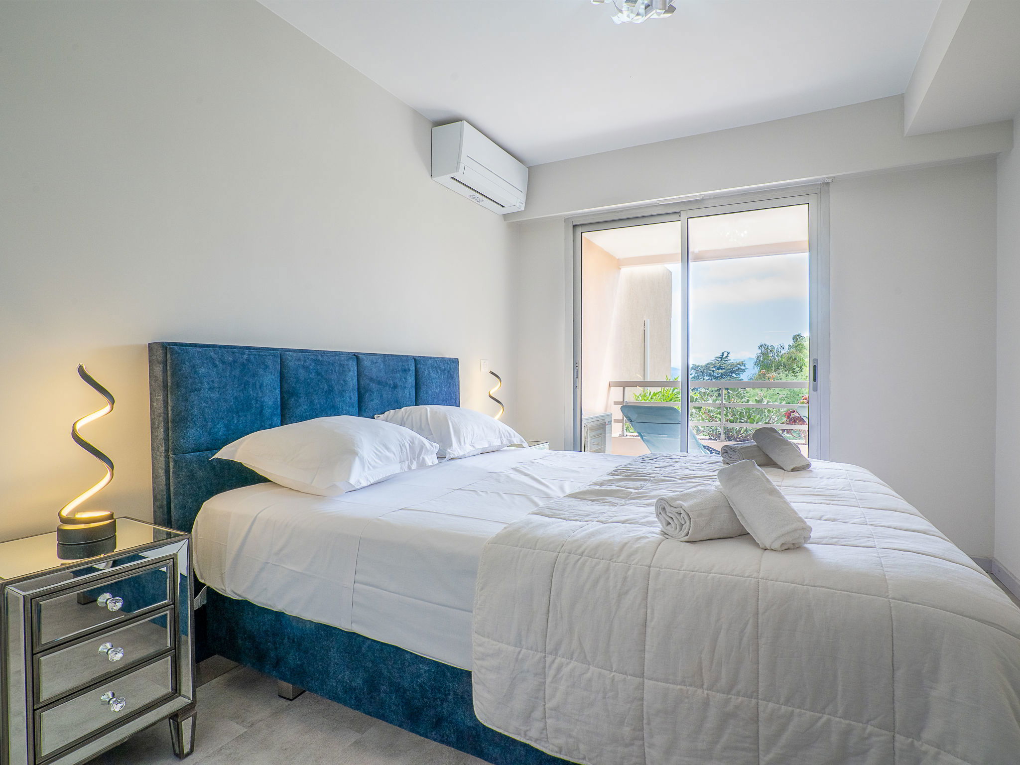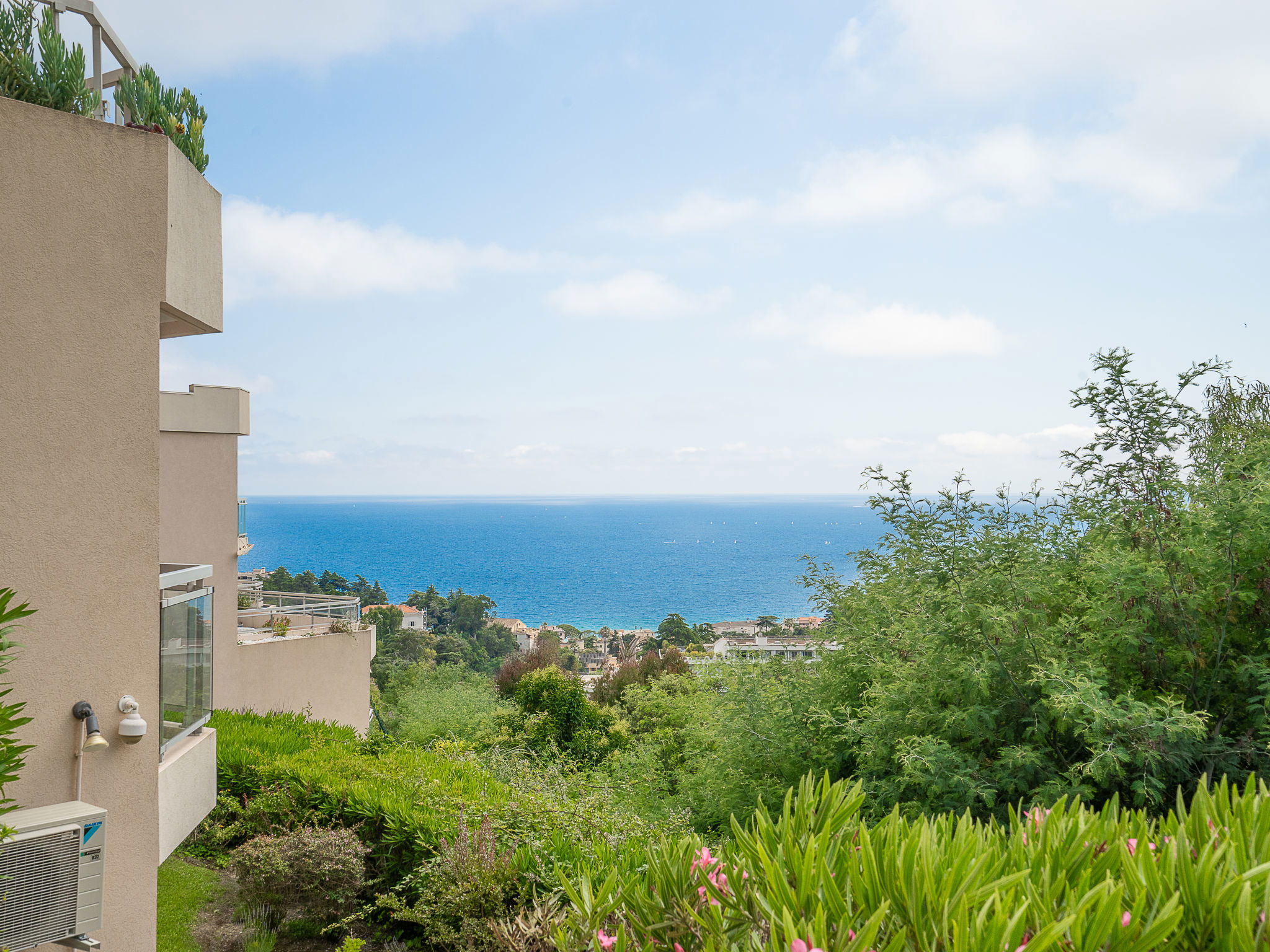 3-room apartment 75 m2, on the ground floor. Fully renovated in 2021, comfortable and beautiful furnishings: living/dining room with TV (flat screen). Exit to the terrace. 1 room with 1 double bed (2 x 90 cm, length 200 cm), shower/WC, TV and air conditioning. Exit to the terrace. 1 room with 1 french bed (1 x 160 cm, length 200 cm), air conditioning. Exit to the terrace. Open kitchen (oven, dishwasher, 3 induction hot plates, toaster, kettle, microwave, freezer, electric coffee machine, Capsules for coffee machine (Senseo) extra). Exit to the terrace. Bathroom, sep. WC. Electric heating. Terrace 8 m2, south facing position terrace 17 m2, south facing position. Terrace furniture. Very beautiful view of the sea. Facilities: washing machine. Internet (WiFi, free). Reserved parking space n 96 (roofed). Please note: not suitable for small children. Non-smoking house. Smoke alarm. 06029022720AK
