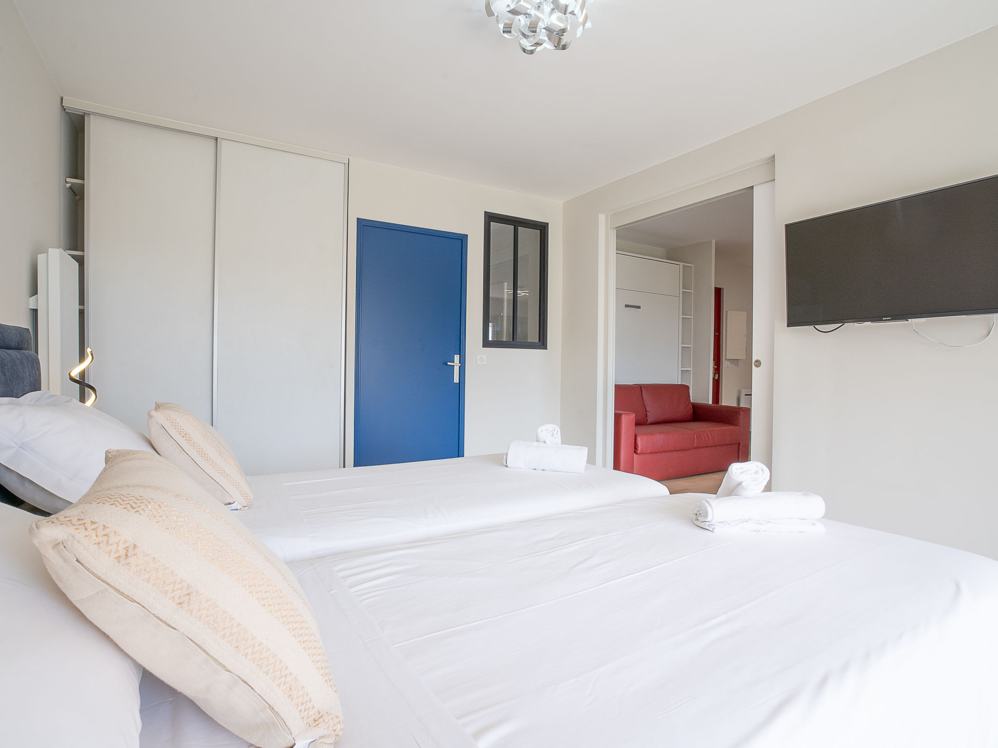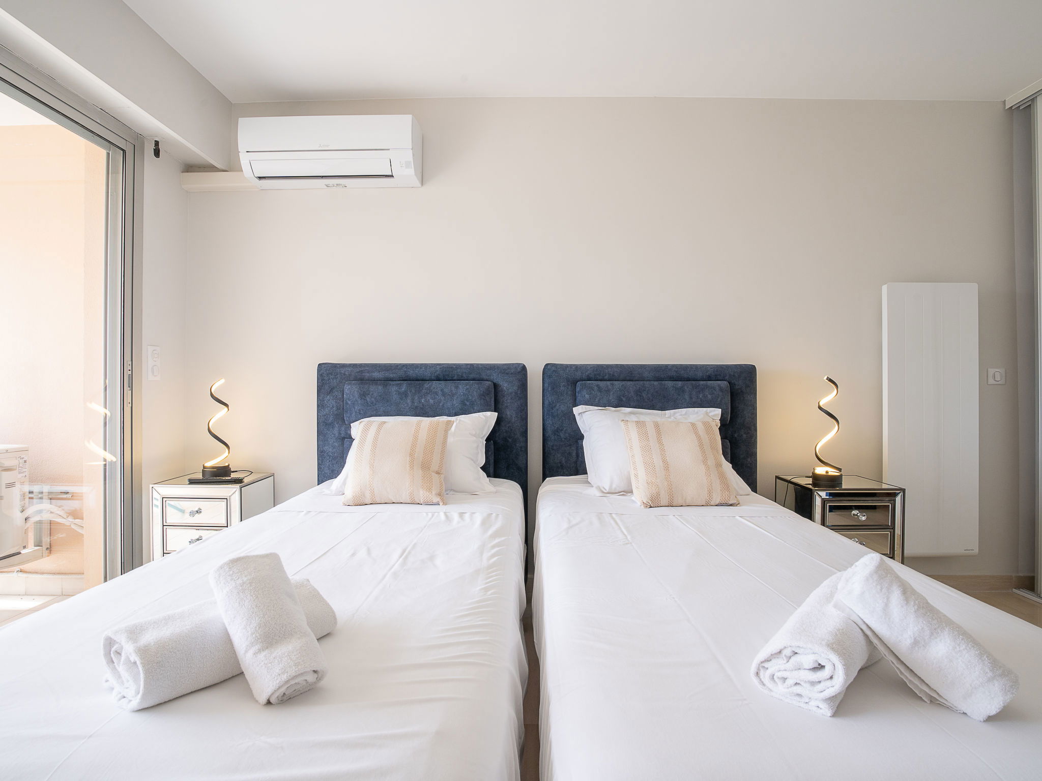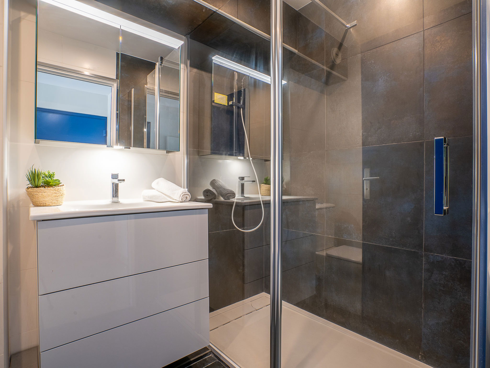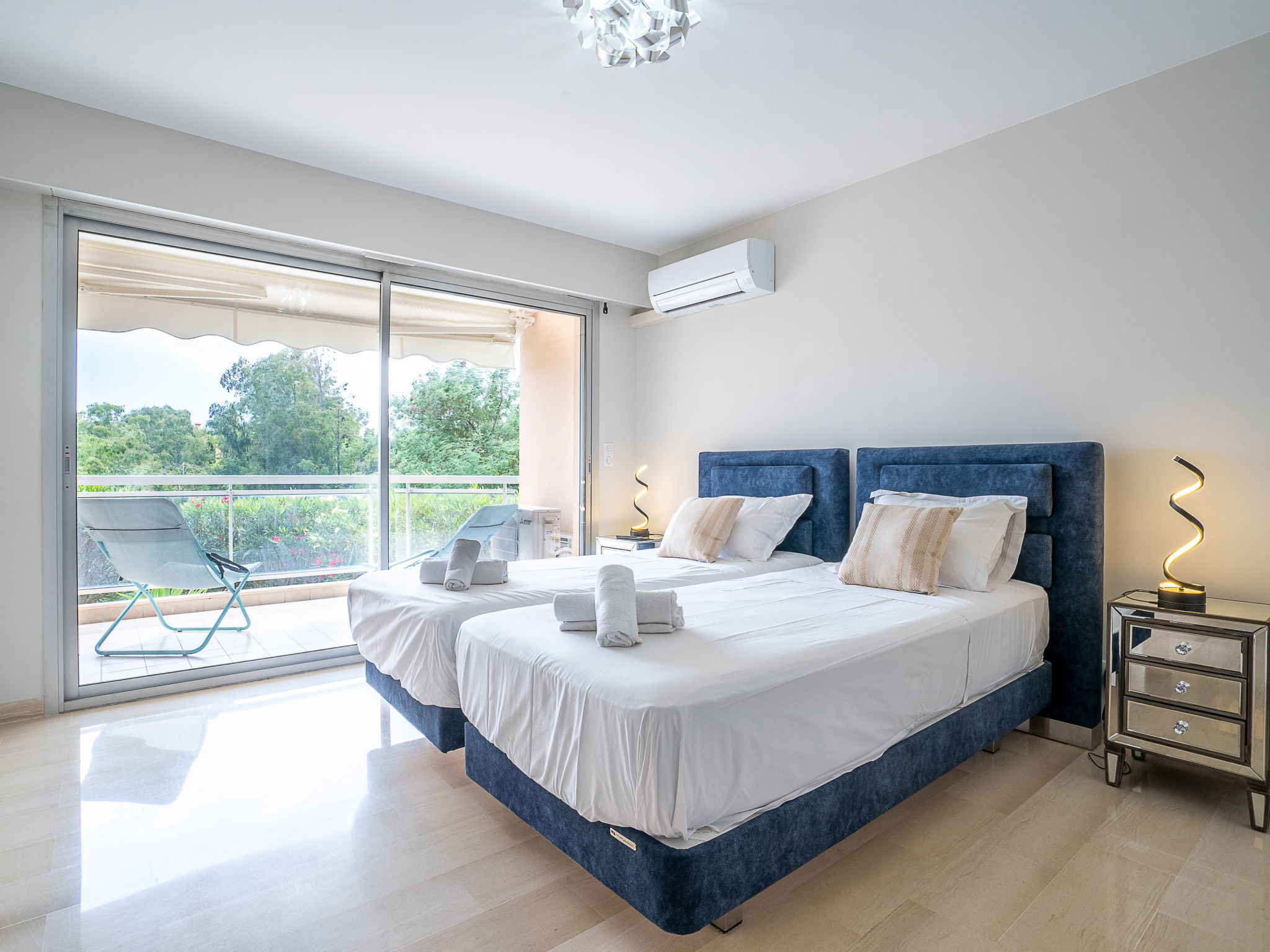 3-room apartment 75 m2, on the ground floor. Fully renovated in 2021, comfortable and beautiful furnishings: living/dining room with TV (flat screen). Exit to the terrace. 1 room with 1 double bed (2 x 90 cm, length 200 cm), shower/WC, TV and air conditioning. Exit to the terrace. 1 room with 1 french bed (1 x 160 cm, length 200 cm), air conditioning. Exit to the terrace. Open kitchen (oven, dishwasher, 3 induction hot plates, toaster, kettle, microwave, freezer, electric coffee machine, Capsules for coffee machine (Senseo) extra). Exit to the terrace. Bathroom, sep. WC. Electric heating. Terrace 8 m2, south facing position terrace 17 m2, south facing position. Terrace furniture. Very beautiful view of the sea. Facilities: washing machine. Internet (WiFi, free). Reserved parking space n 96 (roofed). Please note: not suitable for small children. Non-smoking house. Smoke alarm. 06029022720AK