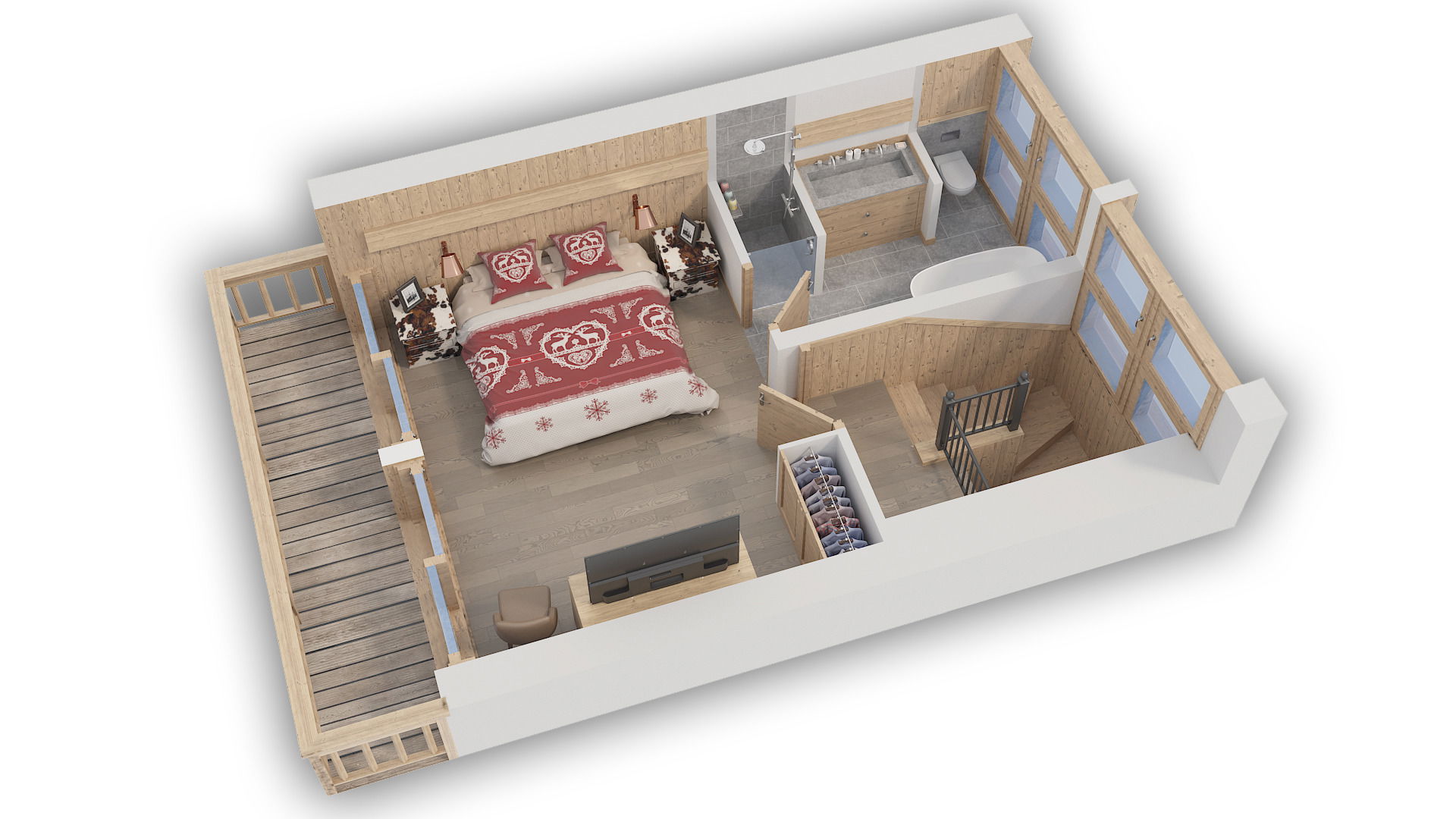 - Bedroom 5 : Master en-suite double (180x200) with West facing balcony, shower, bath tub , toilet and TV