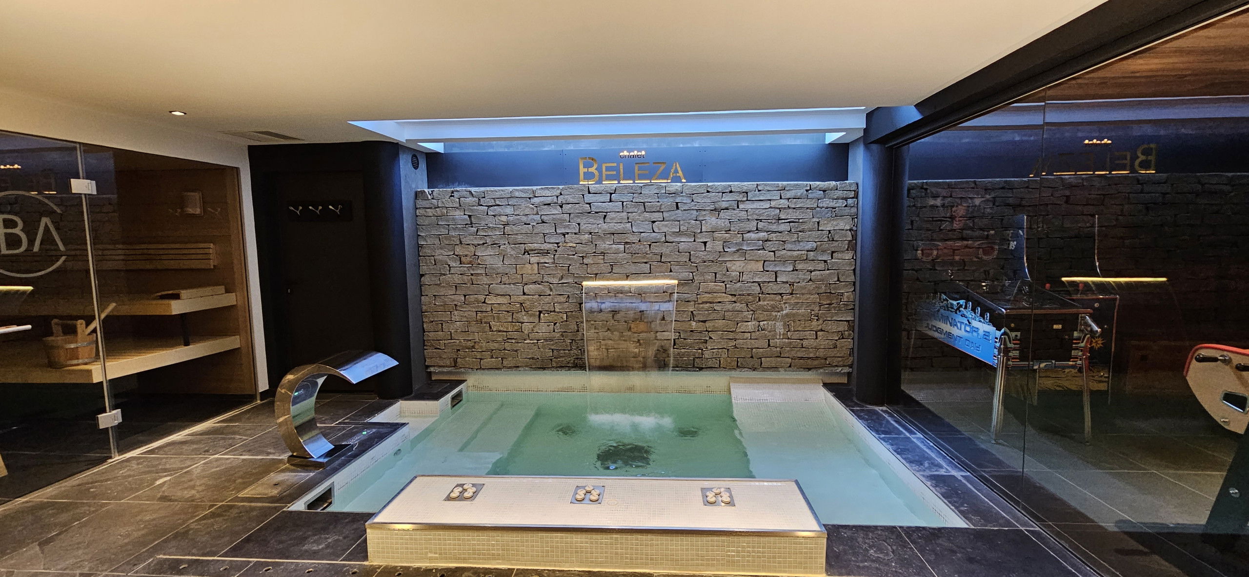 Chalet has a spacious cinema area, arcade games, pinball and table football, but also a SPA with modern glass-enclosed sauna, jacuzzi and hammam.