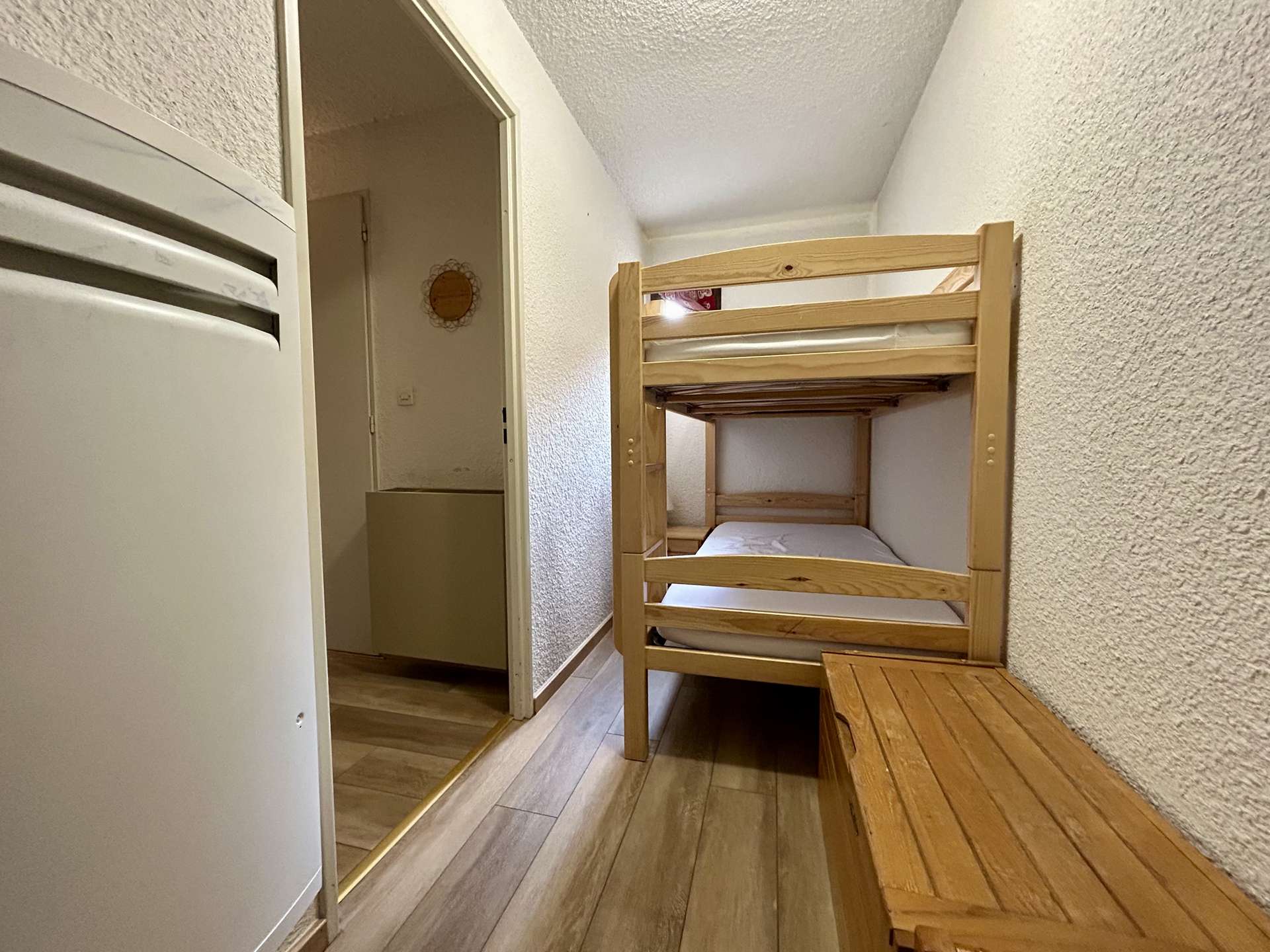 This studio for 4 people includes an alcove with 90 bunk beds, a living room with two 80 single beds and a television, a fully equipped kitchenette (dishwasher, microwave, oven, fridge, coffee maker), a bathroom and separate WC. Possibility to park your vehicle in the parking lot outside the residence.