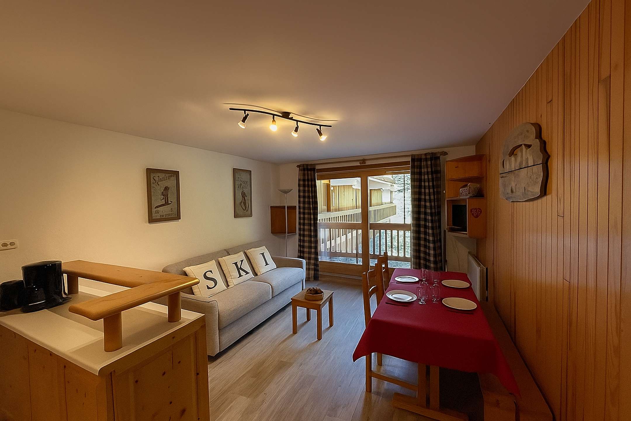 This apartment in the mountains located on the 2nd floor with lift, includes an alcove at the entrance level with 2 sets of bunk beds for 1 person, a bathroom and a separate toilet, an equipped kitchen open to the living room with a set of pull-out trundle beds, a television and a West-facing balcony. It is important to take the exterior passageway at the level of the 2nd floor in order to access the apartment on your right.