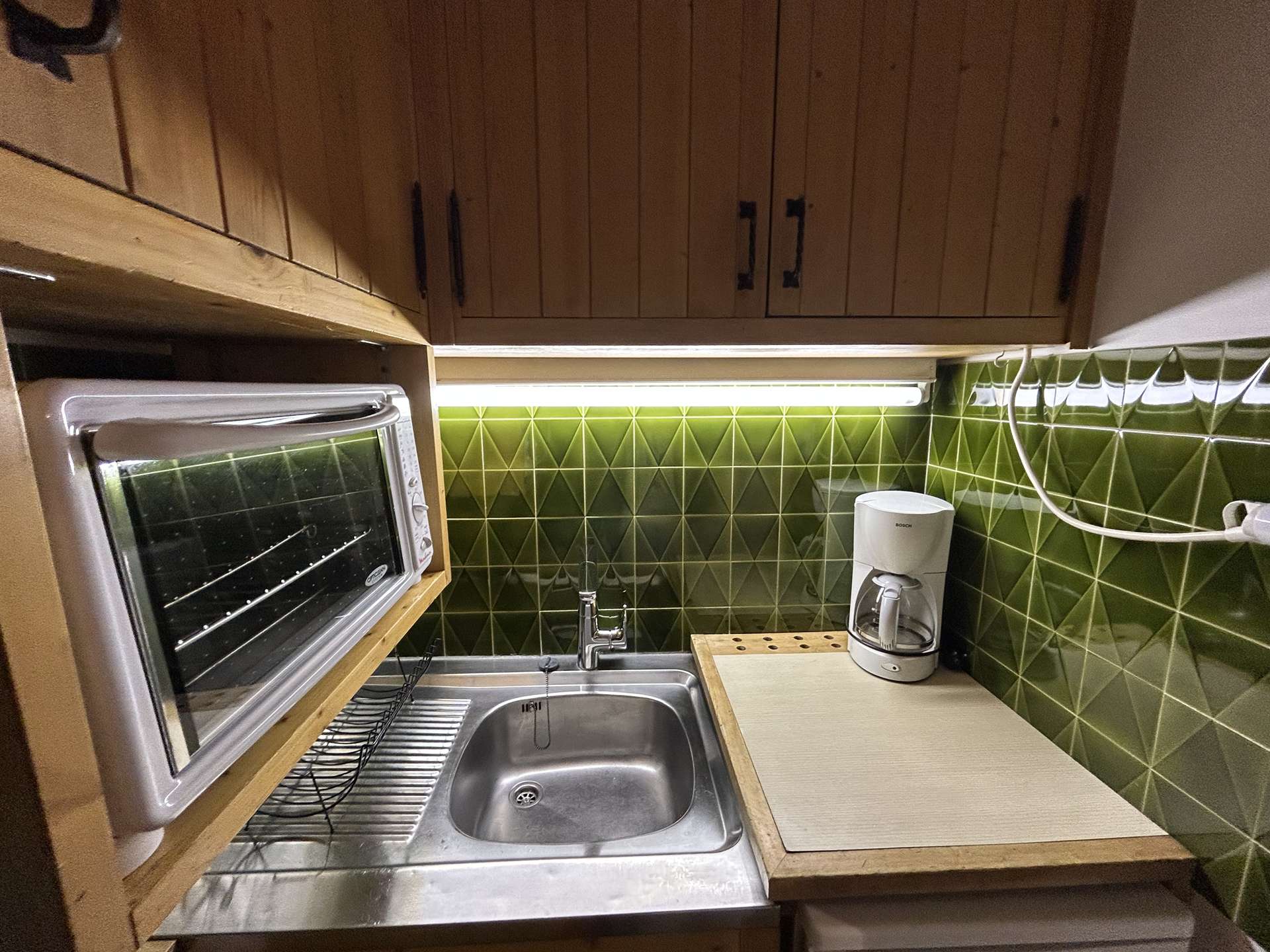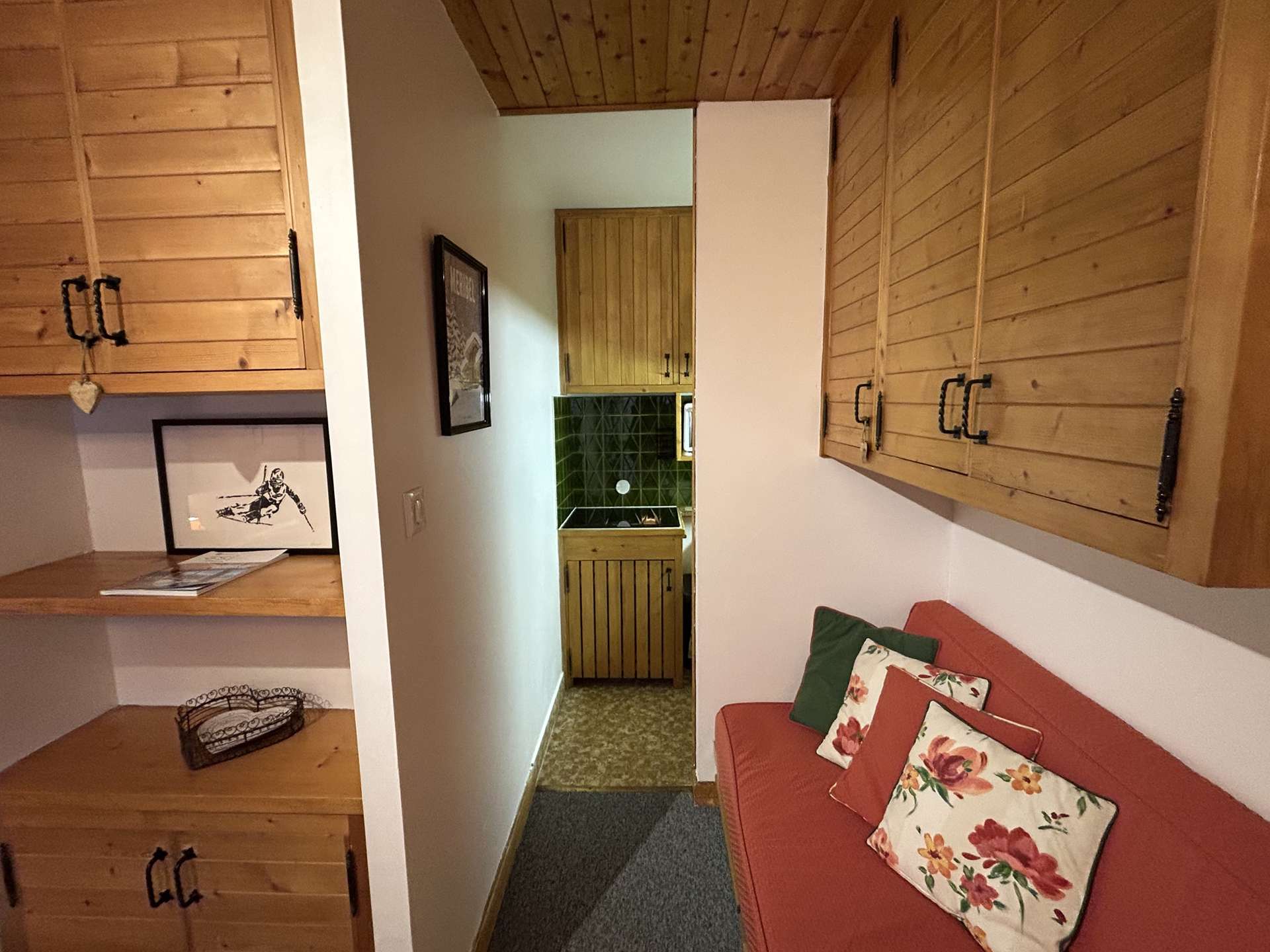 This Studio in the mountains, located on the ground floor, includes a living room with 2 single beds and a television, a small kitchen open to the living room with 4 electric hobs, an entrance with 2 single beds, a bathroom with bathtub "hoof" and a separate toilet.