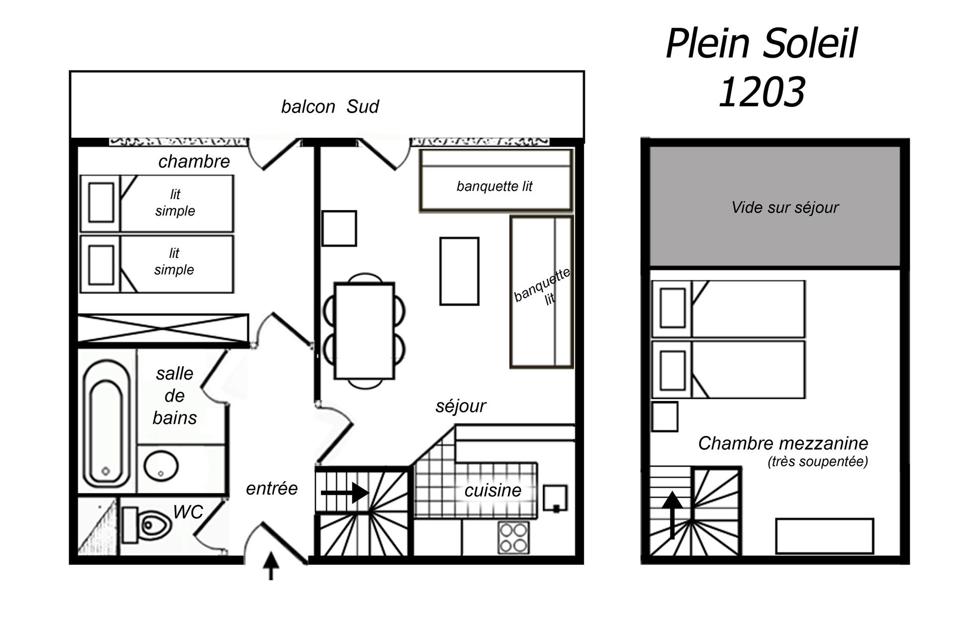 2 Rooms with mezzanine (loft), 6 persons, 45m², South Balcony