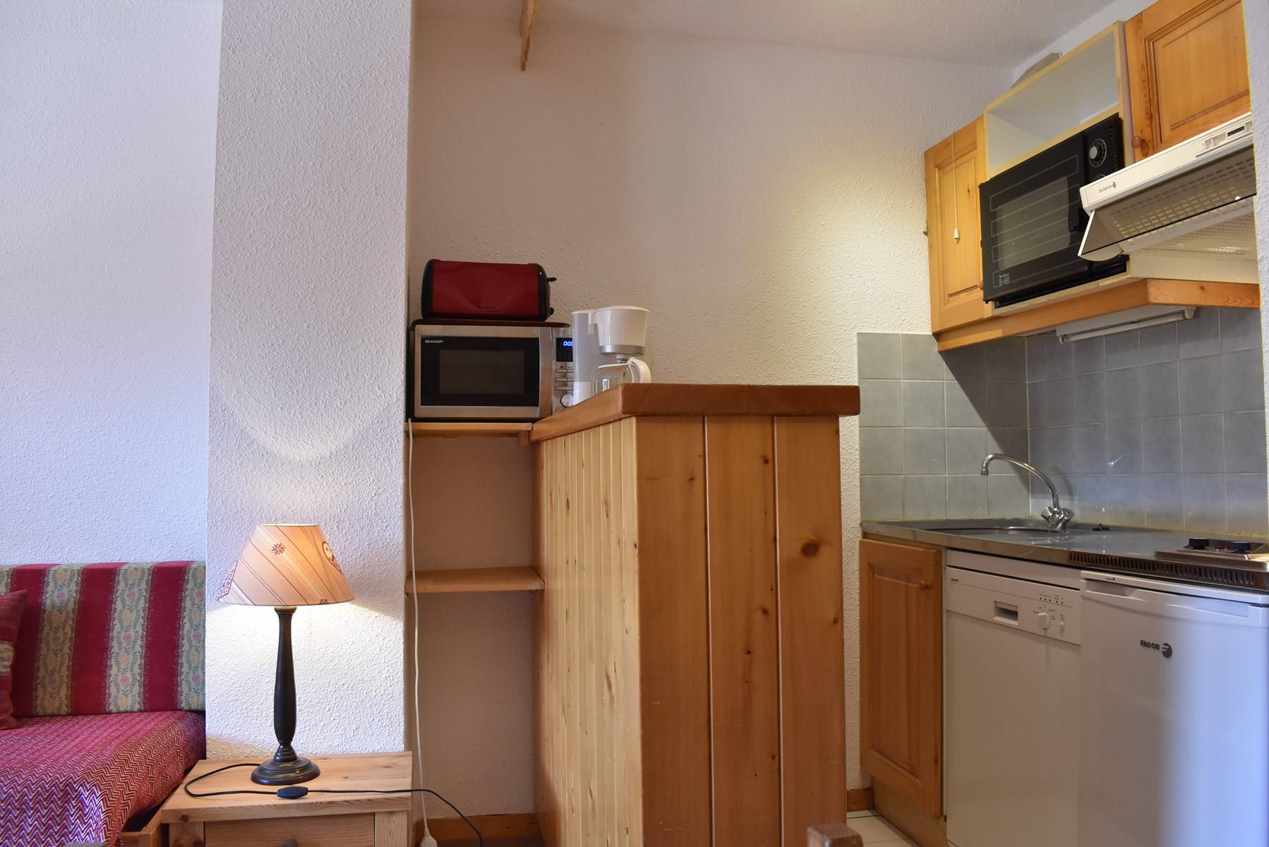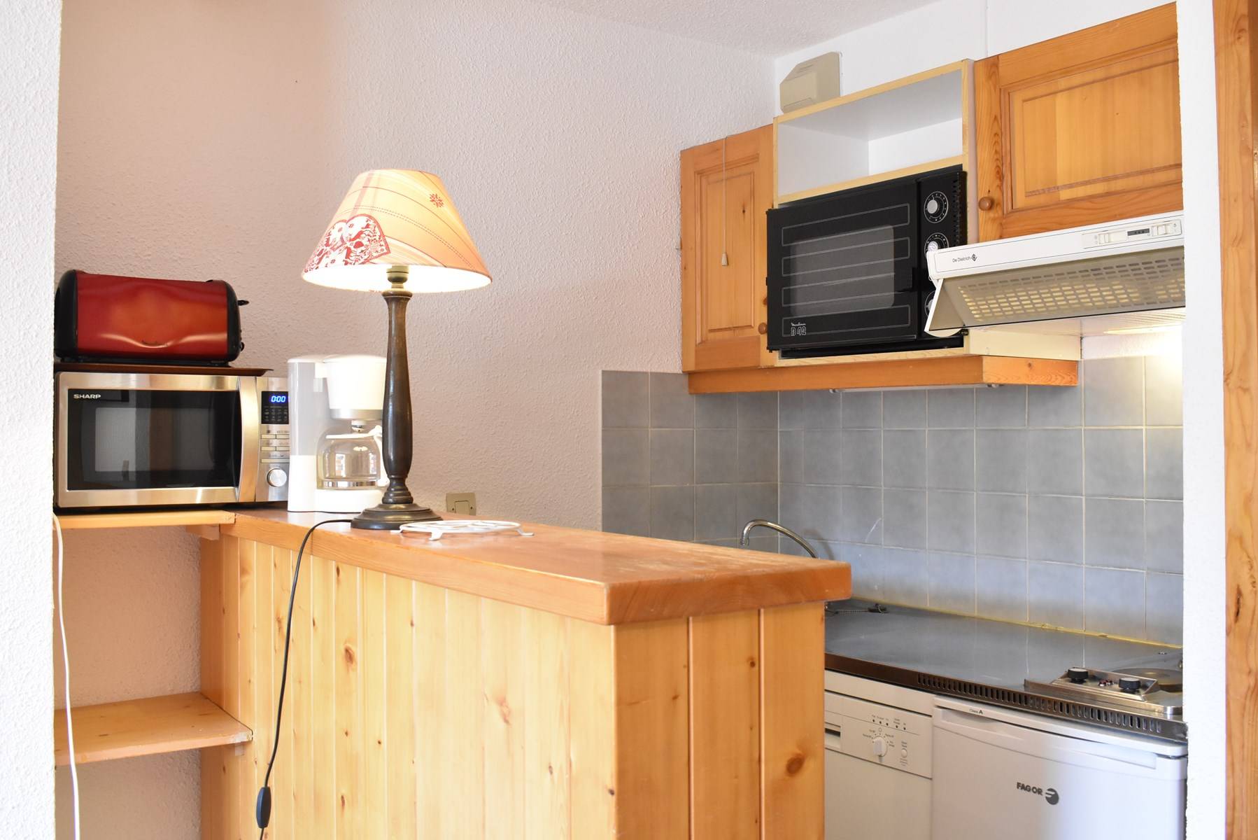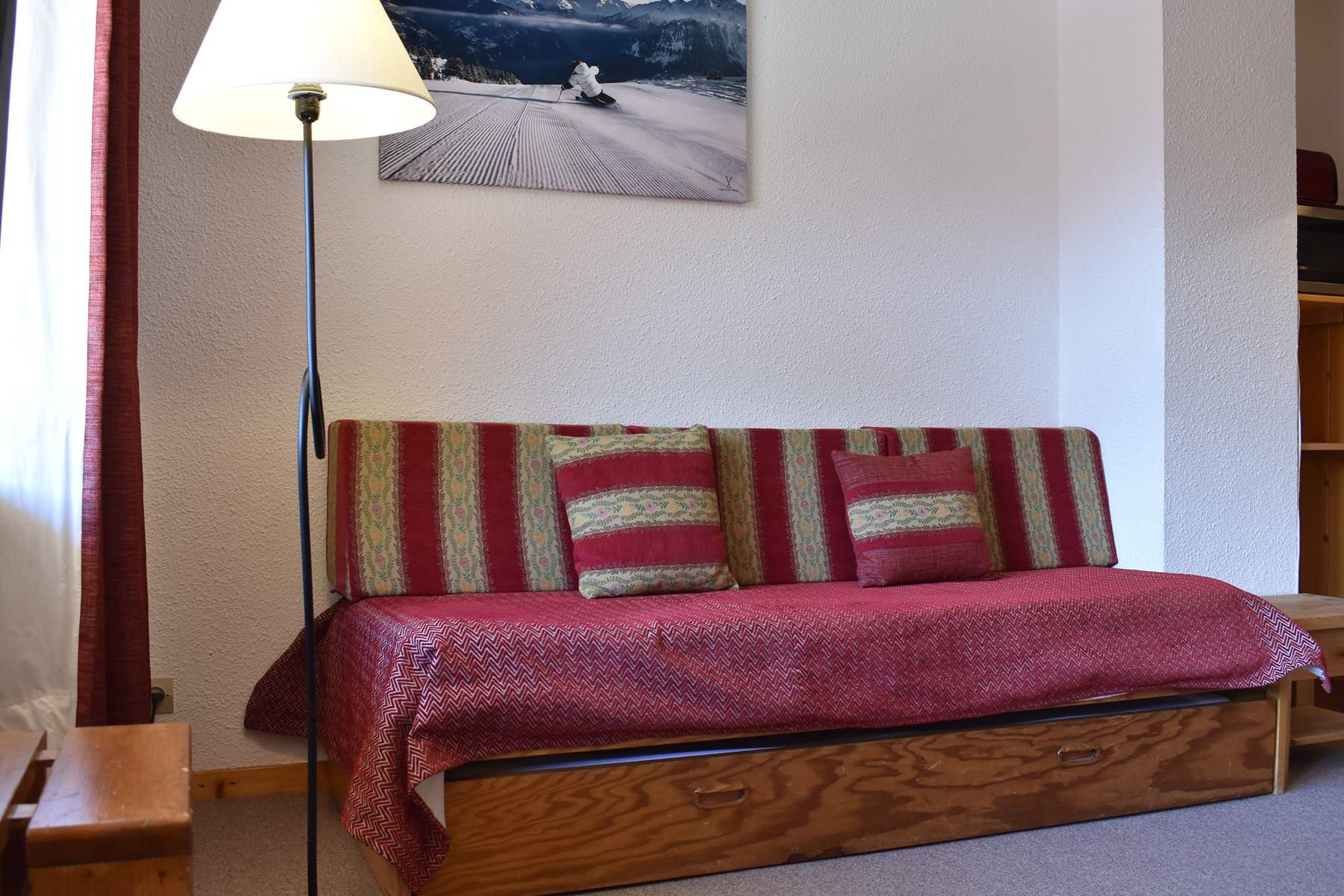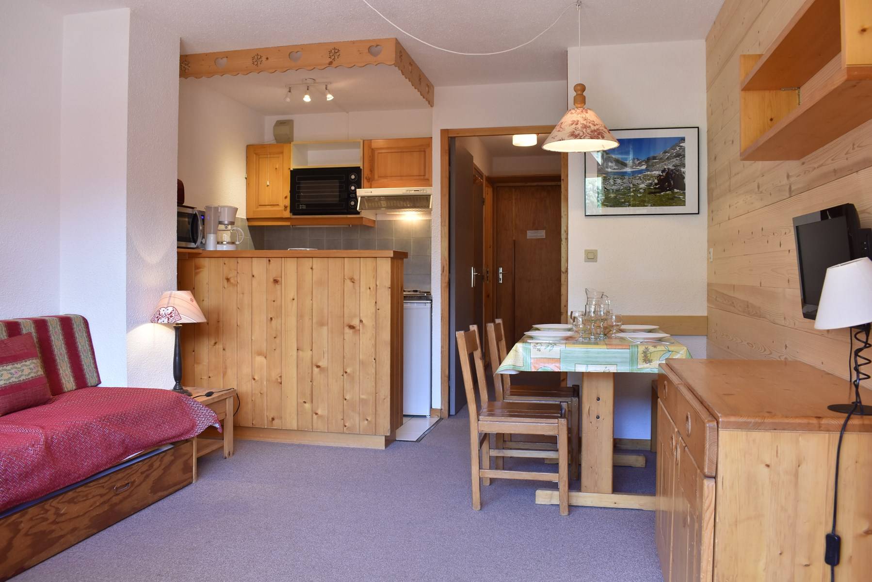 This studio apartment, located on the second floor without lift (entrance from the 4th floor) includes 1 living room with a set of pull-out trundle beds and television, an entrance with a set of bunk beds, 1 kitchen area equipped with a dishwasher, a shower room and a separate toilet as well as a ski locker at the entrance level.