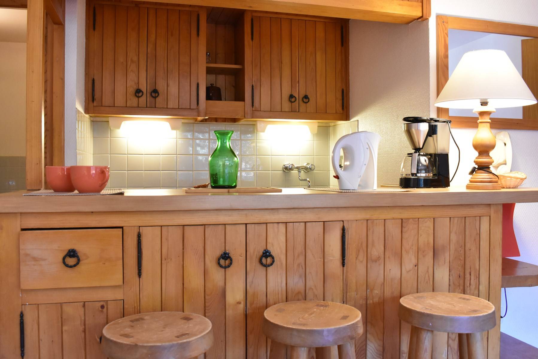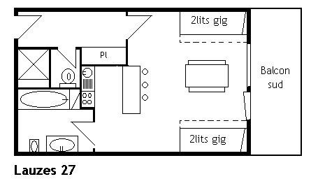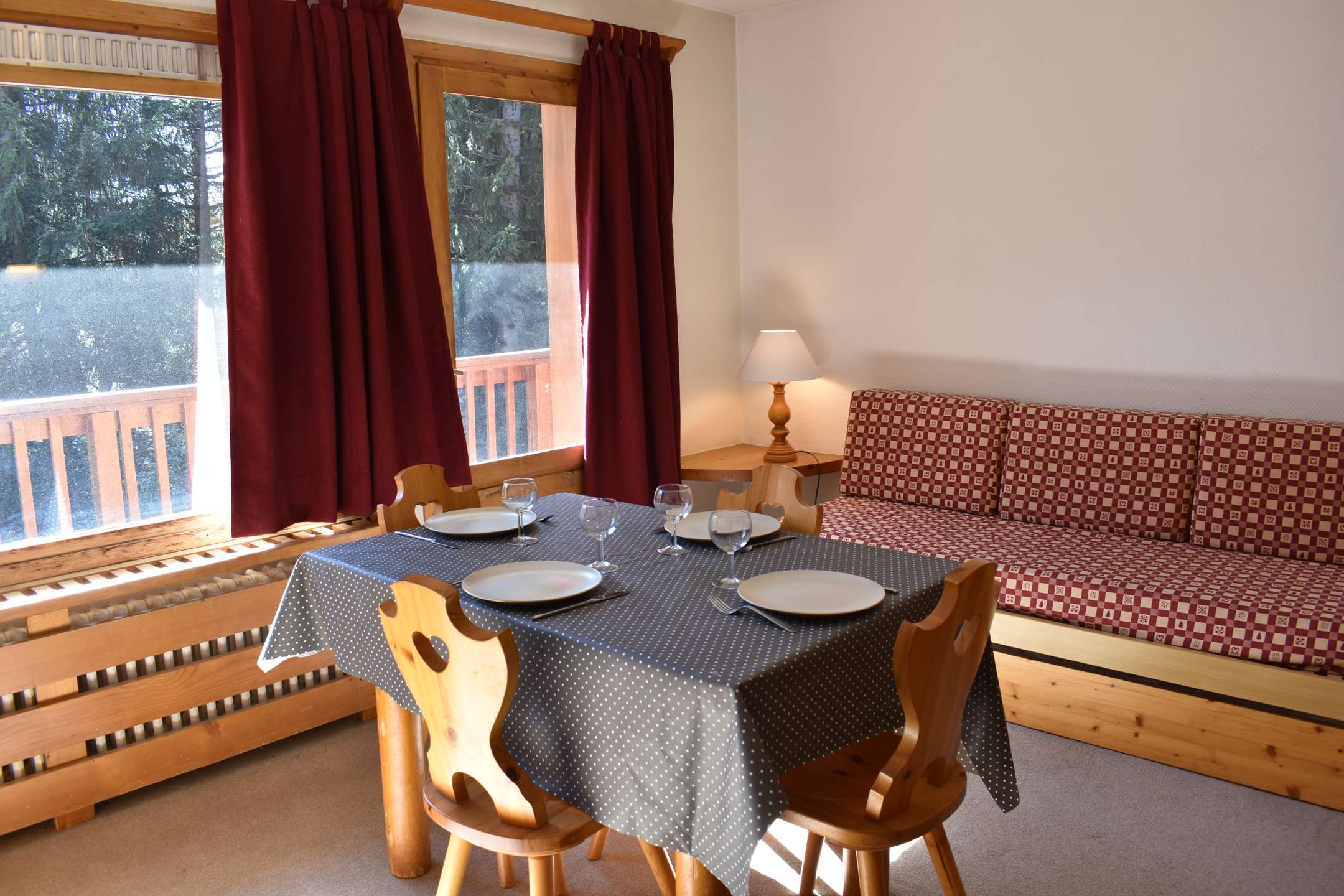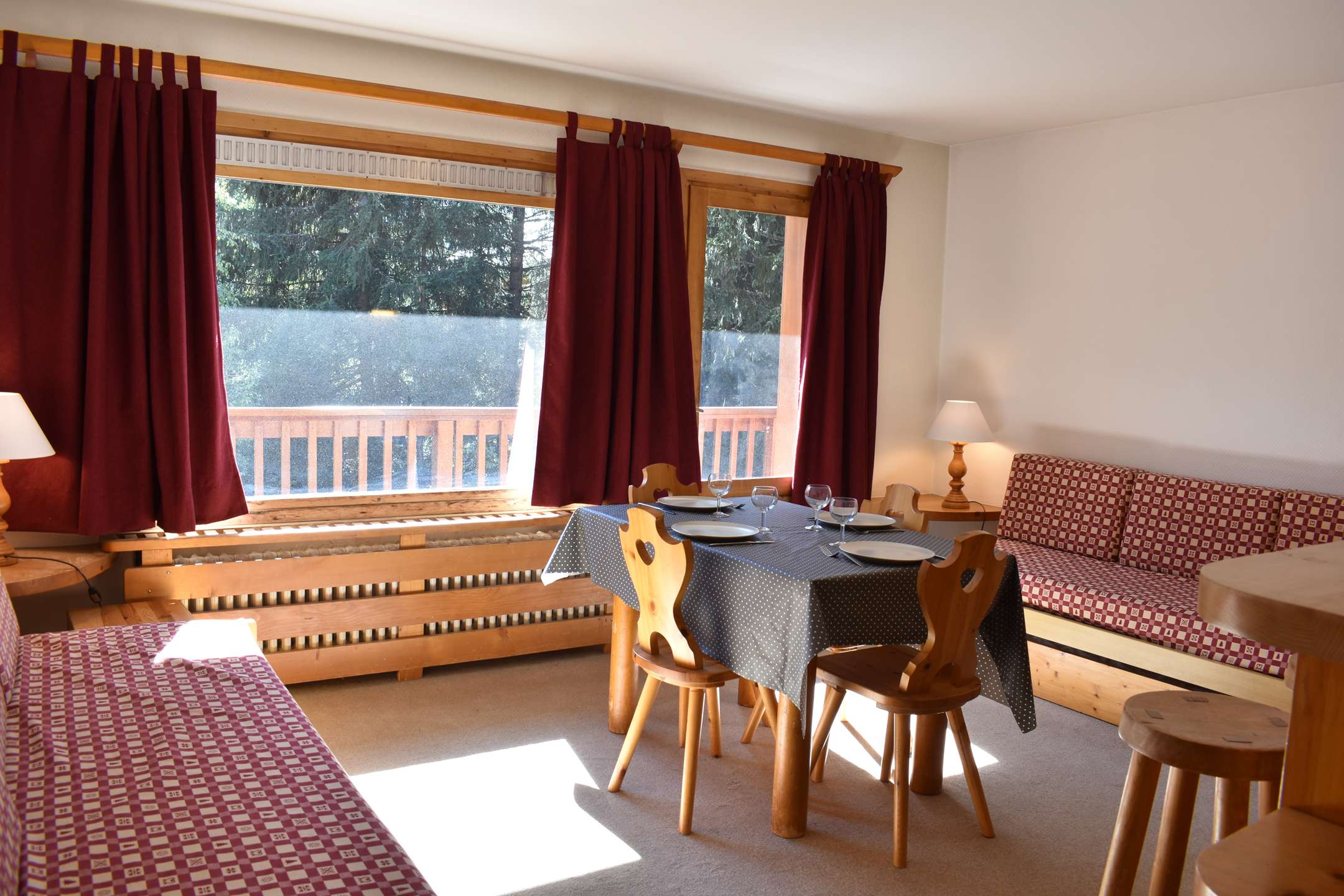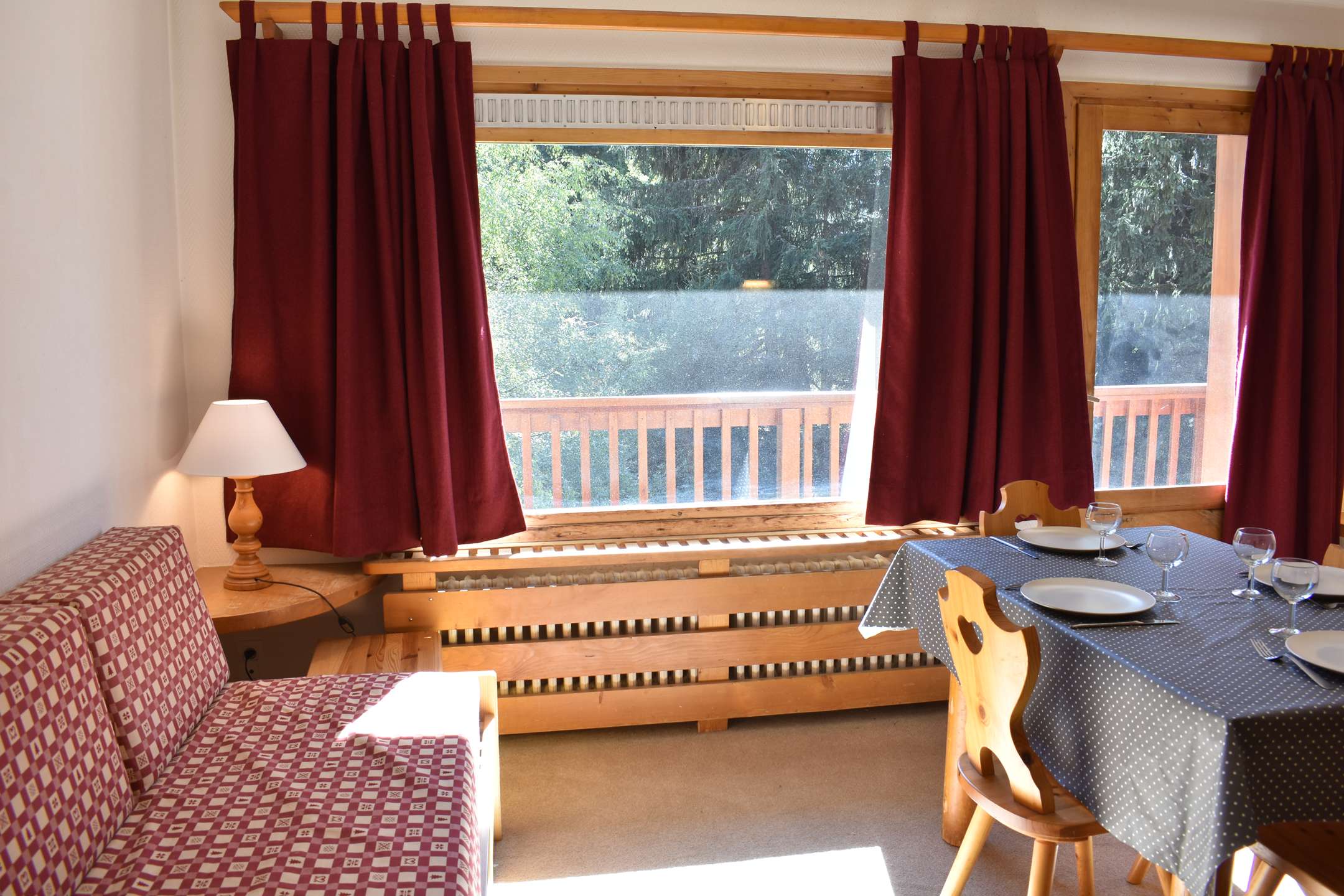 This studio apartment in the mountains located on the second floor by elevator (then go down 1/2 floor on foot) includes a living room (south-facing balcony) with two sets of pull-out pull-out beds, an equipped kitchen and a bathroom with separate WC. Access to shared ski storage.