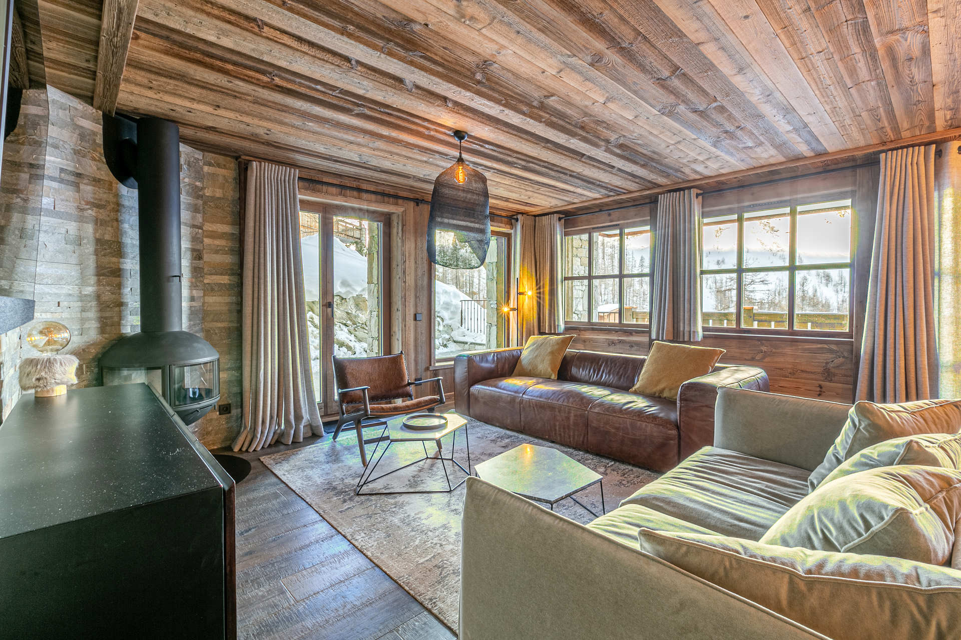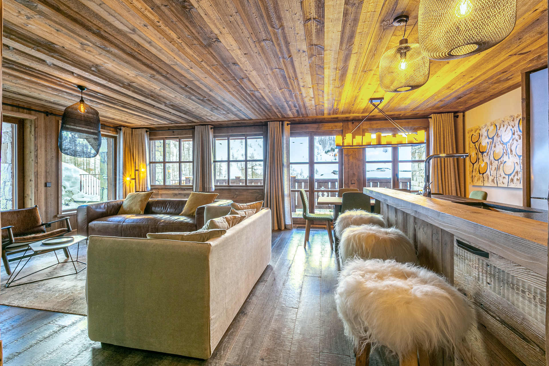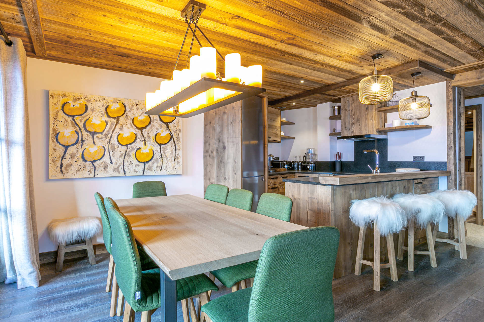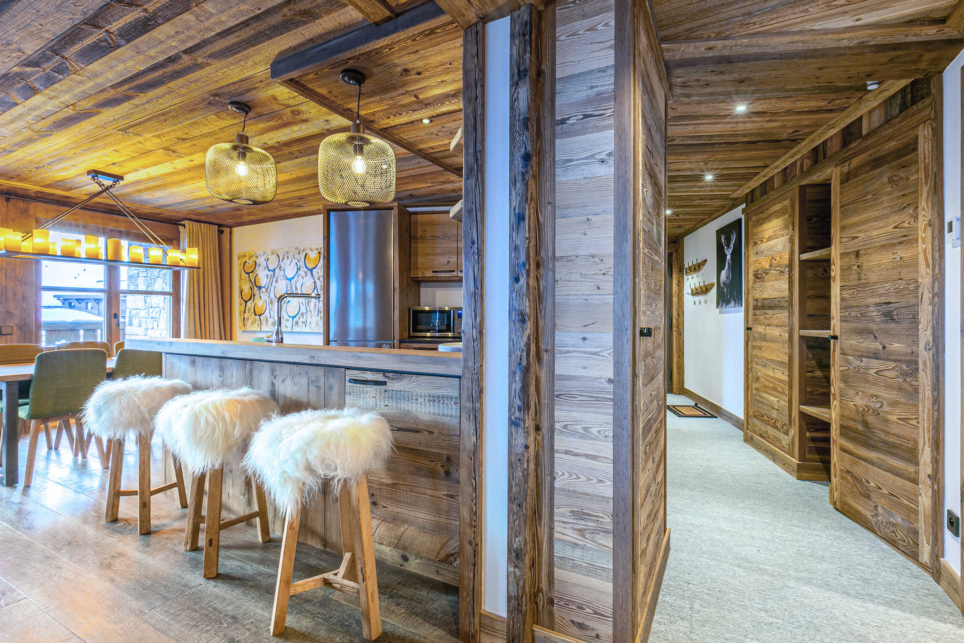 Interior of character combining contemporary decoration with an authentic Savoyard touch and warm architecture made of reclaimed timber and stone.