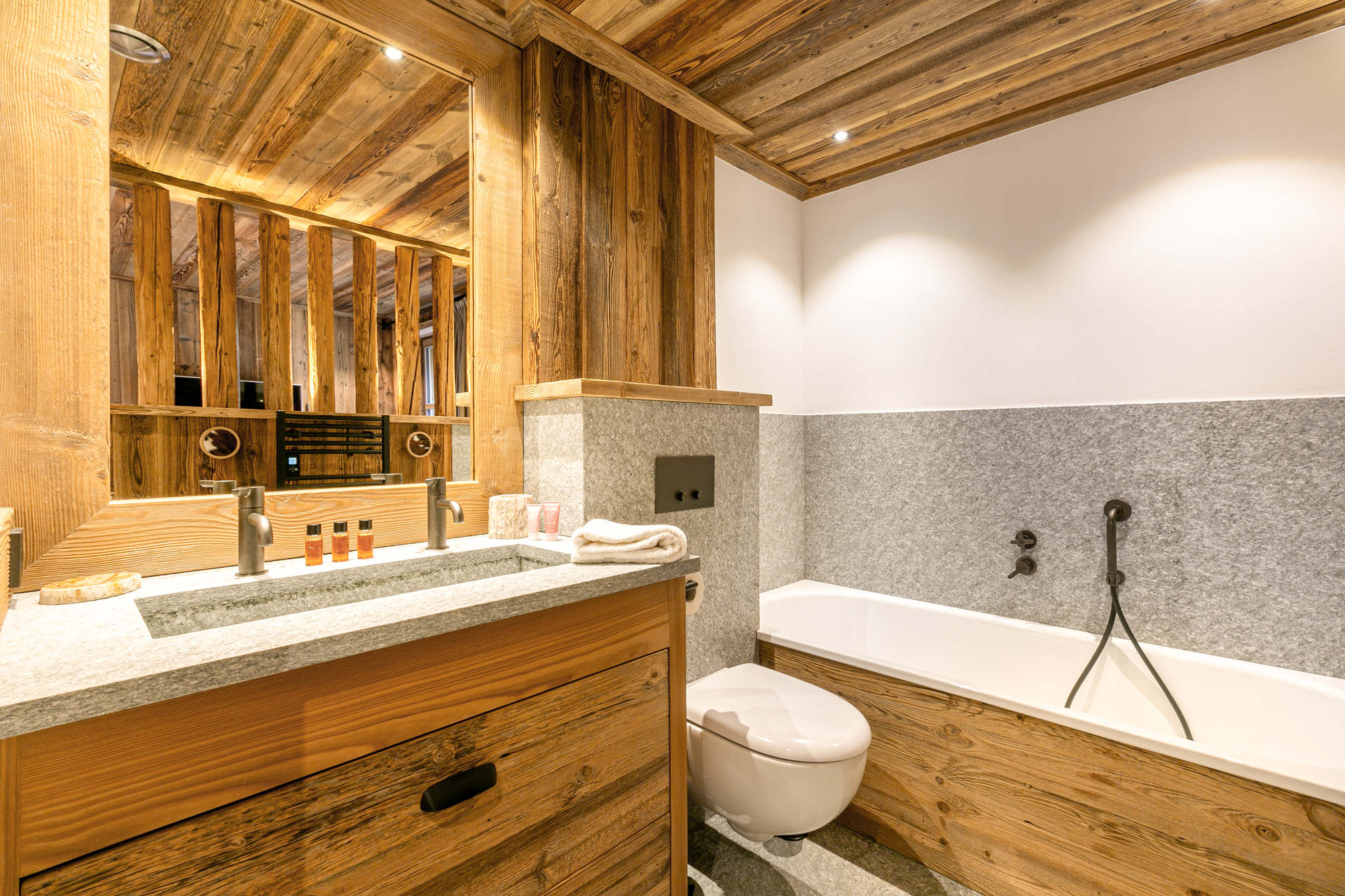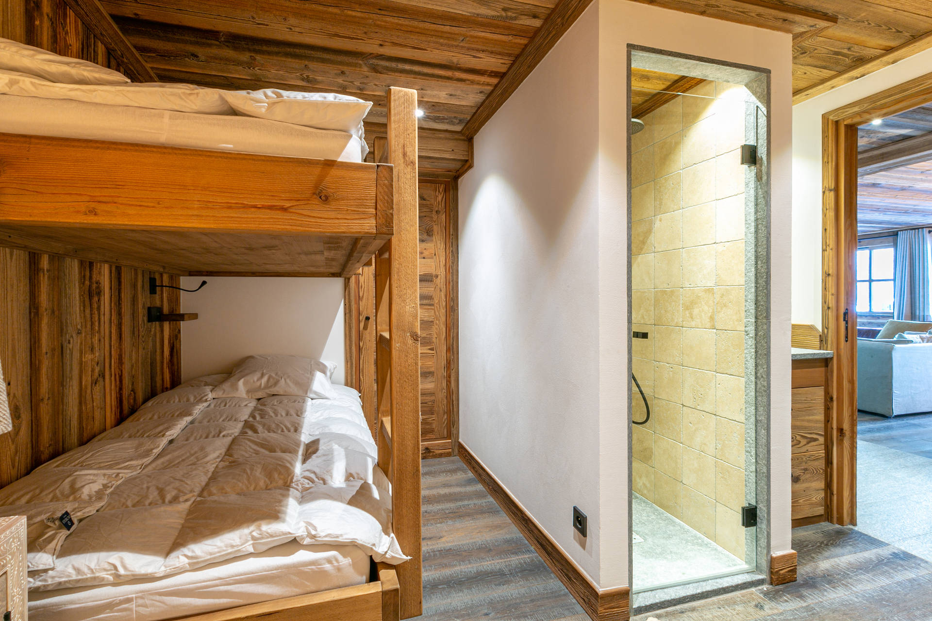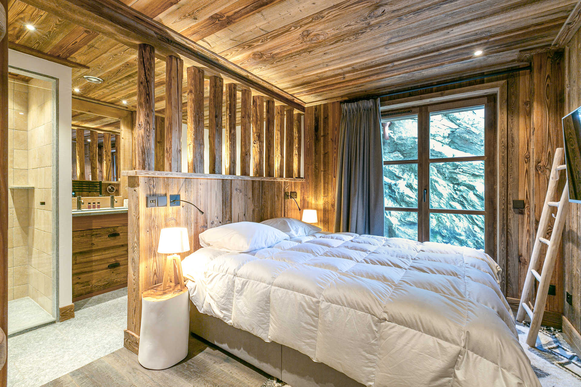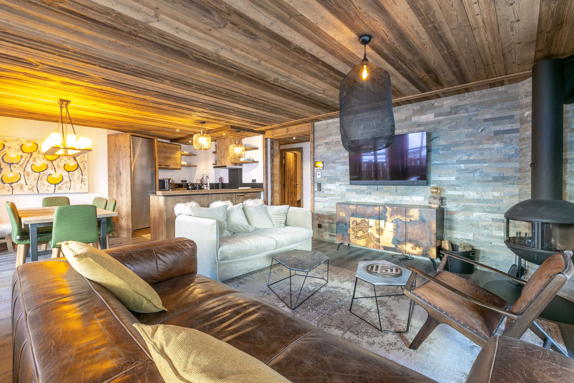 Interior of character combining contemporary decoration with an authentic Savoyard touch and warm architecture made of reclaimed timber and stone.