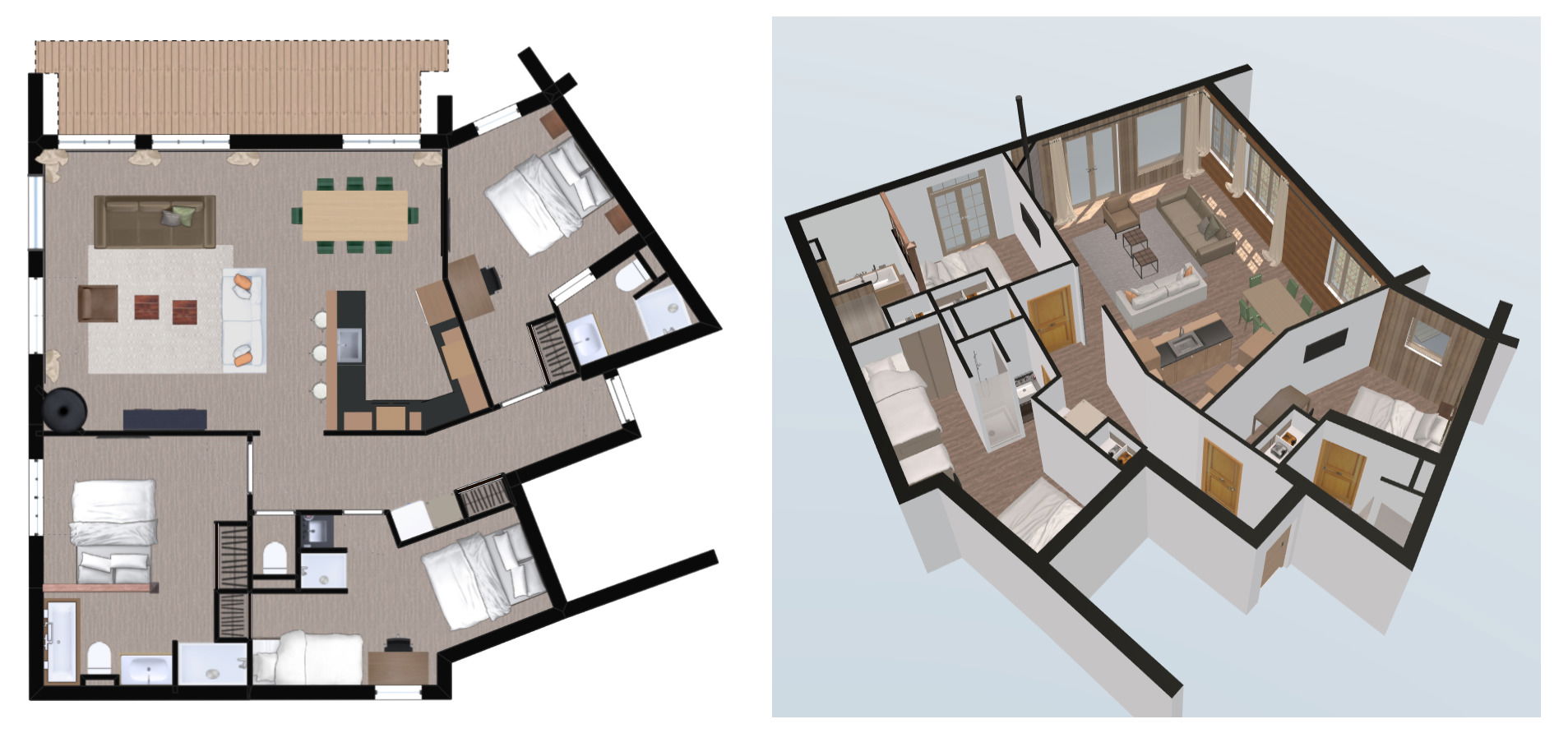 - 2 double beds