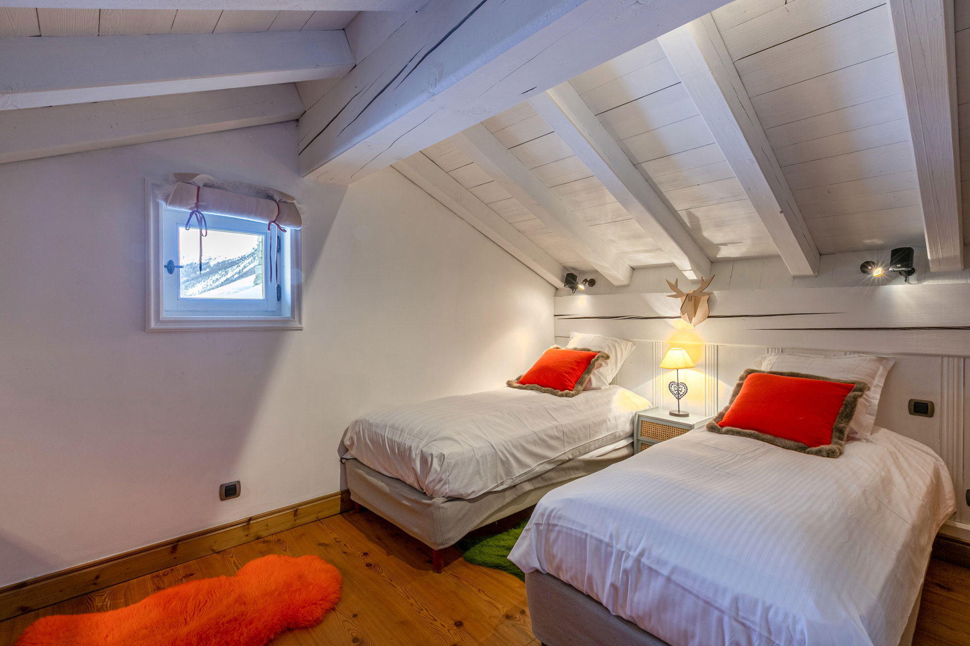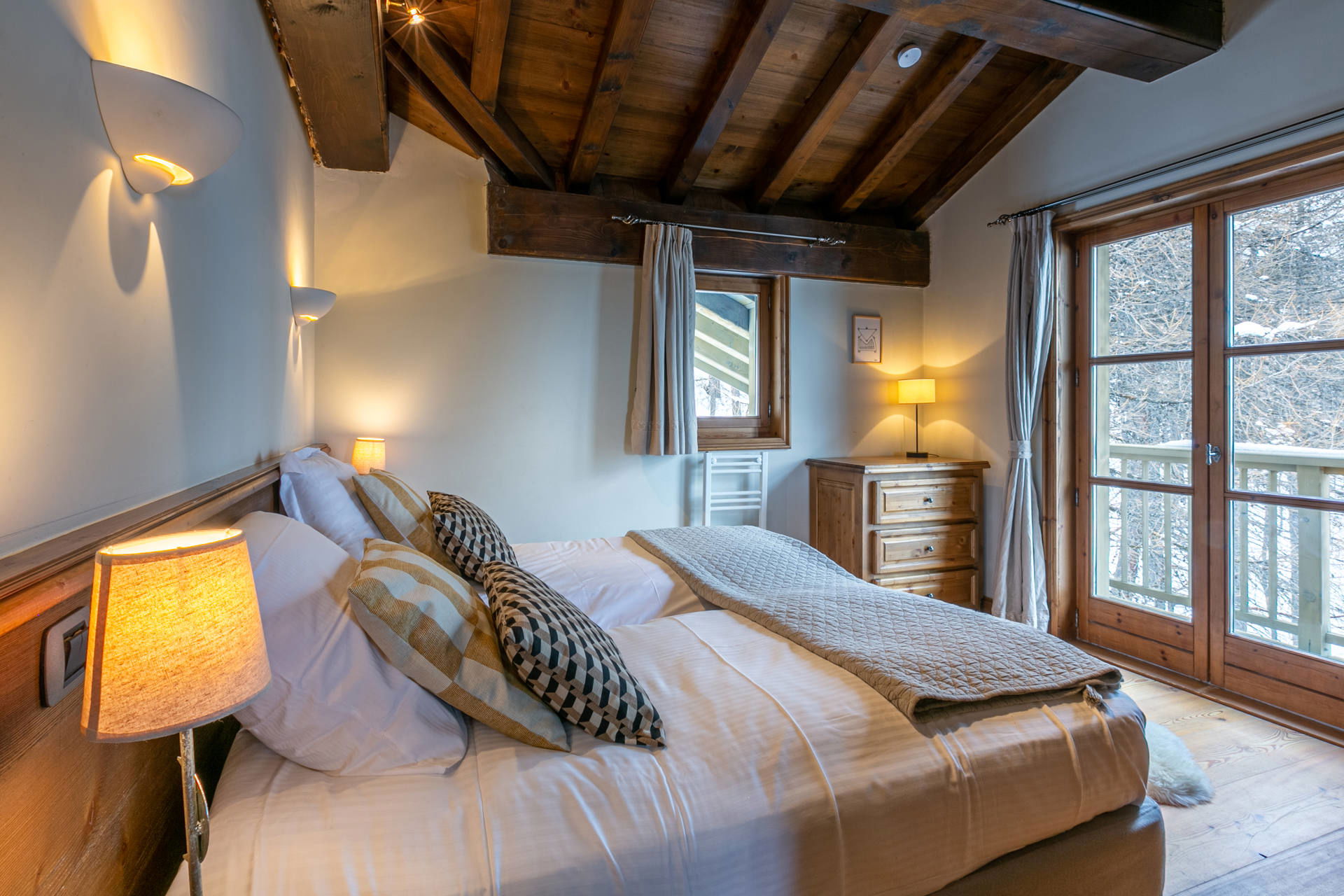 Located on the 4th floor of the chalet with South/East facing balconies and terraces with exceptional views of the village and the surrounding mountains.