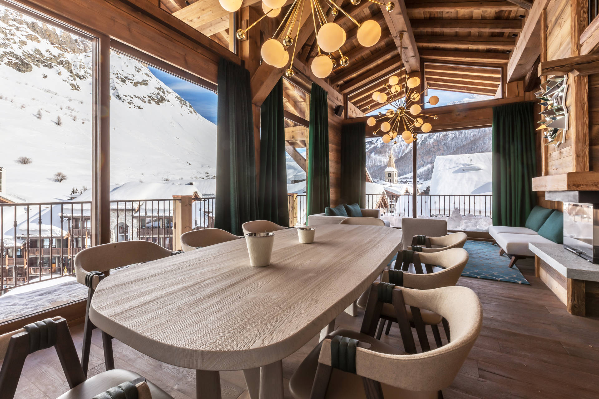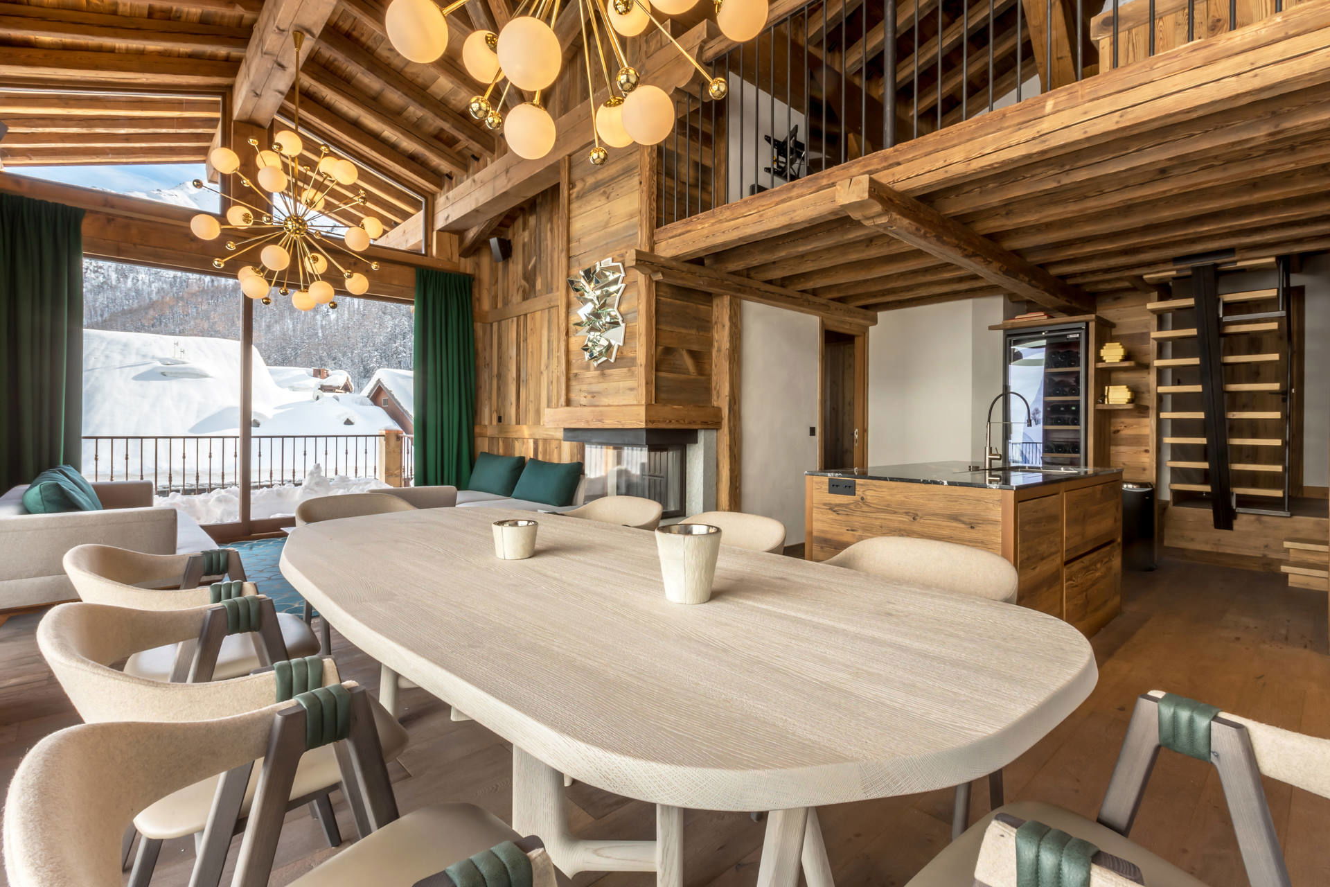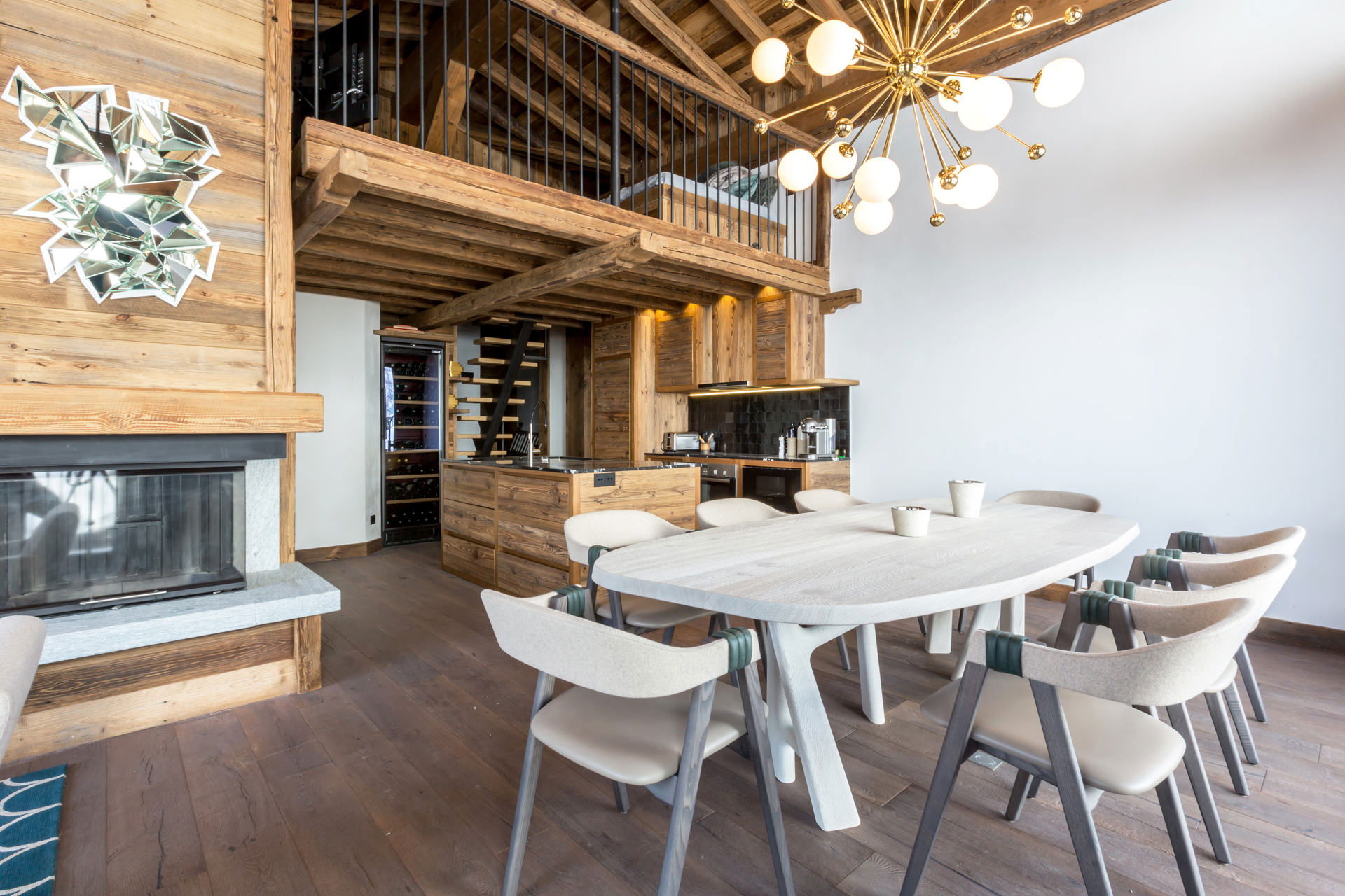 Interior of character combining contemporary decoration with authentic Savoyard and warm architecture made of wood and stone