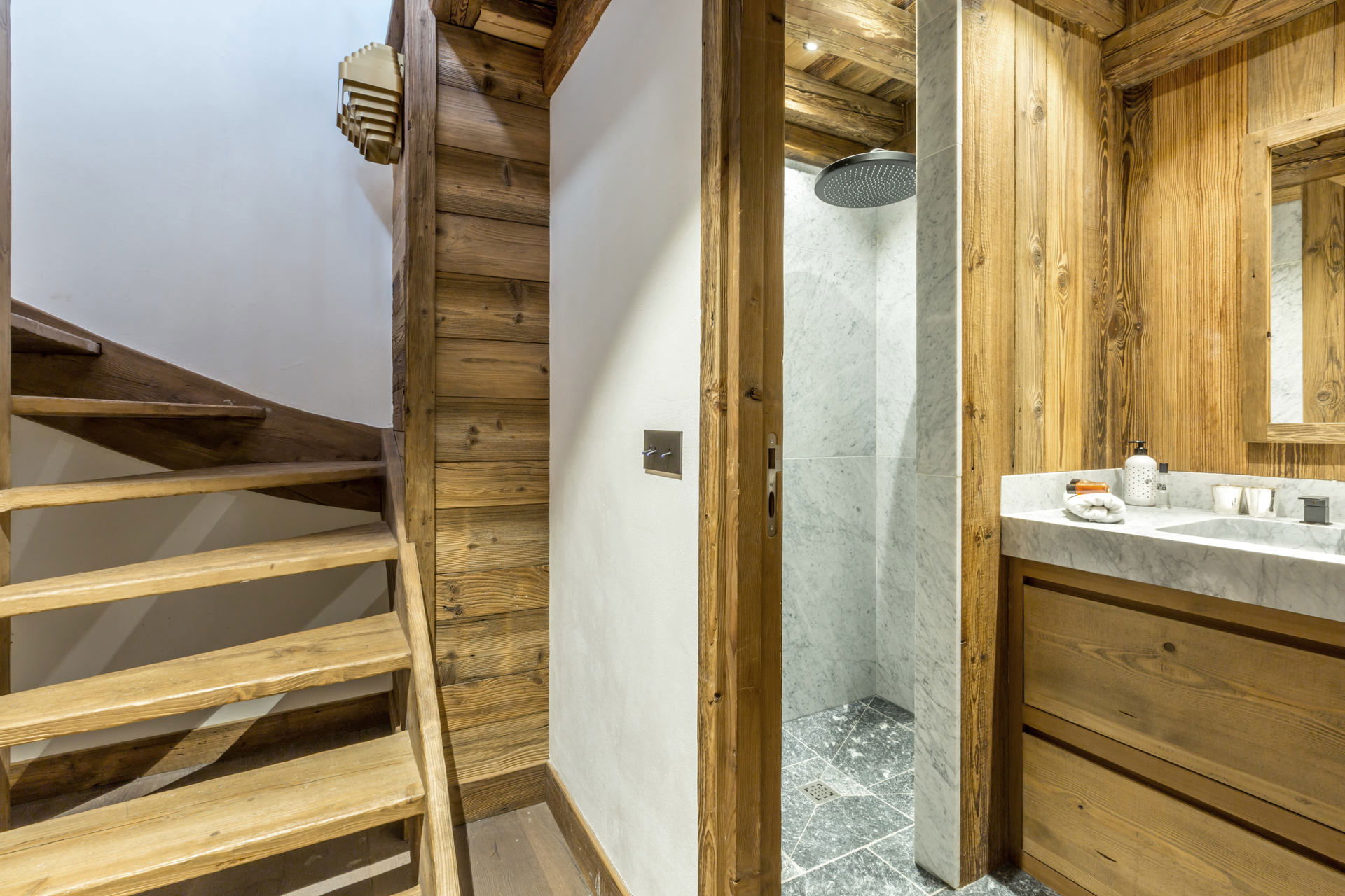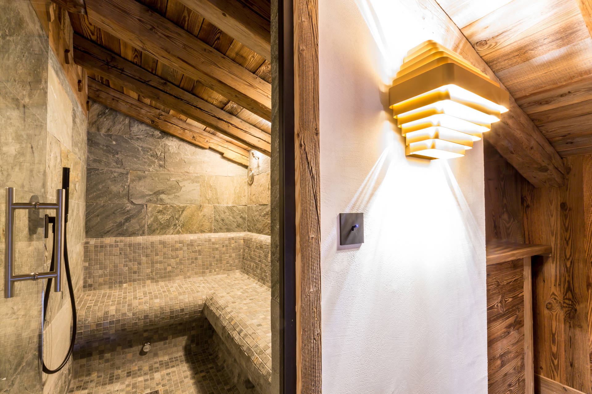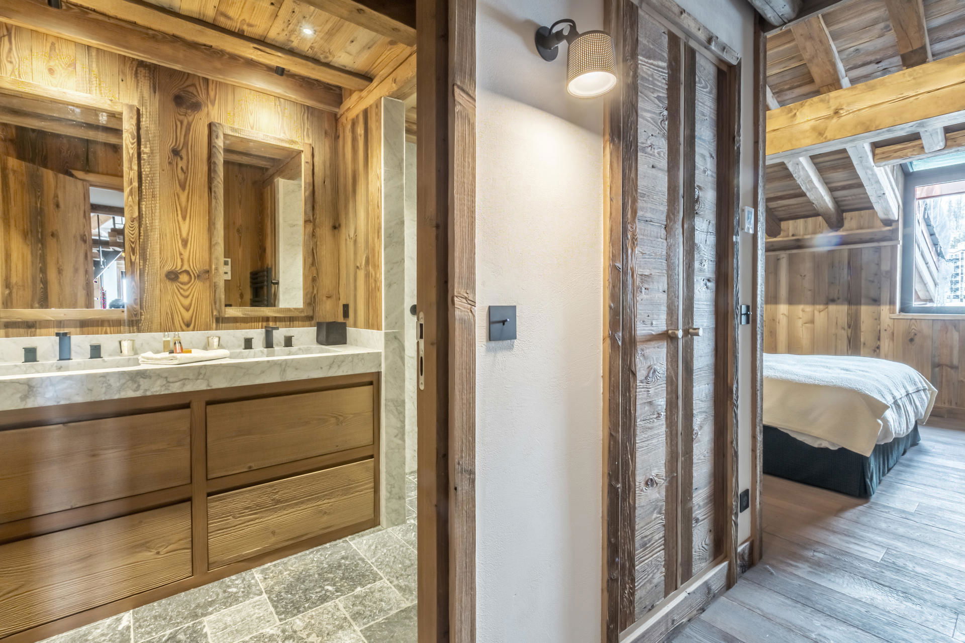 Interior of character combining contemporary decoration with authentic Savoyard and warm architecture made of wood and stone