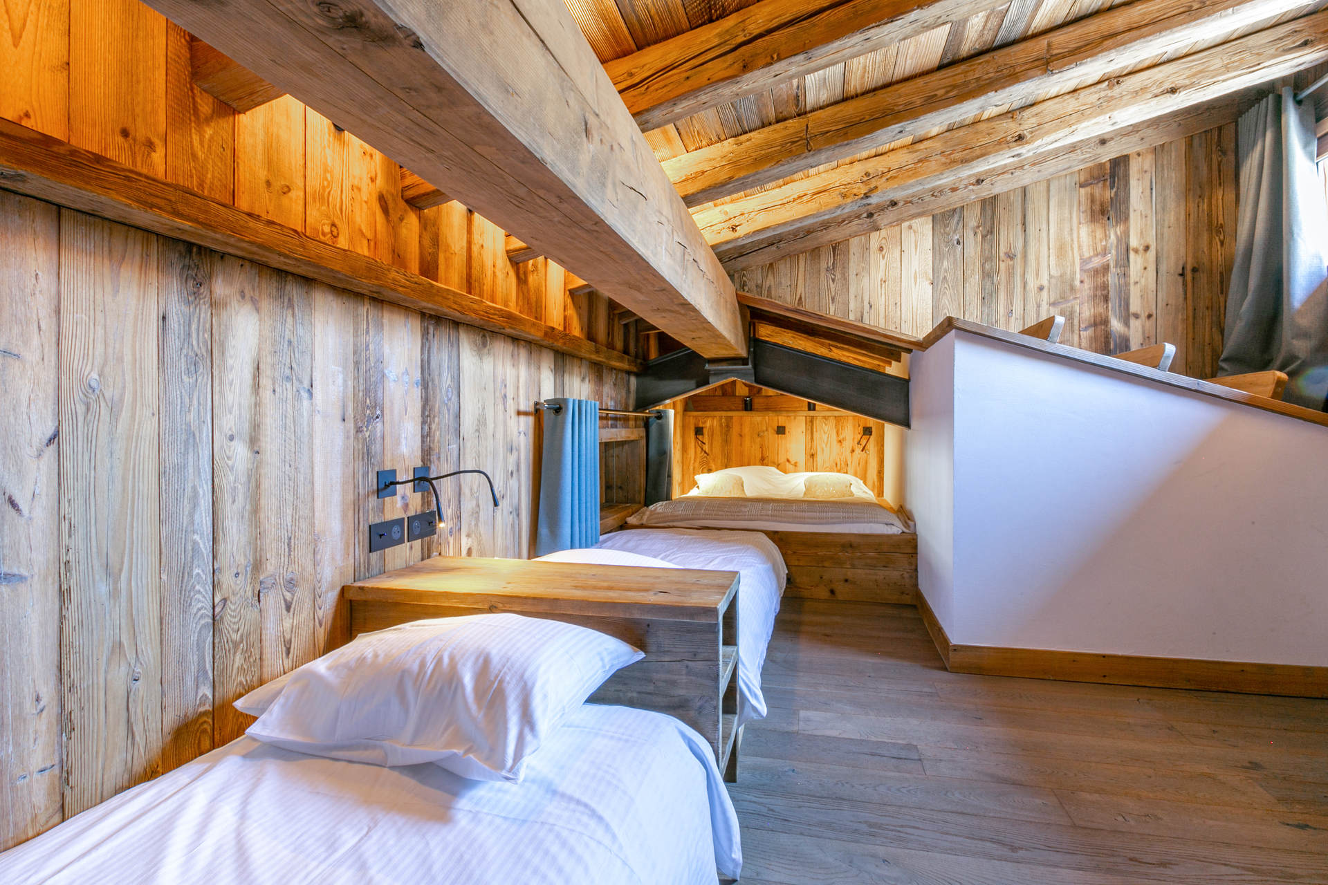 2 joined single beds 90x200 cm + 1 double bed under roof 160x200 cm - television