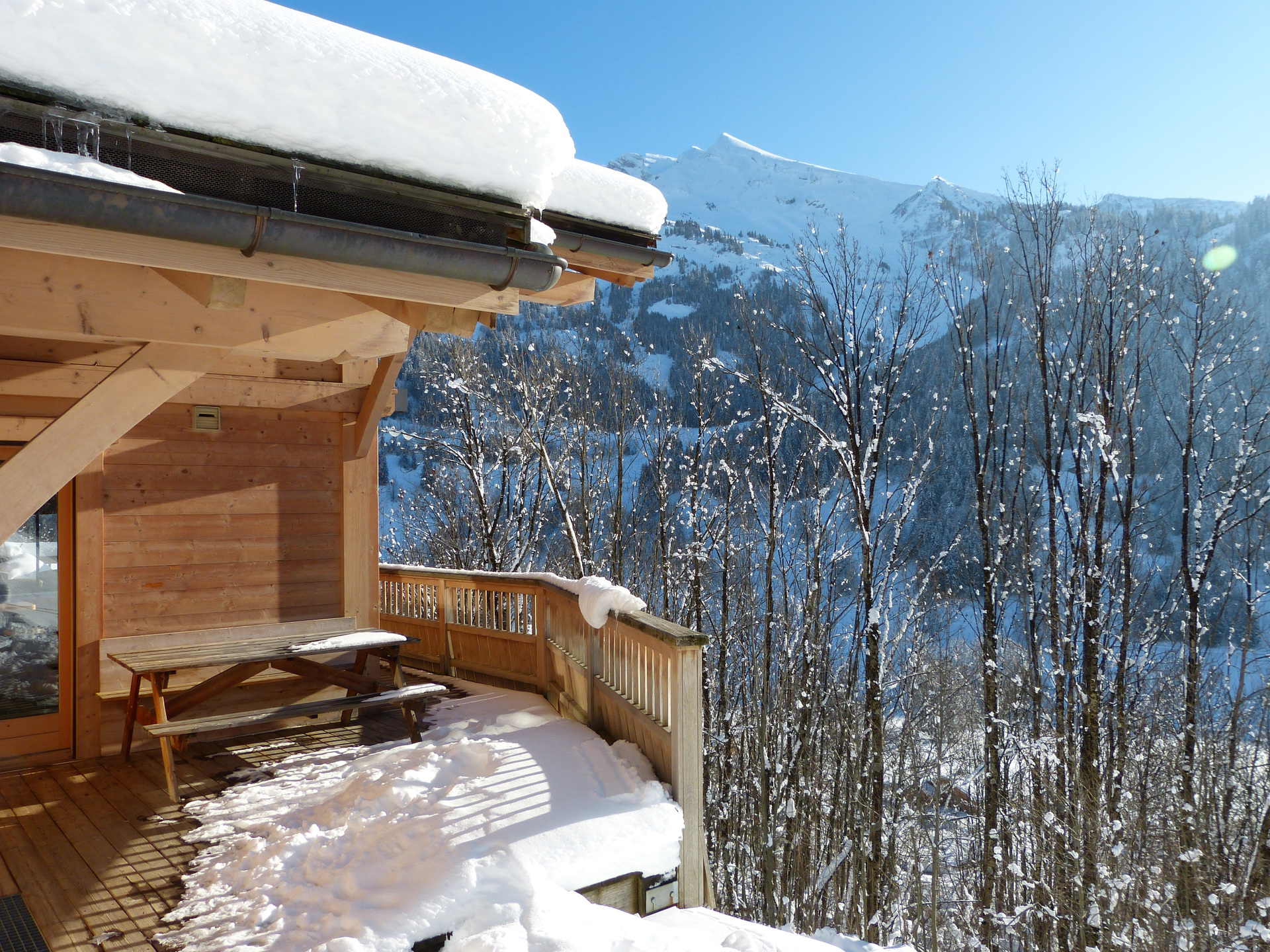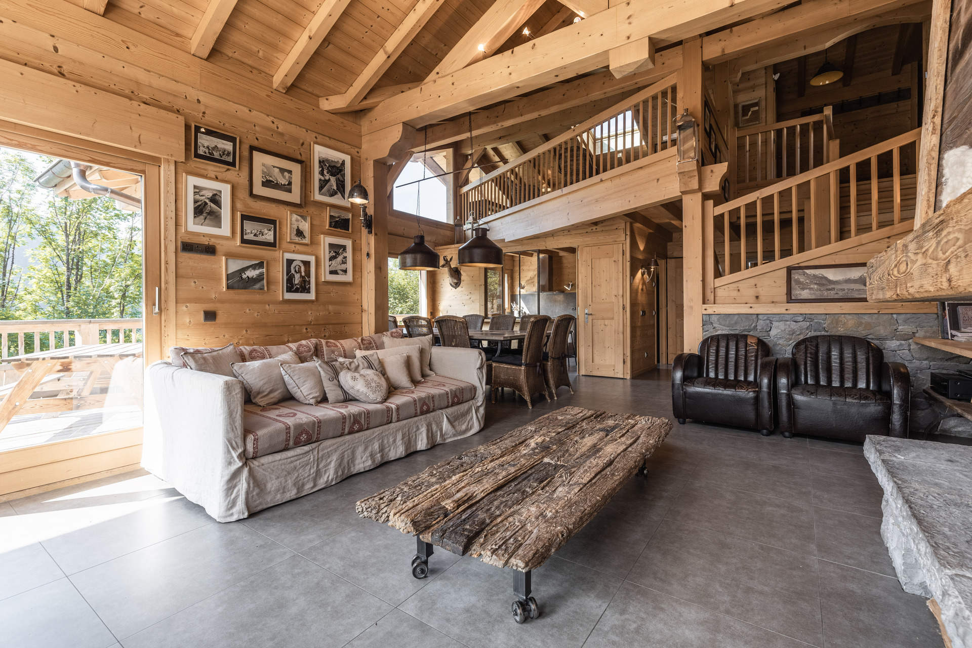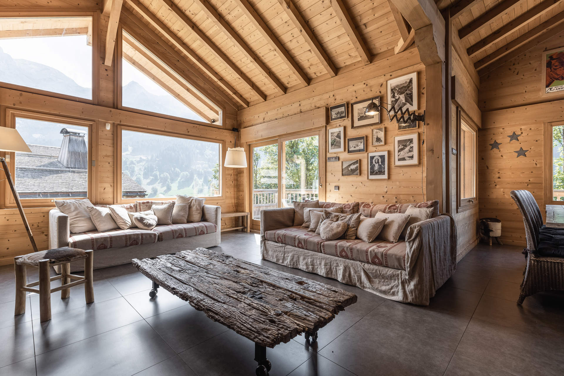 - LIVING CUM DINING ROOM (45.32 m²): FIREPLACE, east facing window + bay window, next door chalet view, south facing sliding bay window, south-east facing terrace, mountain view