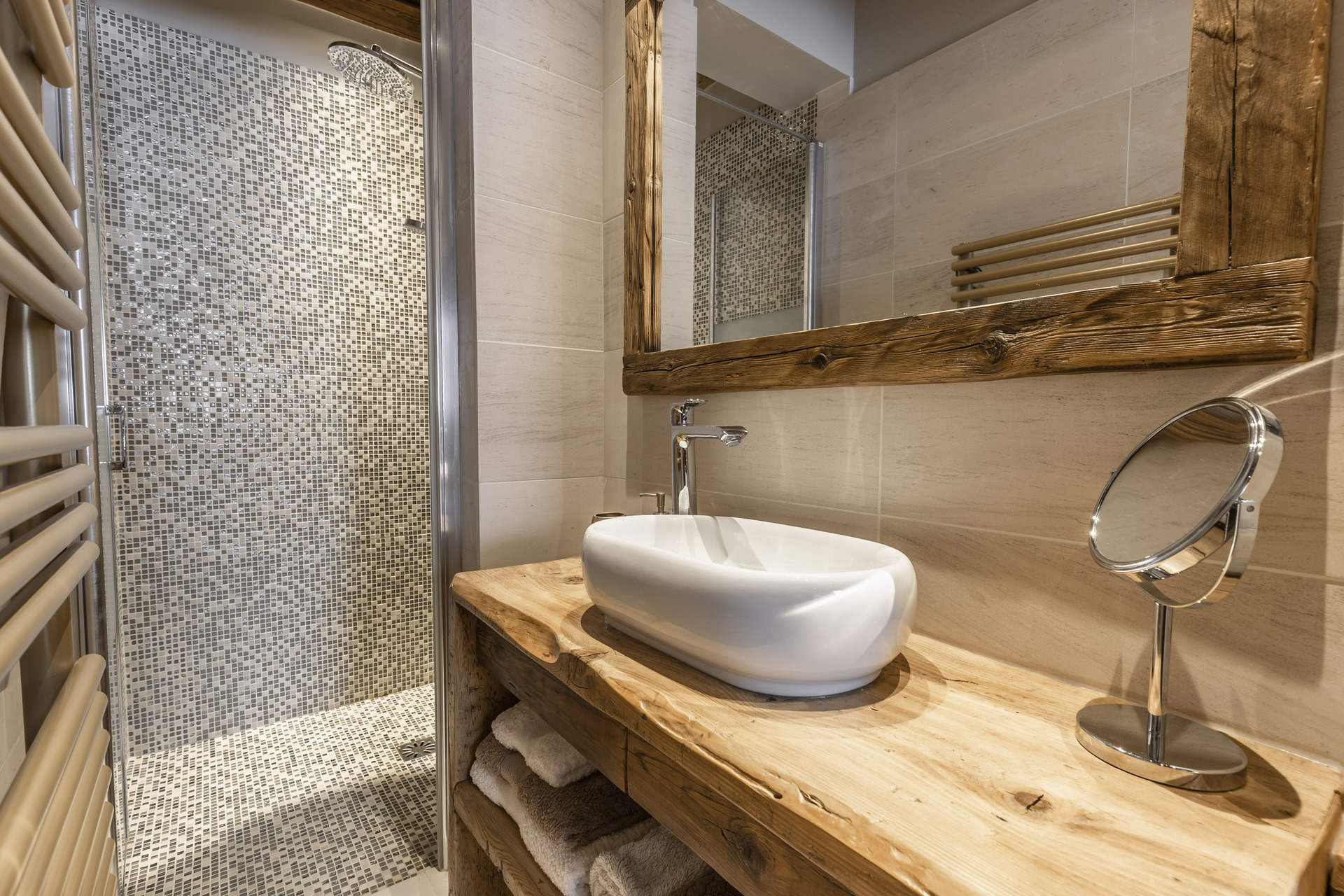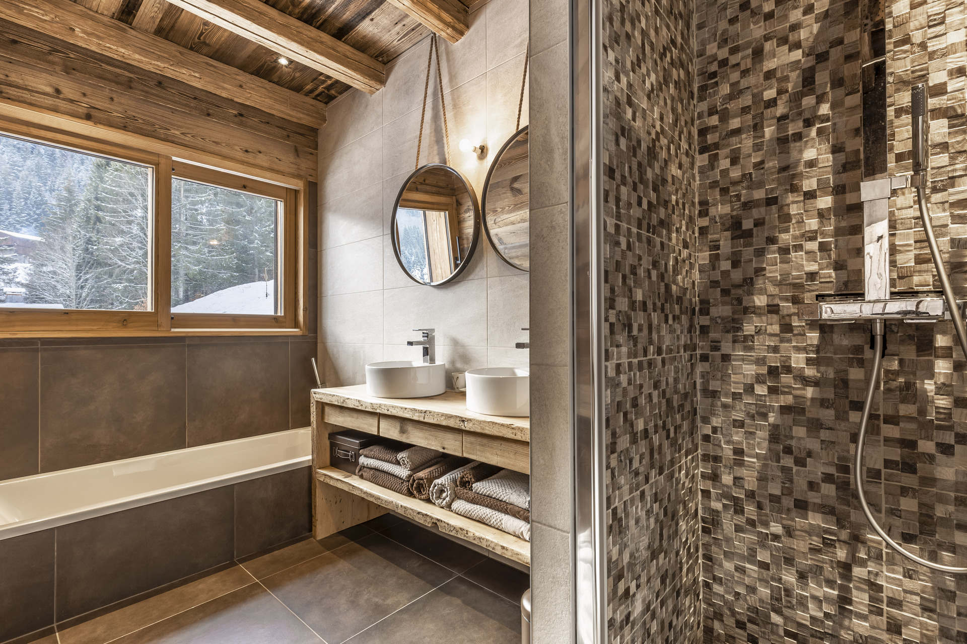 - BEDROOM (10.06m²) : 1 DOUBLE BED (160), east facing window, village / slopes / mountains view, south facing sliding bay-window, next door chalet / mountains view, access south facing terrace, adjoing SHOWER-ROOM (6.37 m²) : double washbasin, bathtub, shower, TOWELDRYER radiator, south facing window, terrace / next door chalets / mountains view