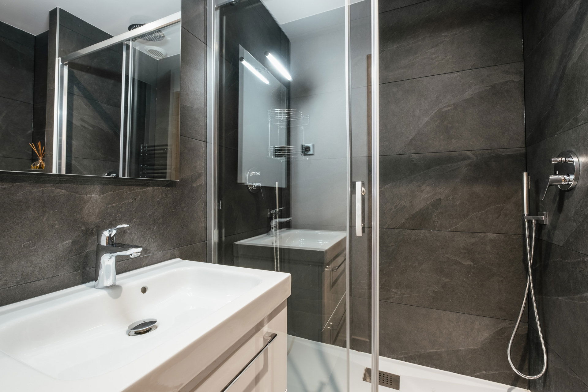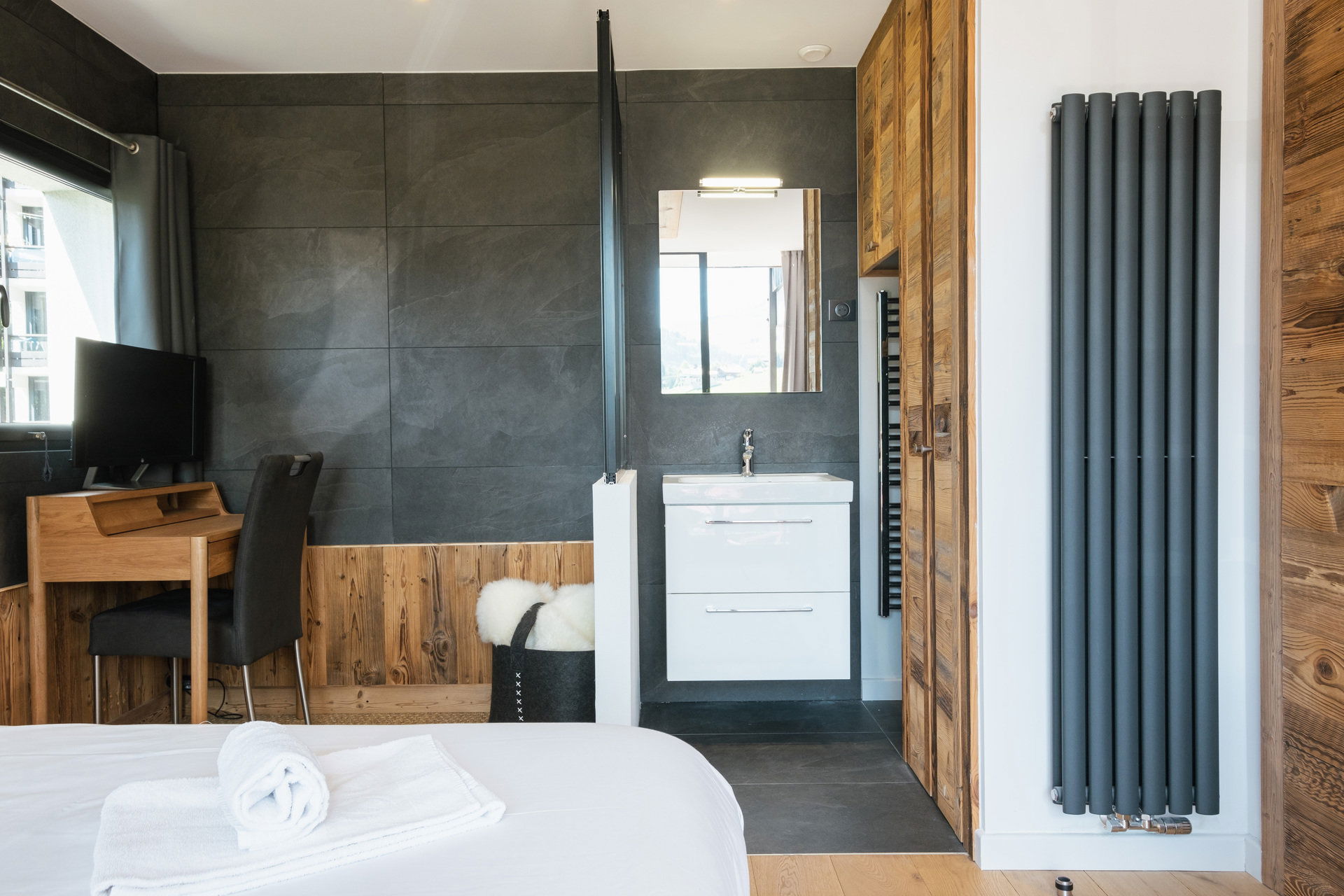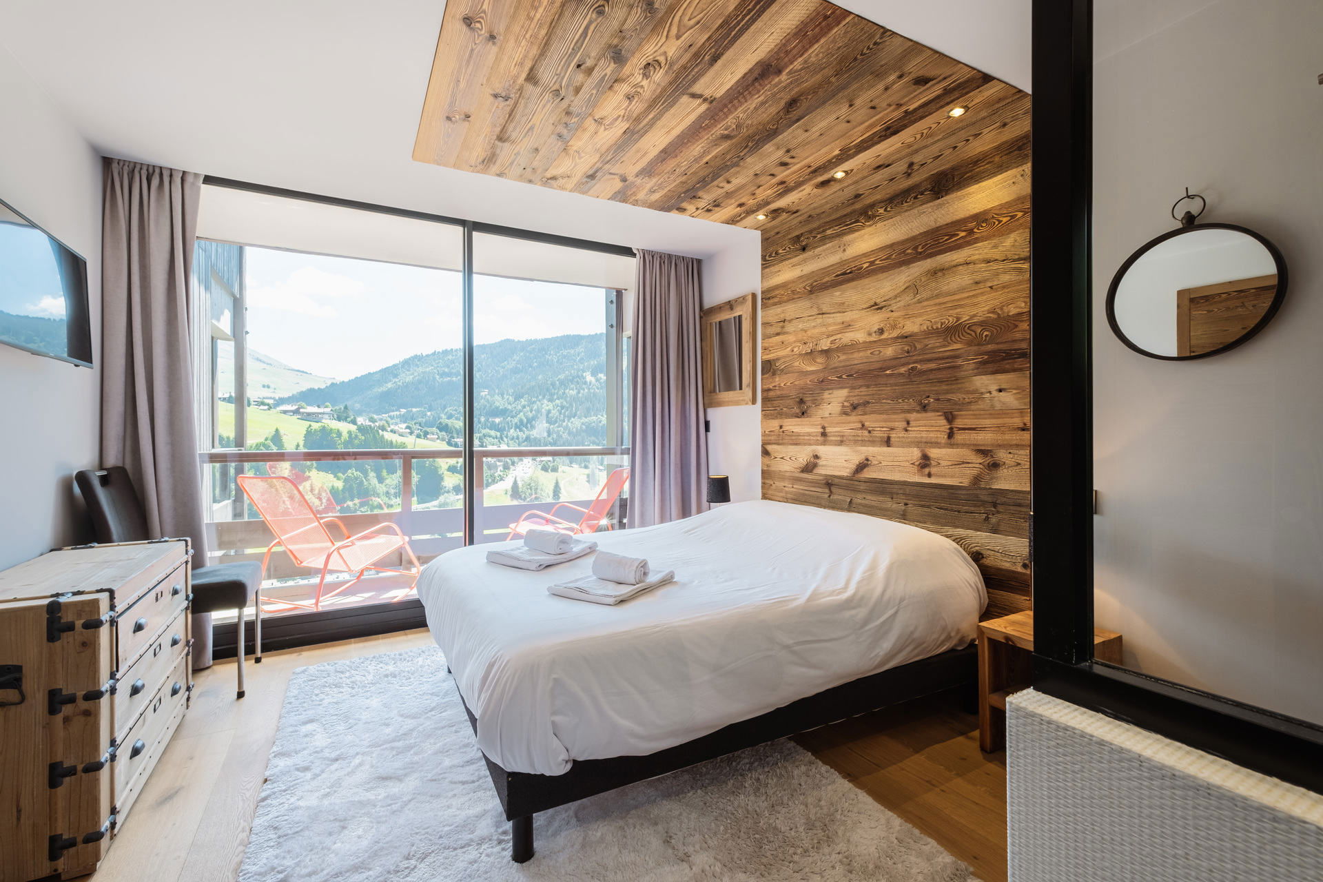 - BEDROOM (12.67 m²): 1 DOUBLE BED (160), flat screen TV, south facing sliding bay window + balcony, panoramic swimming pool / village / moutains view ; washbasin, shower, TOWELDRYER radiator