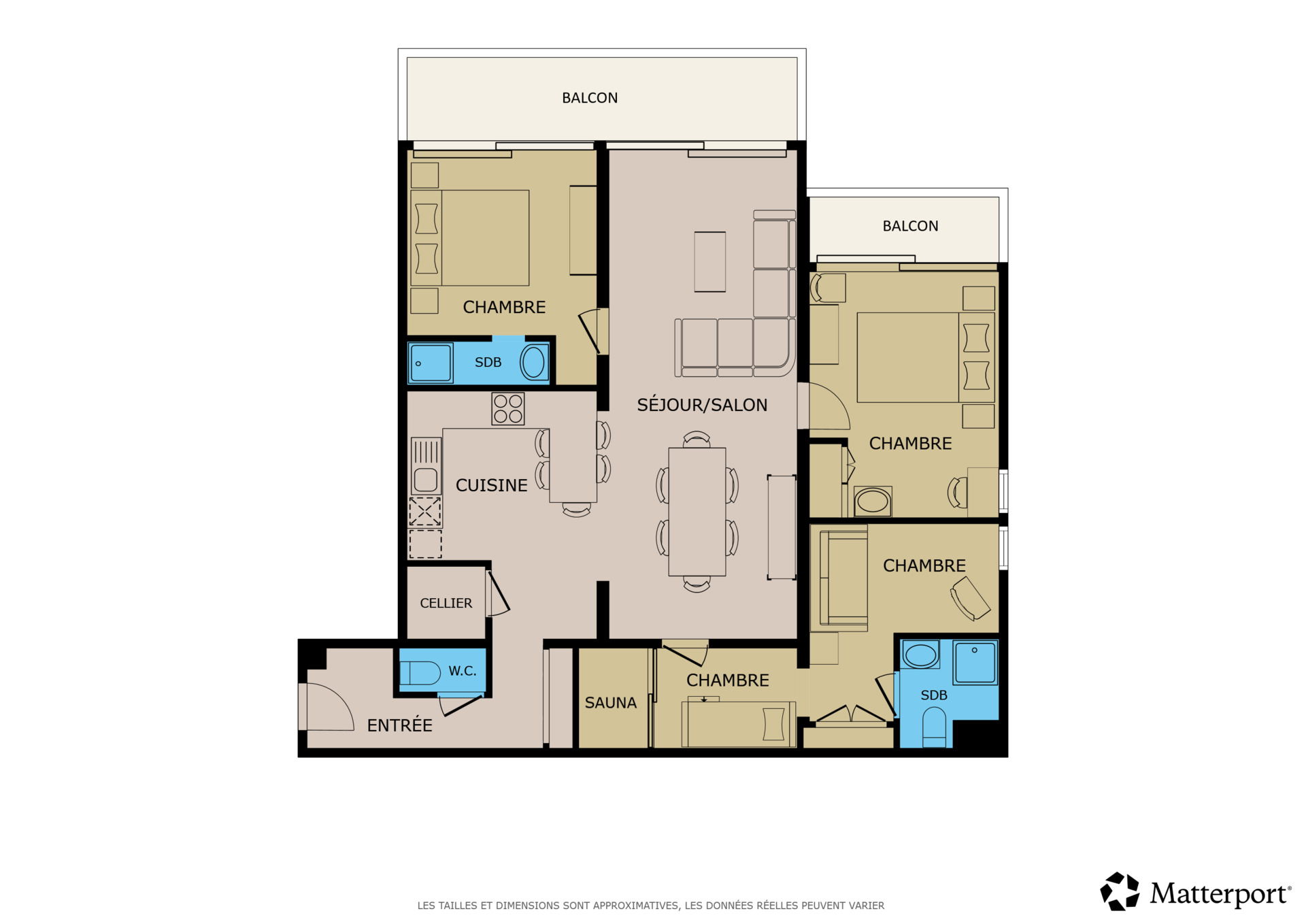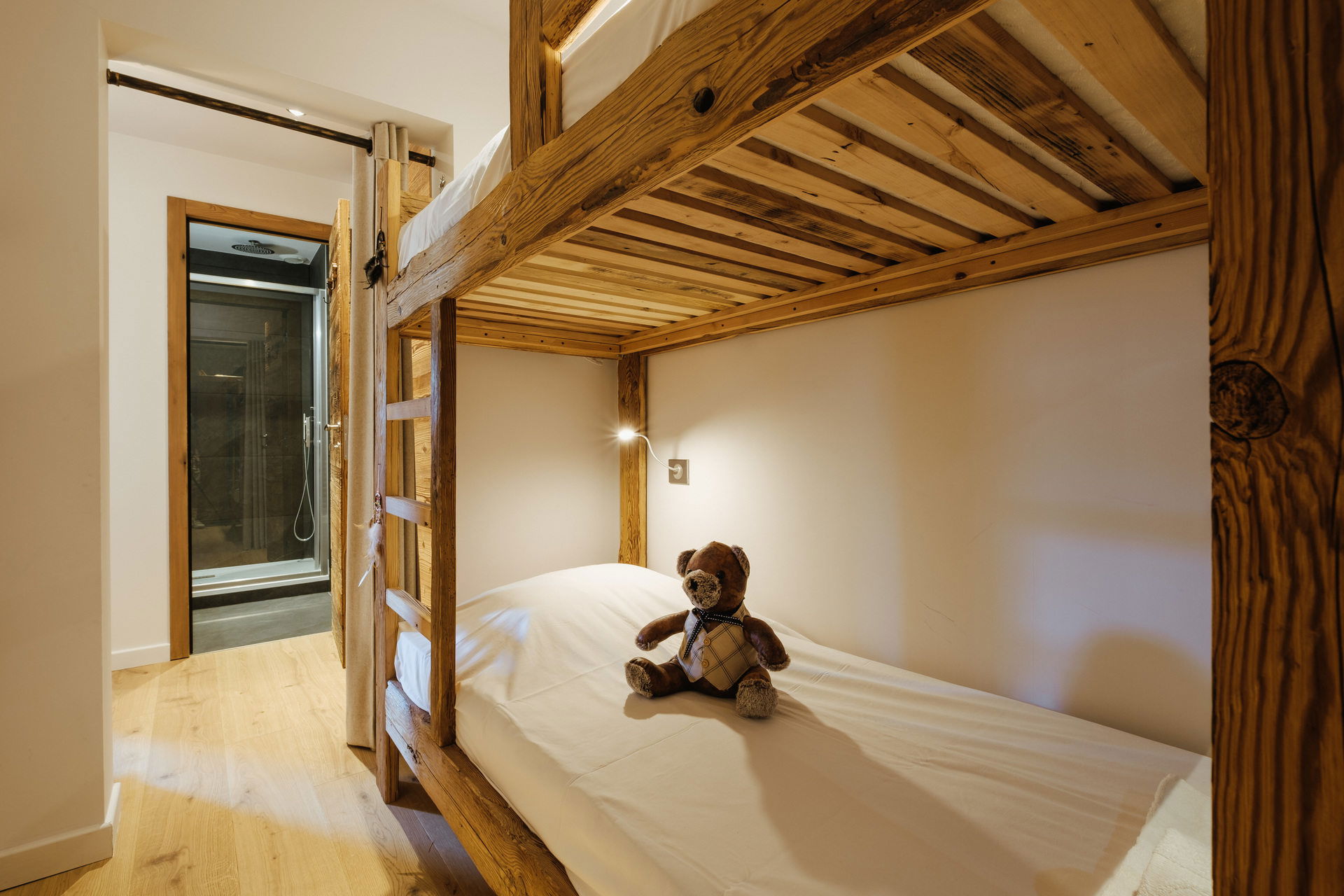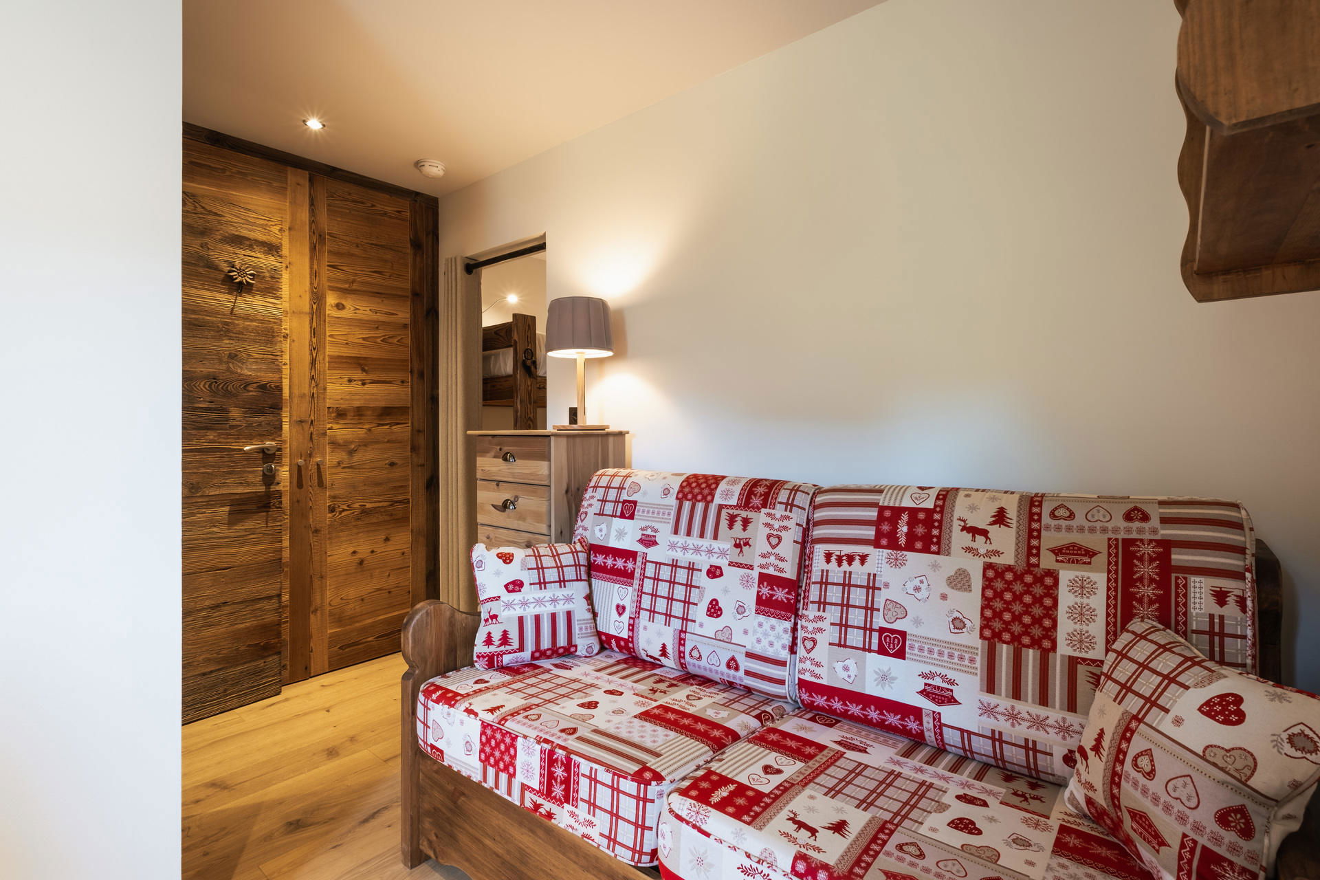 - BEDROOM (14.90 m²): 2 BUNKS BEDS (80) -> upper bed forbidden under years old, SAUNA ( 2 seats), adjoing sleeping corner with 1 CONVERTIBLE SOFA BED (140) -> upper bed forbidden under 6 years old, west facing window residence car park / moutains / village view ; SHOWER ROOM (3 m²): washbasin, shower, WC, TOWELDRYER radiator