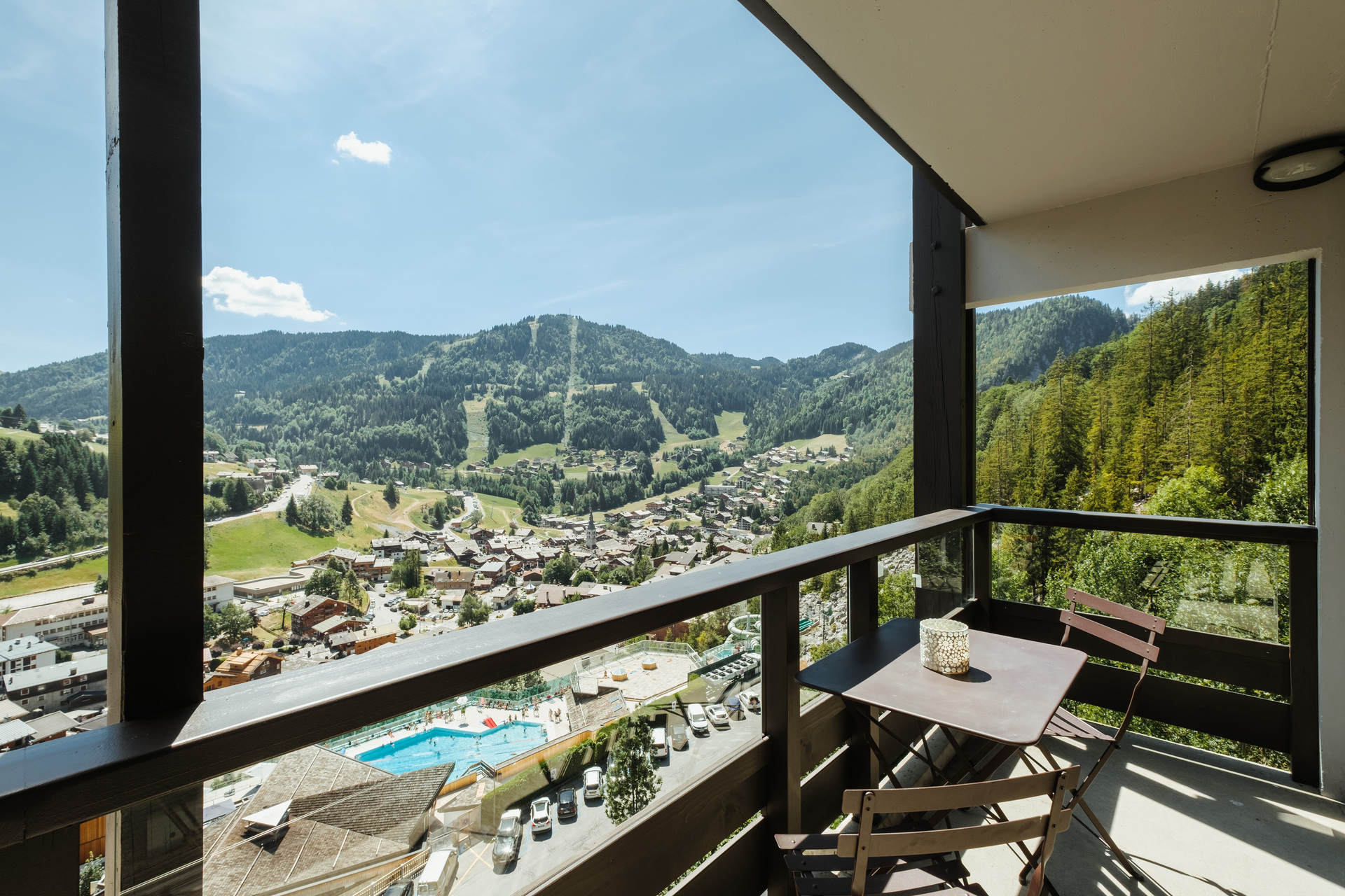 - LIVING-ROOM (25.81 m²): eating place, linving-room, flat screen TV 4K, DECORATIVE fireplace, south facing sliding bay window + balcony, panoramic swimming pool / village / moutains view