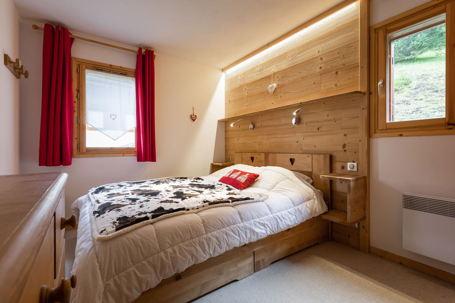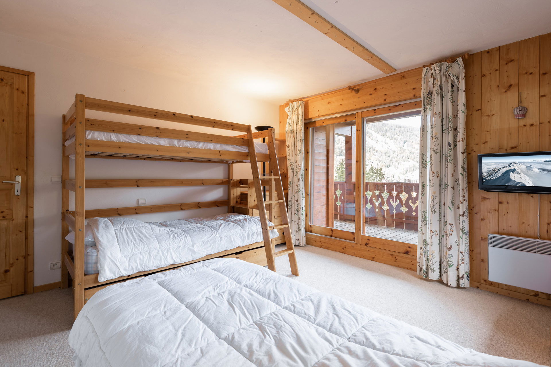 - BEDROOM (16.68 m²) : 2 BUNK BEDS (90) -> upper bed forbidden under 6 years old, 1 SINGLE BED (90), flat screen for DVD video viewing only, south facing window, next door residences / vegetation view, east facing sliding bay window, east balcony access, slopes / village / mountain view