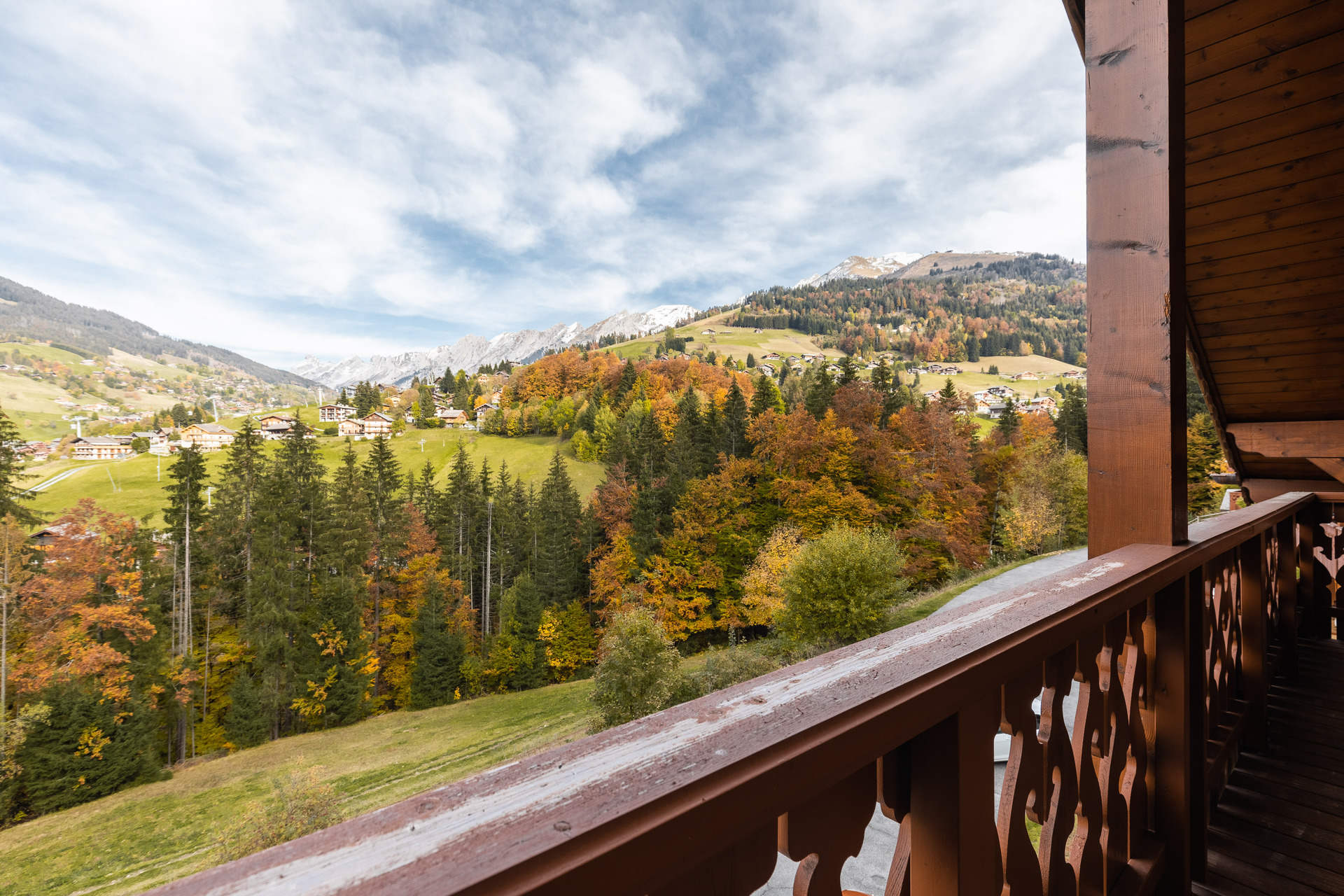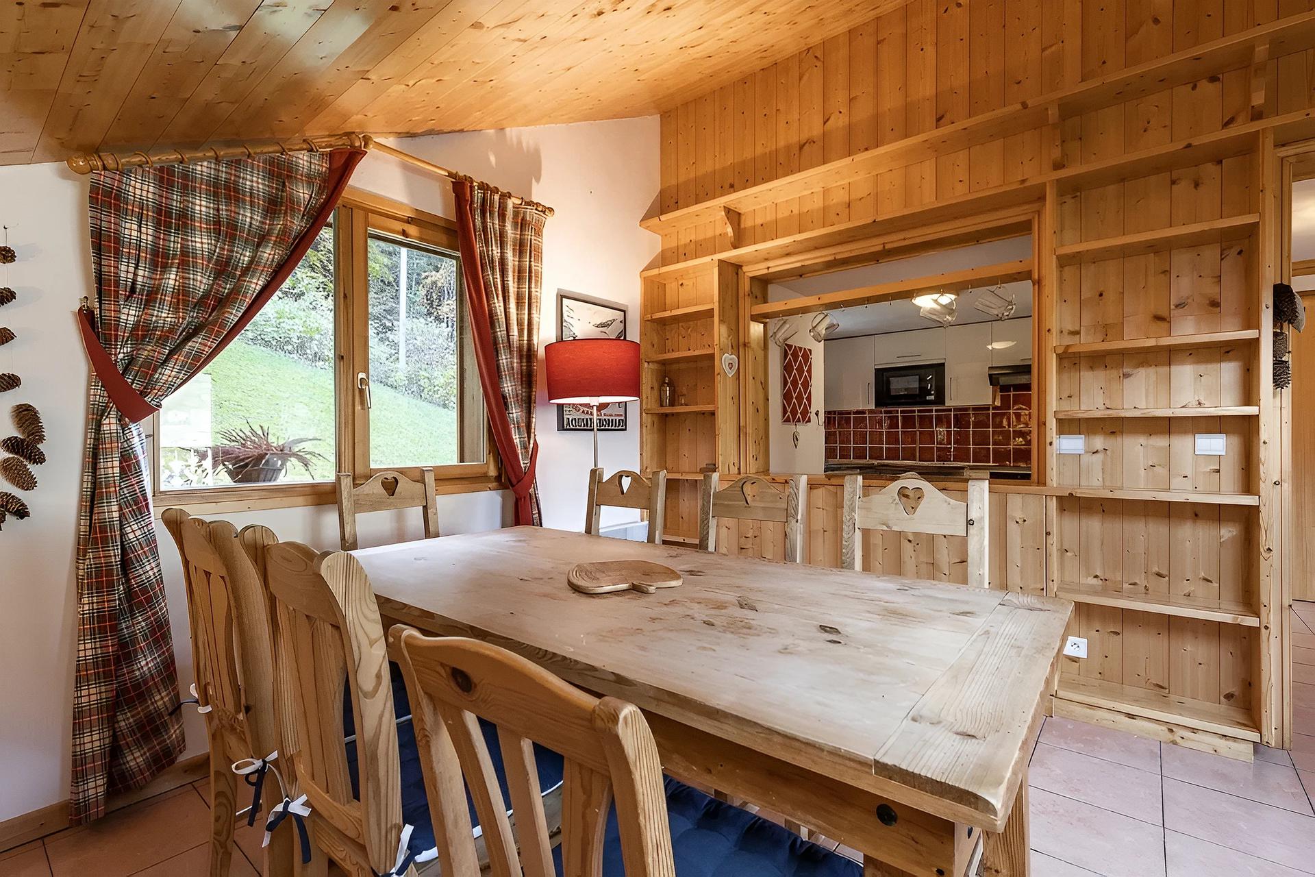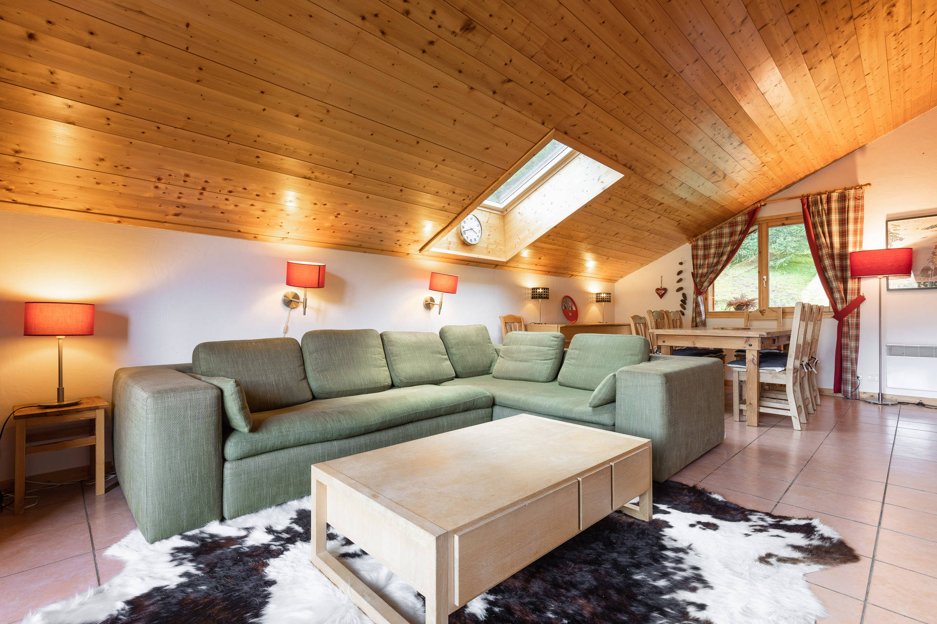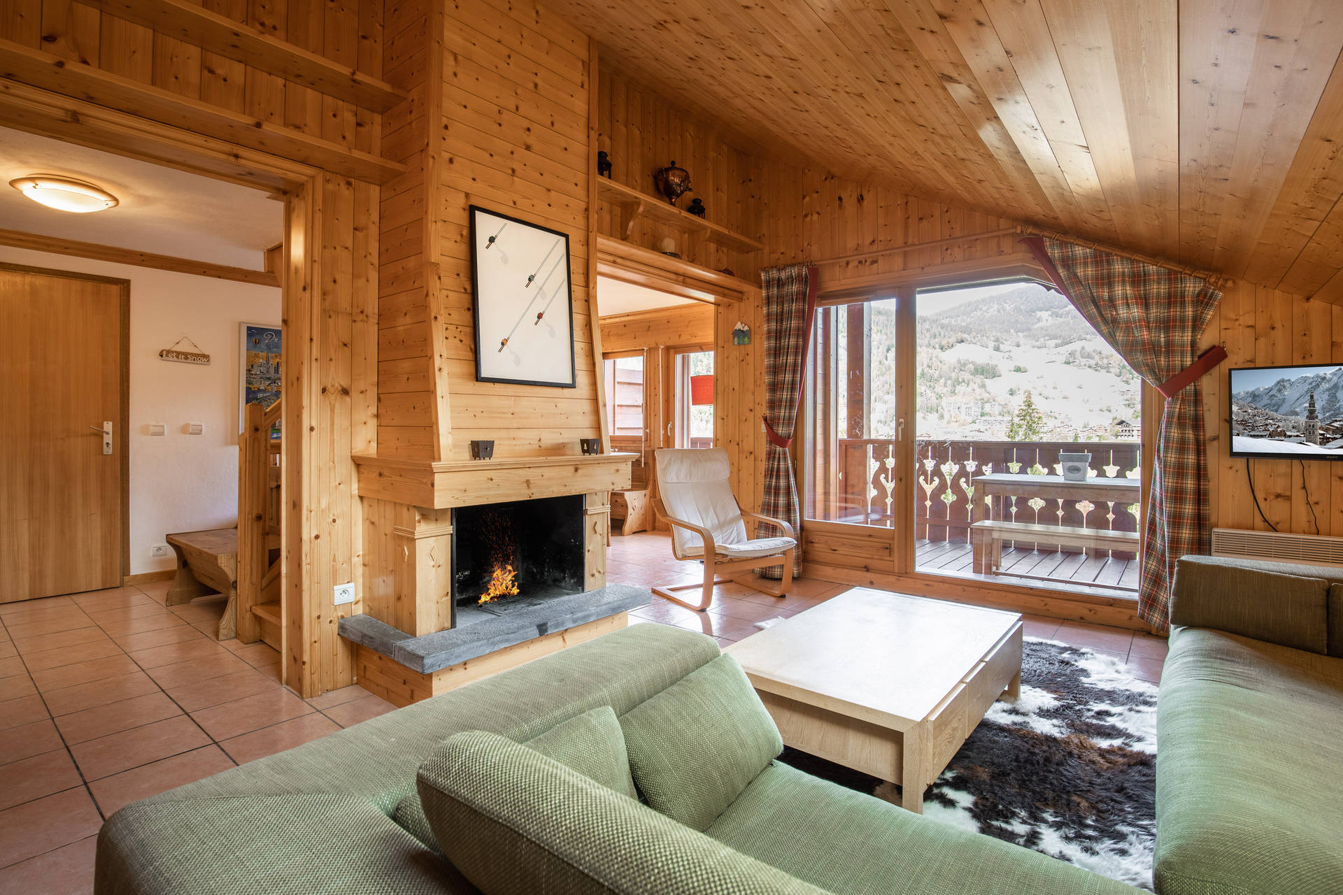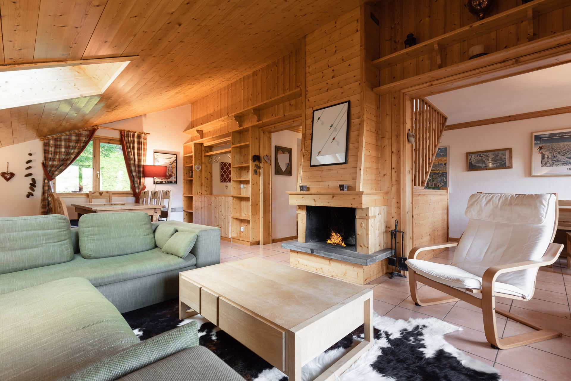 - LIVING-ROOM (26.62 m² including 5.07 mansard roofed) : eating place, west facing window, vegetation view, lounge place, flat screen TV, FIREPLACE, roof window, east facing bay window + french window, east balcony access, slopes / village / mountain view, quiet place, window + french window, east balcony access, slopes / village / mountain view