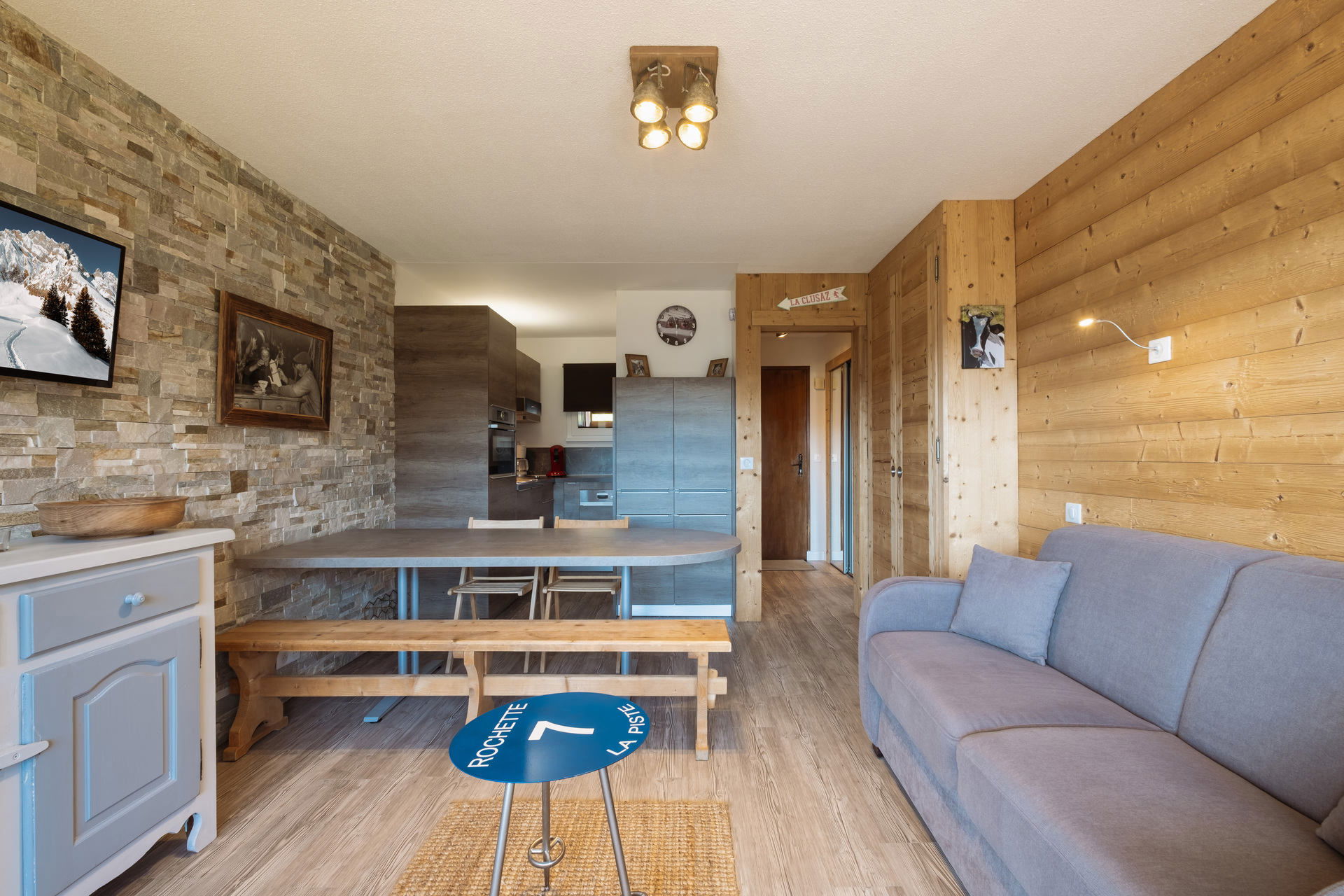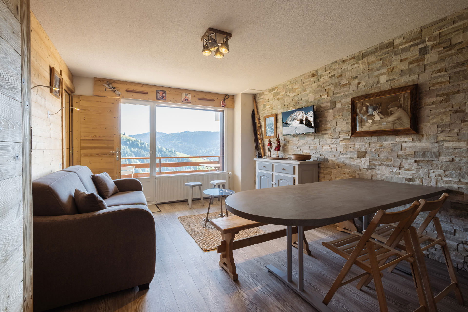 - LIVING-ROOM (16.53 m²) : eating place, flat screen TV, 1 DOUBLE CONVERTIBLE SOFA BED (140), bay window + french window, south balcony access, chalets / slopes / mountains view