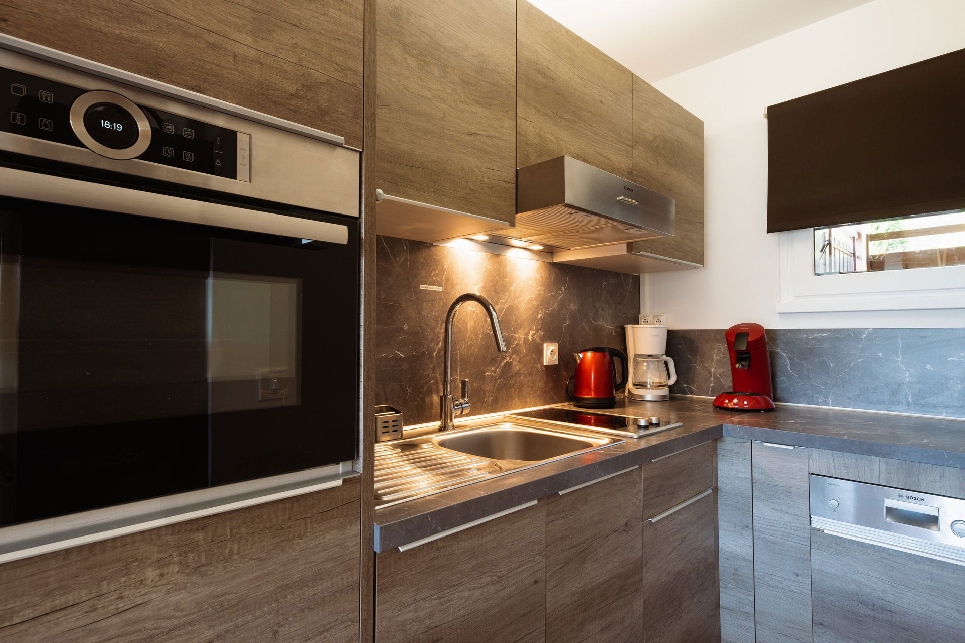 - KITCHENETTE (2.49 m²) : fridge + freezer (137 L), OVEN, MICROWAVE, GLASS-CERAMIC STOVE (2 hot plates), DISHWASHER, north facing window on passageway