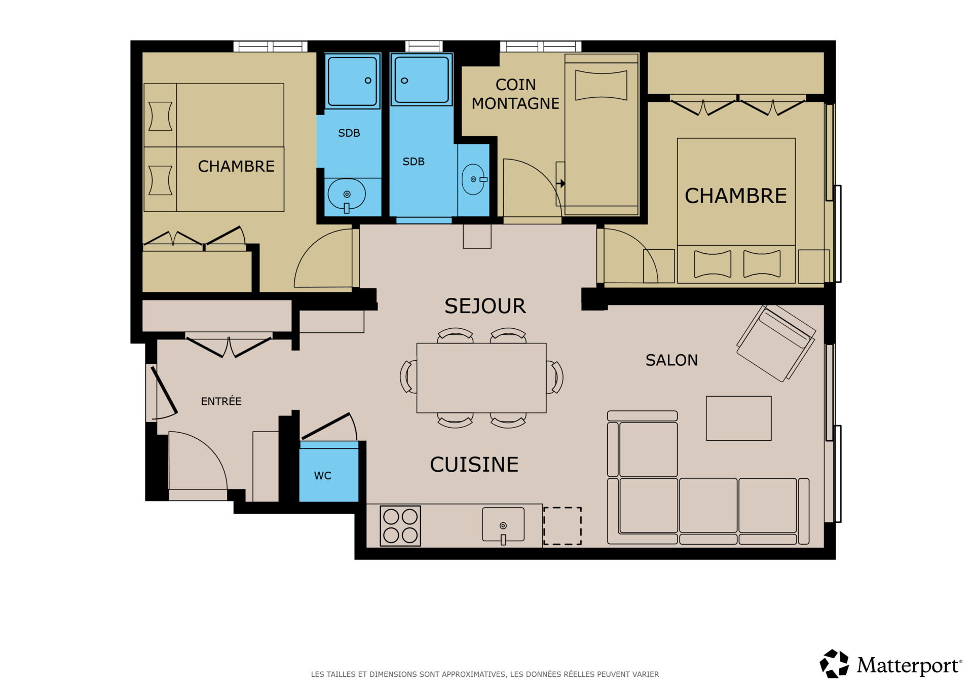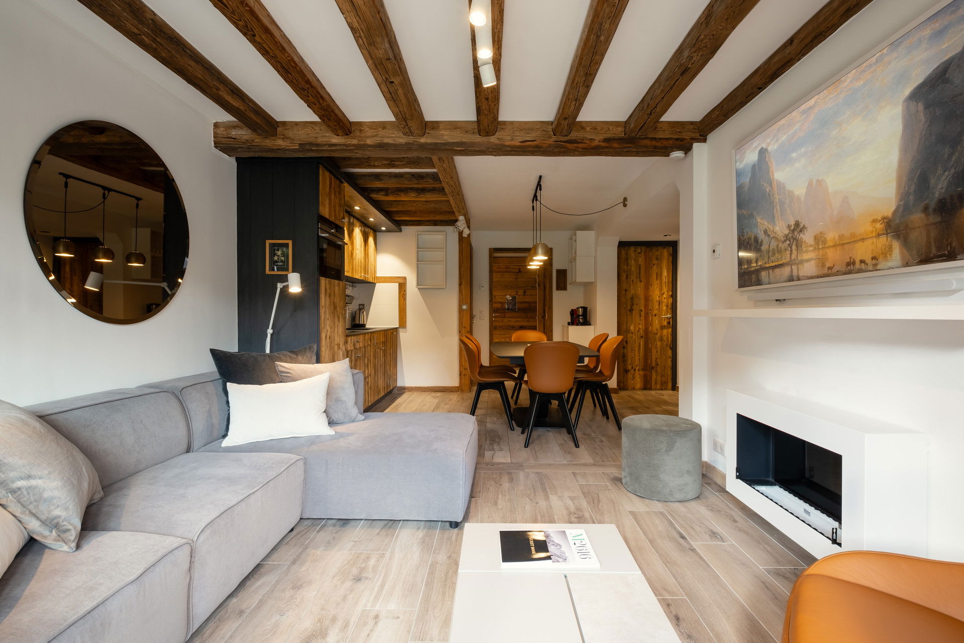 - LIVING ROOM (25.57 m²): smart 70” TV, Wireless Sound system, south facing bay window, access south terrace, garden / neighboring residences / Beauregard mountain view