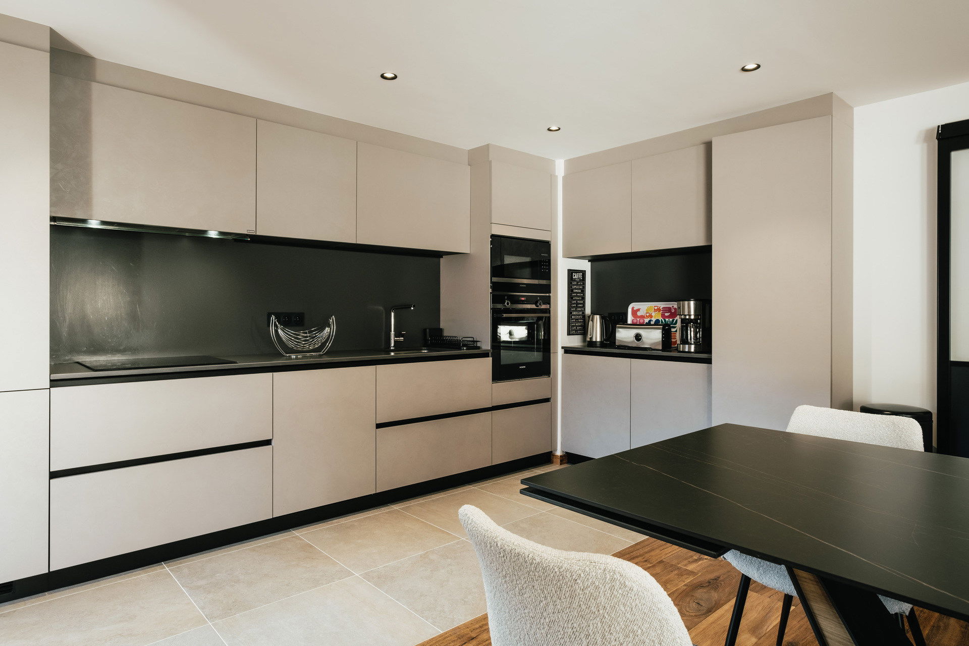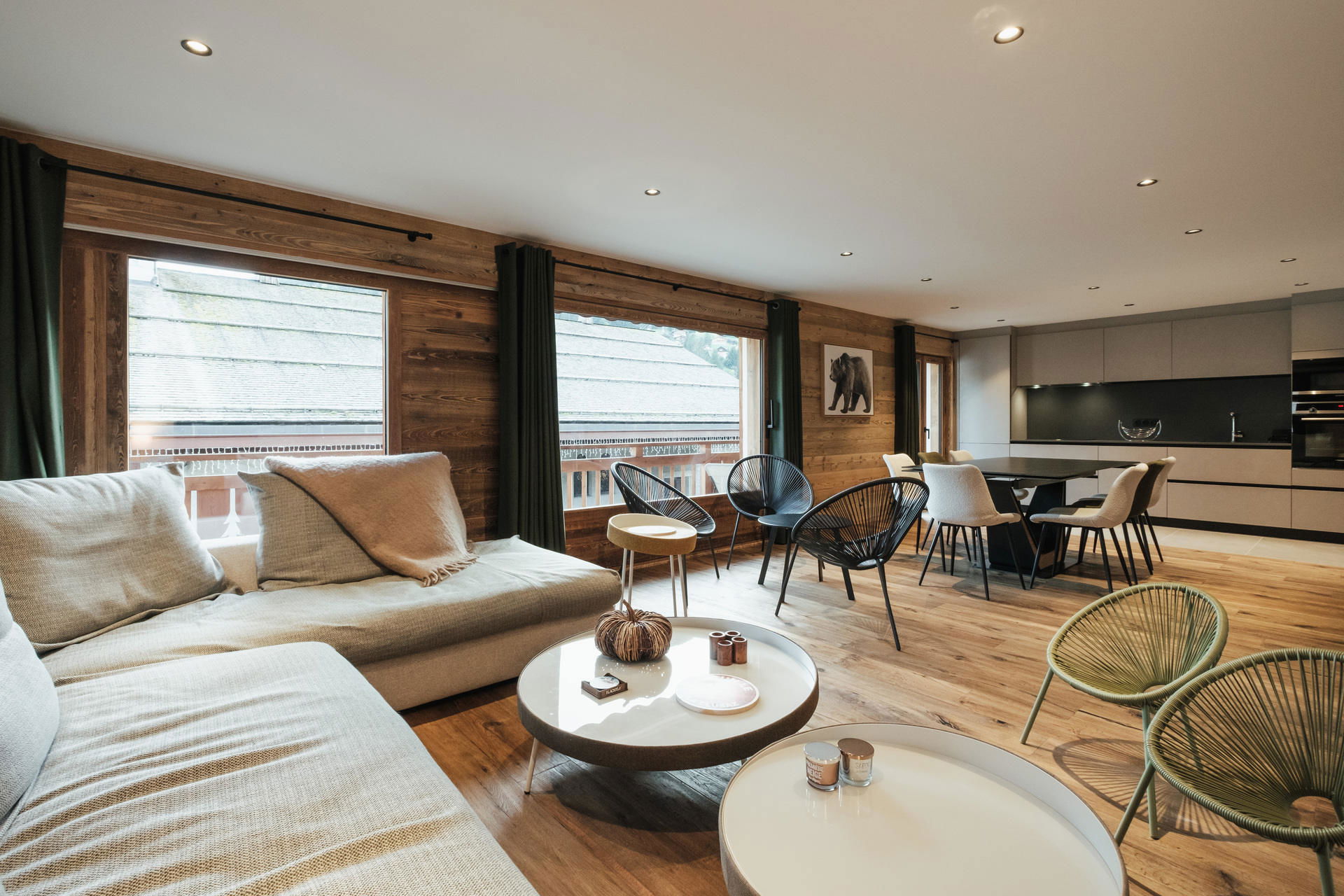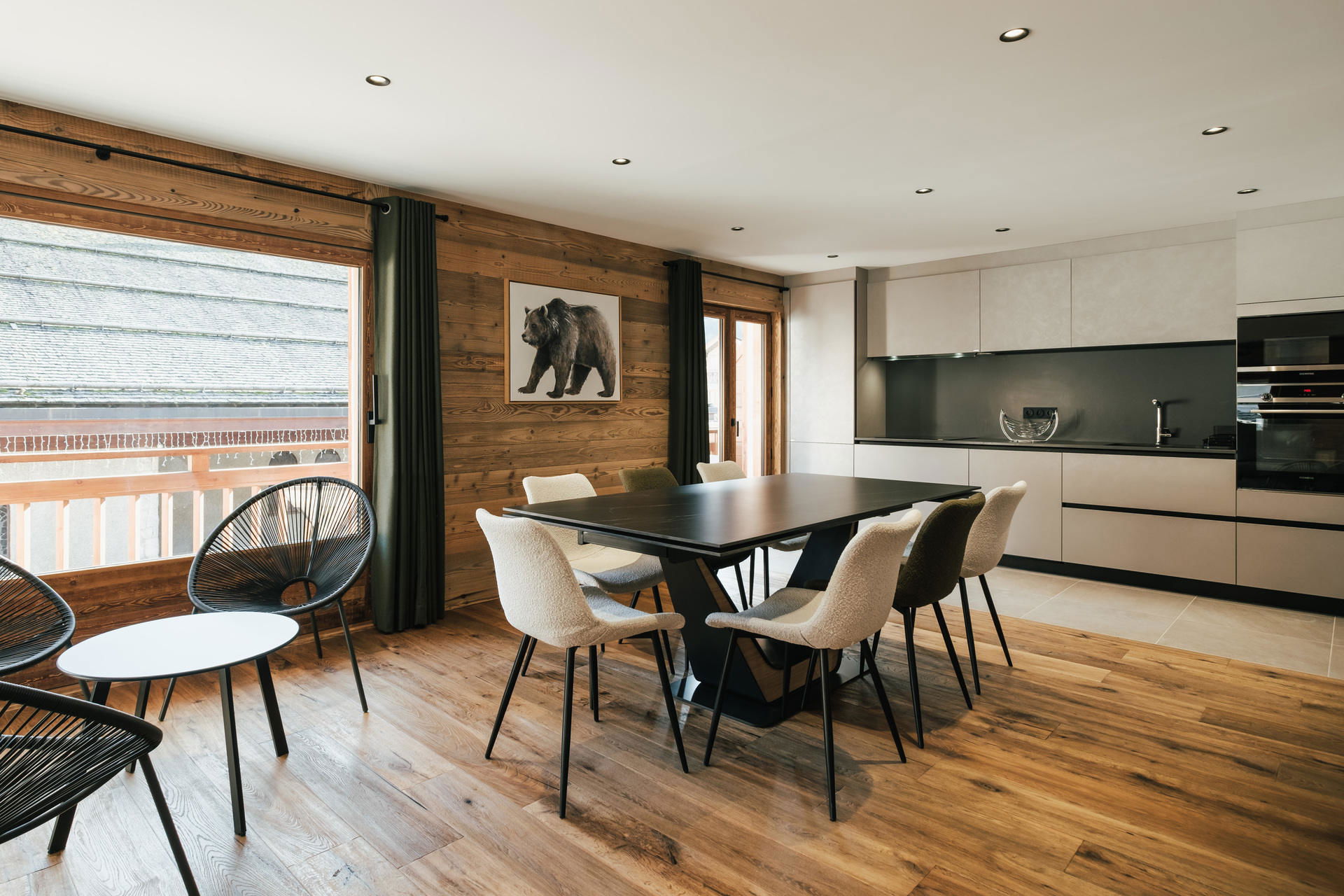 - Open KITCHEN : fridge + freezer (267L), INDUCTION STOVE, OVEN, MICROWAVES, DISHWASHER, NESPRESSO coffee machine, south facing french window, balcony access, church / mountains view.