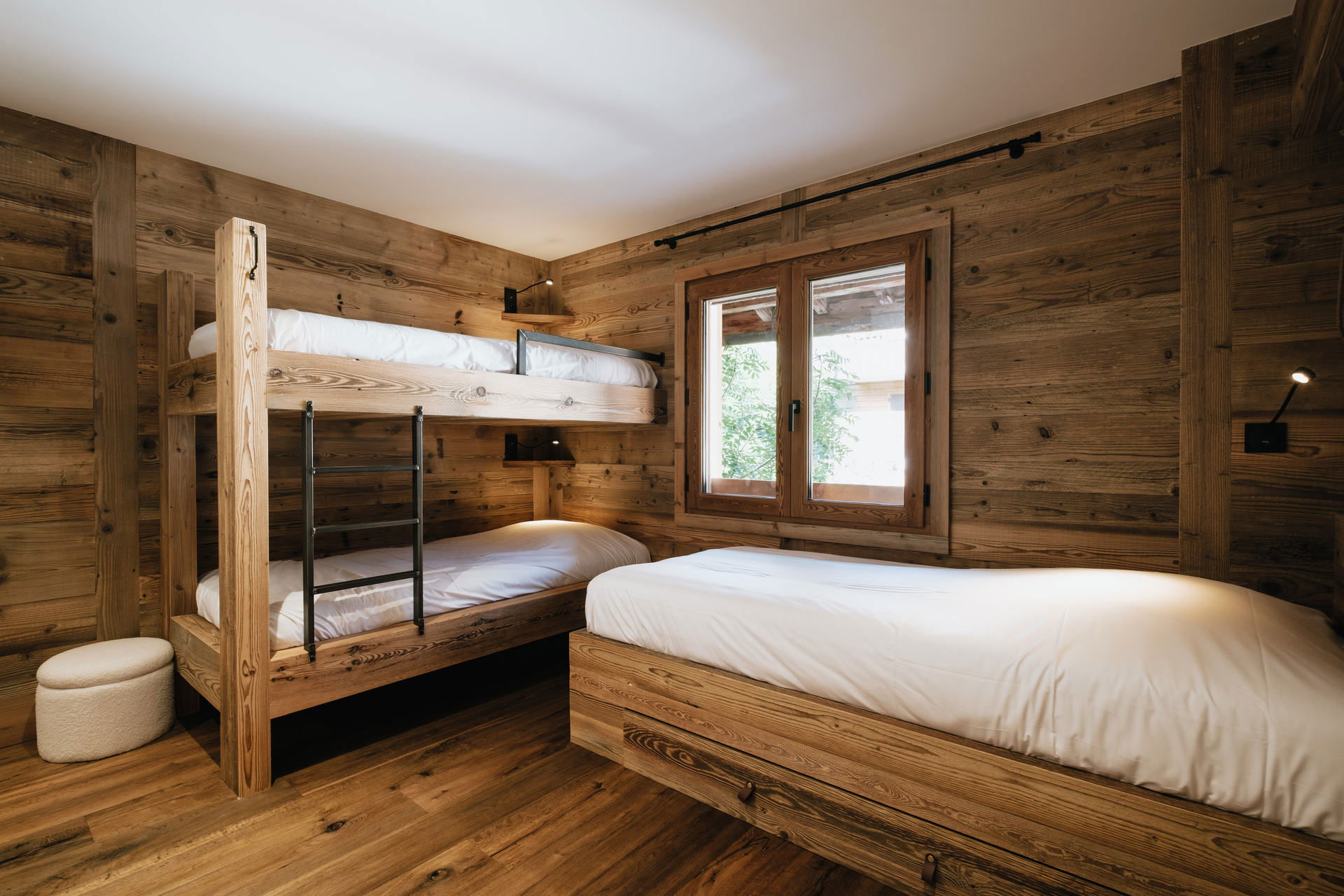 - BEDROOM (10.75 m²): 2 BUNK BEDS => upper bed forbidden under 6 years old + 1 SIMPLE BED (90), east facing window, next door residences view, adjoining SHOWER ROOM (1.13 m²): washbasin, shower, TOWELDRYER radiator, north facing window, next door residences / vegetation / river view.