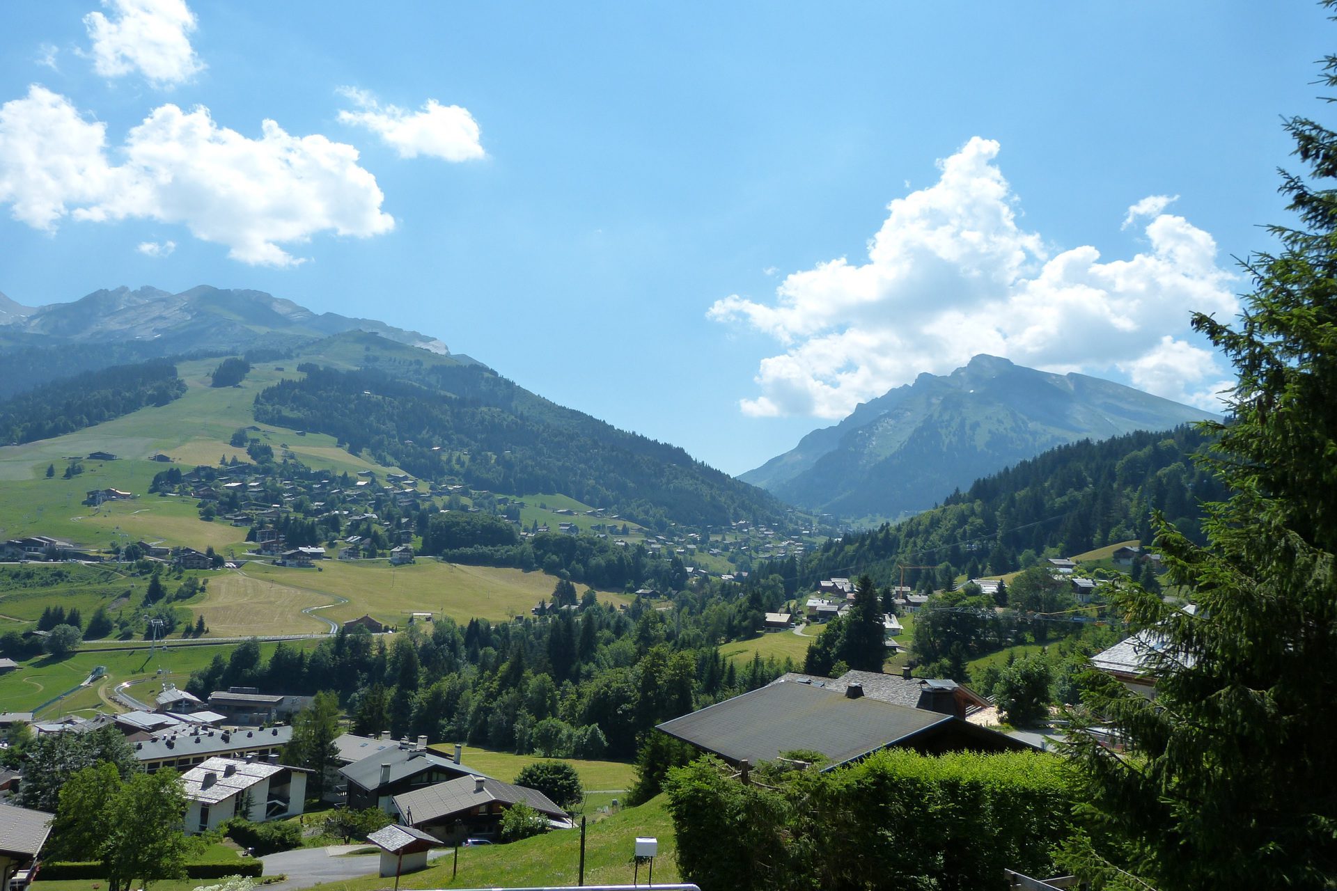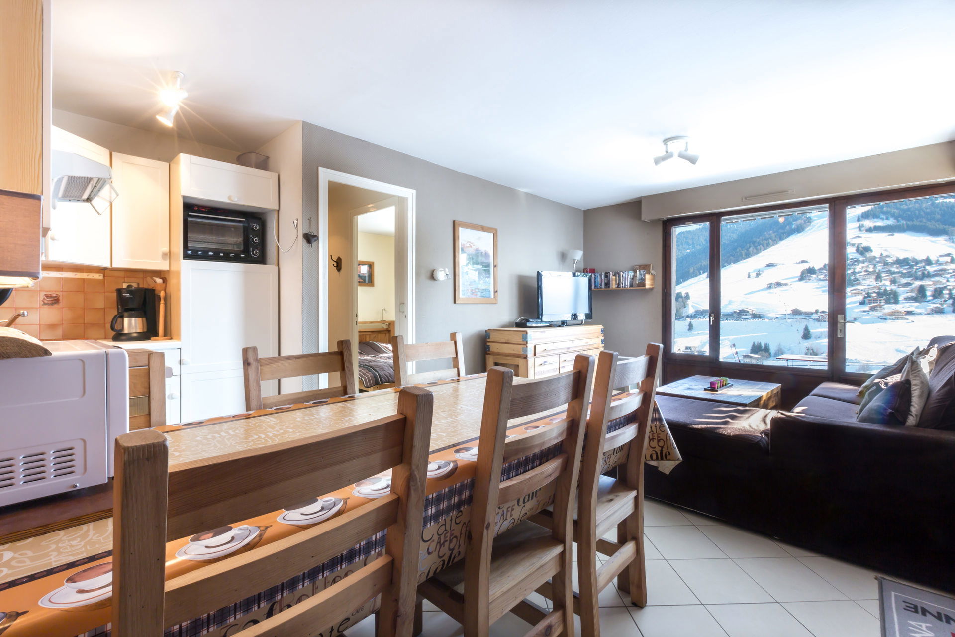 - LIVING ROOM (19.44 m²): flat screen TV, south facing bay window, east facing bay window + French window, east-south facing terrace, village / mountain view