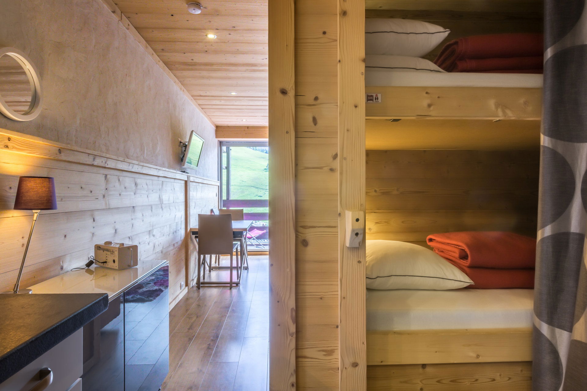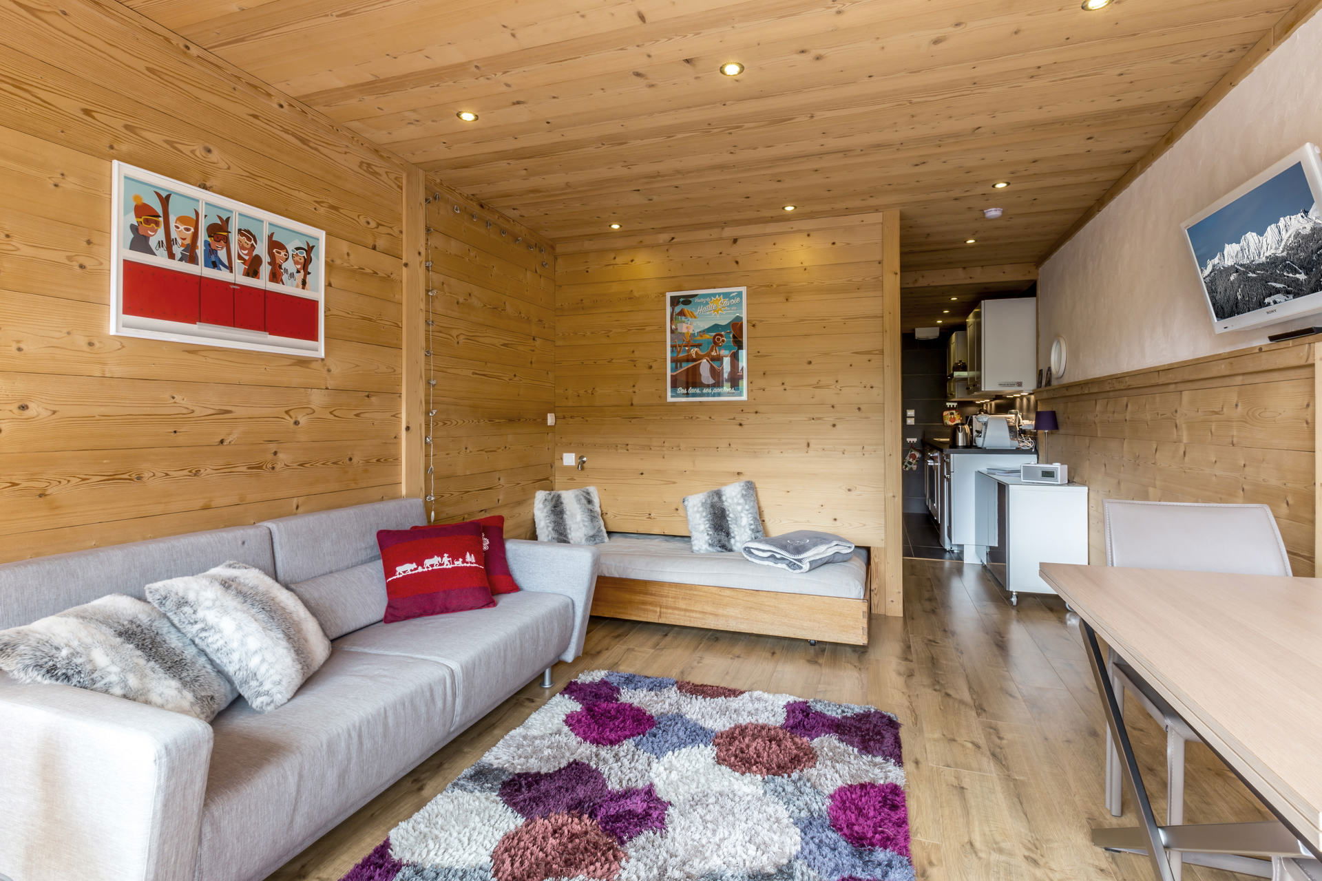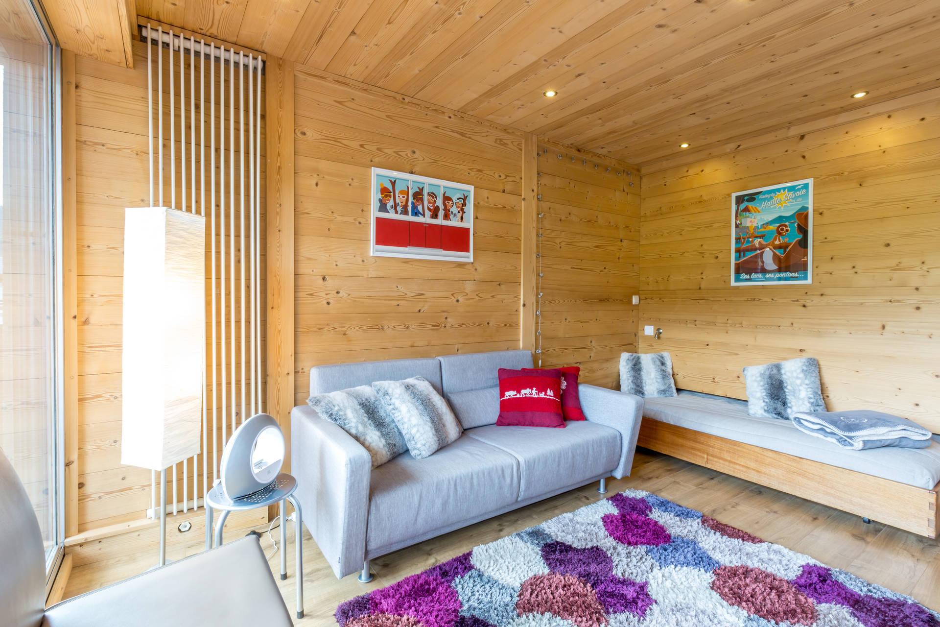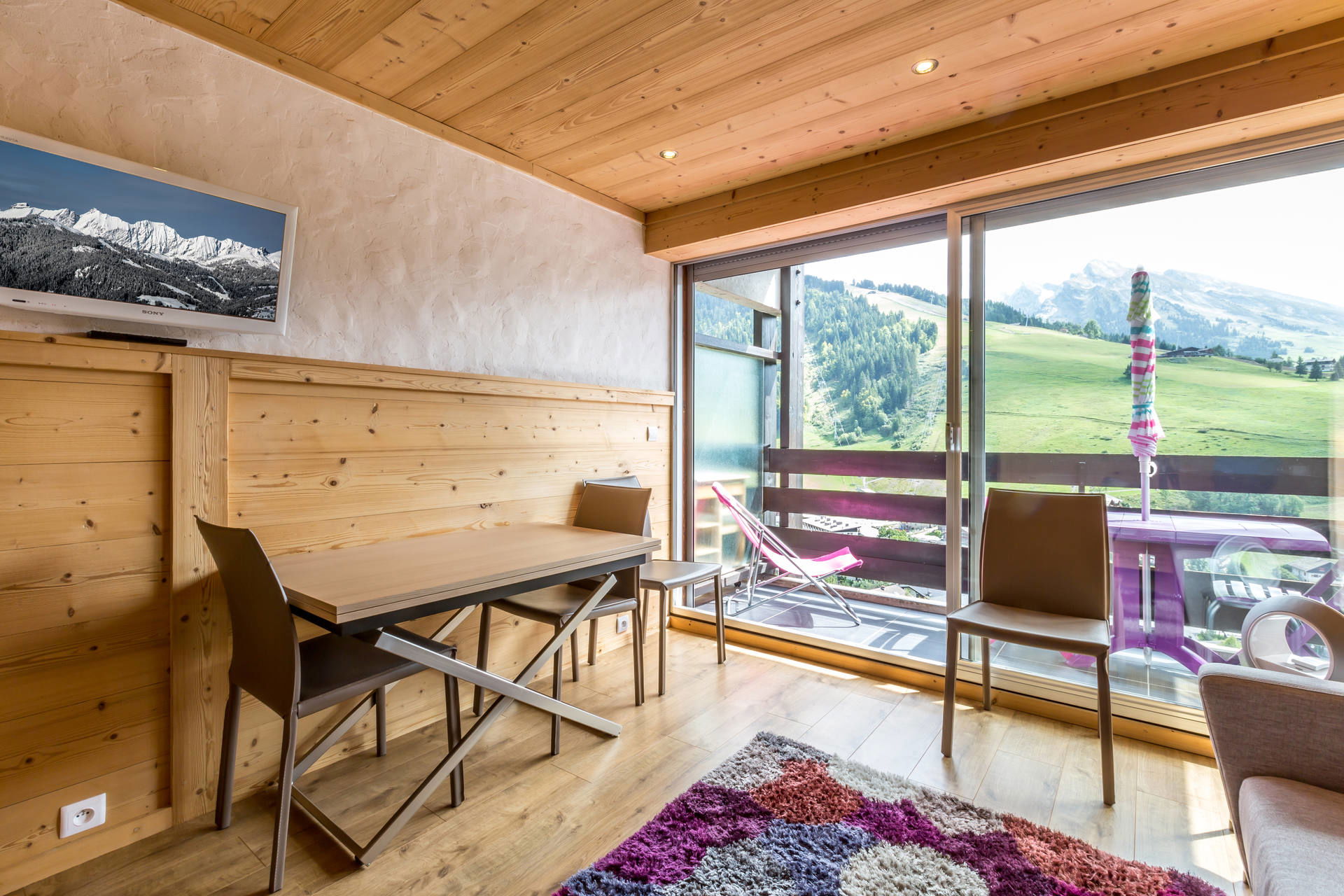 - LIVING ROOM (19.07 m²): eating place, 1 SLIDING DOUBLE BED (140), flat screen TV, south facing sliding bay window, balcony, mountain + village view