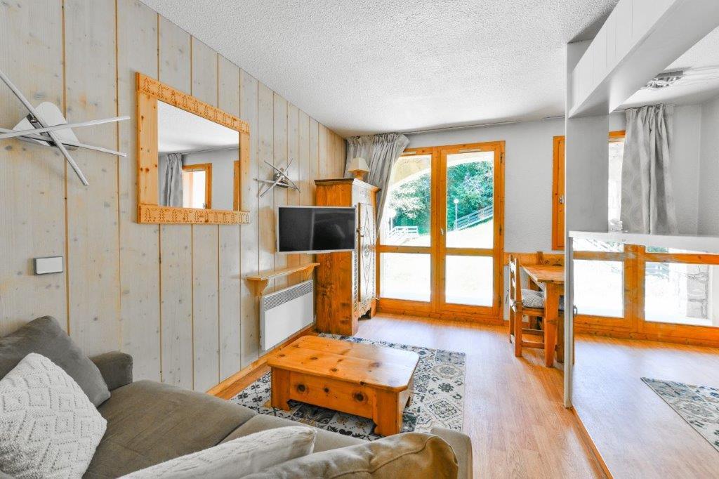 Bright main room facing South-East - view of the forest and the Vanoise mountains from the terrace on one level.