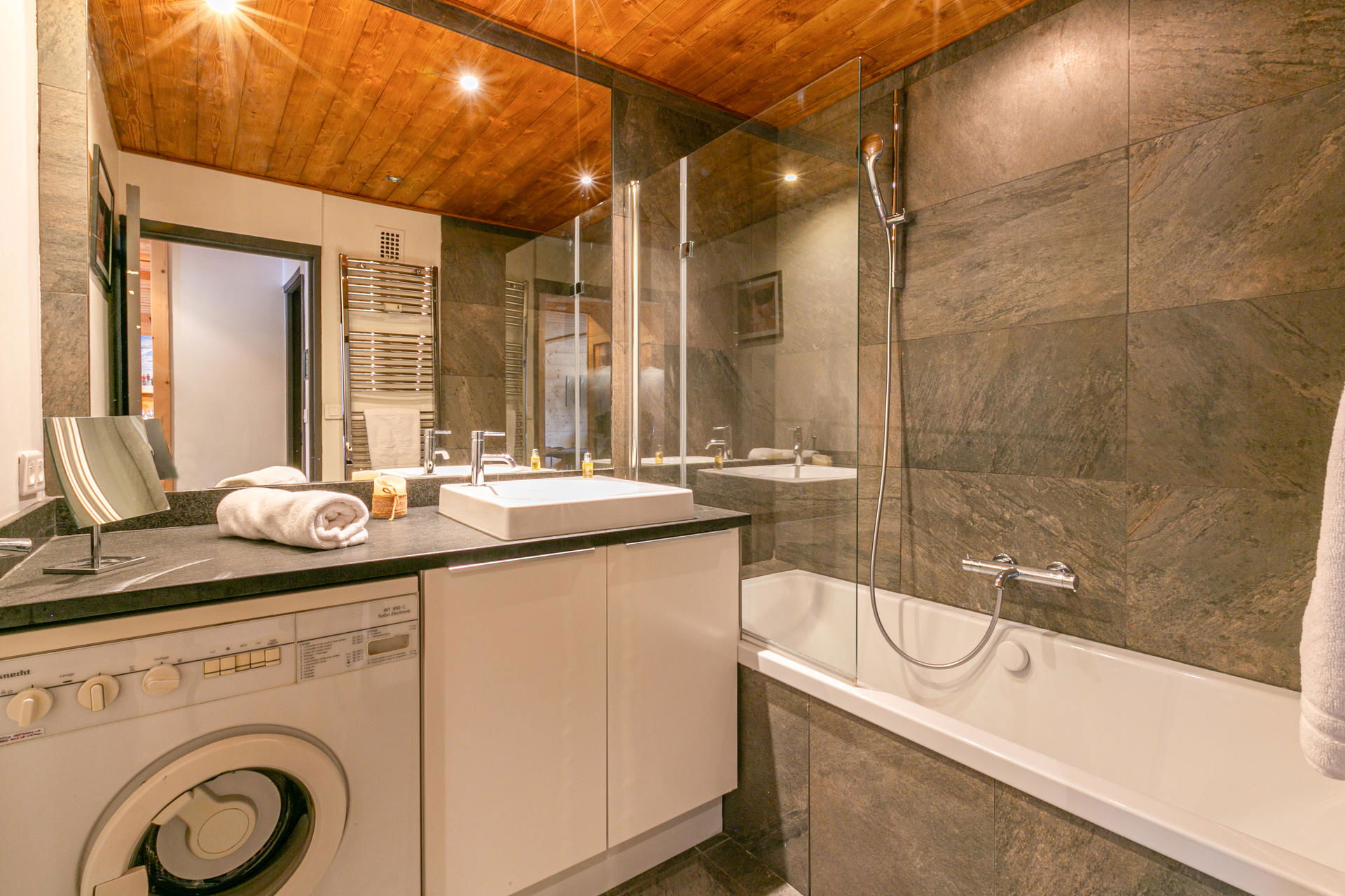Bathroom with washing machine and tumble dryer