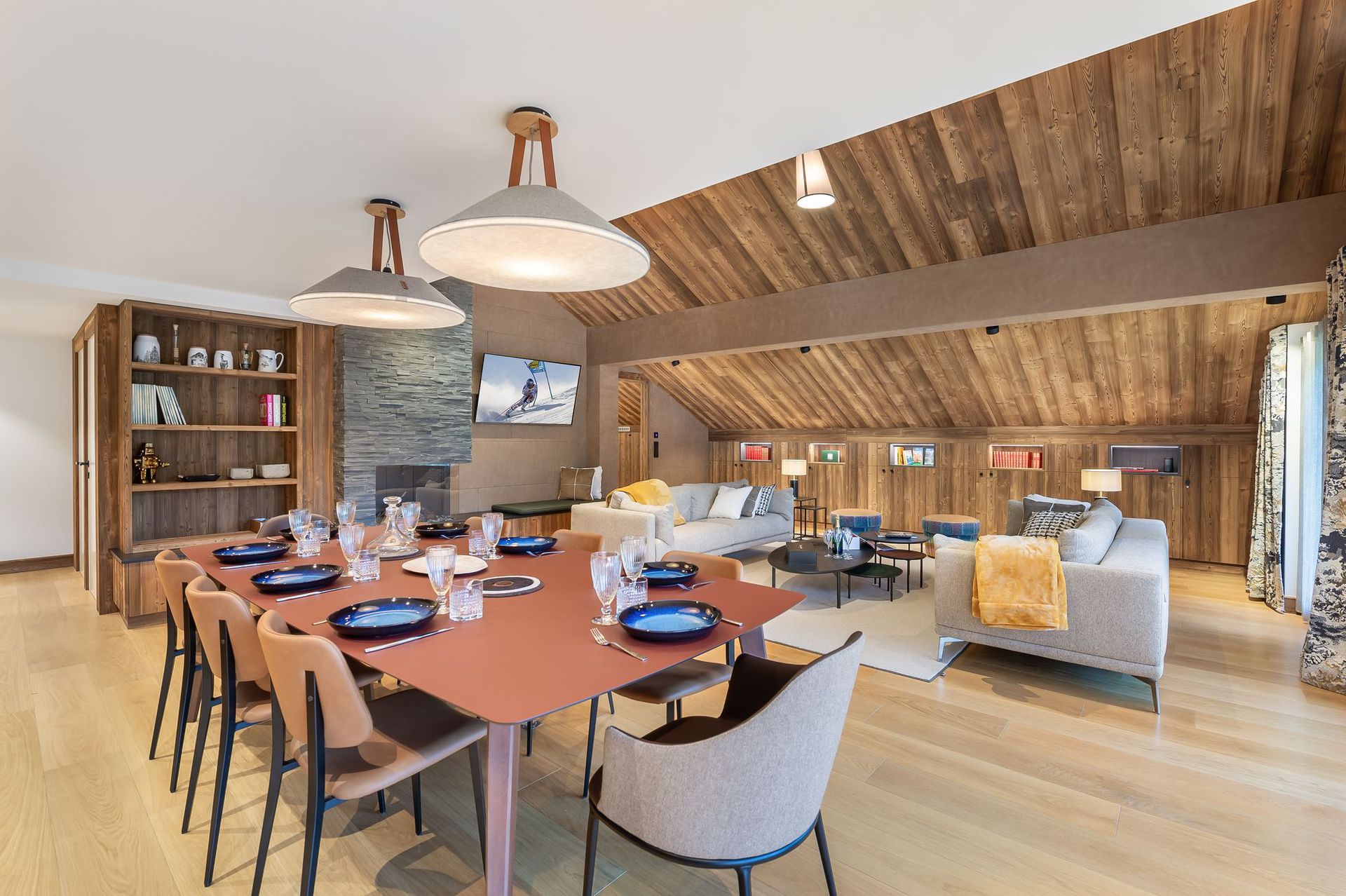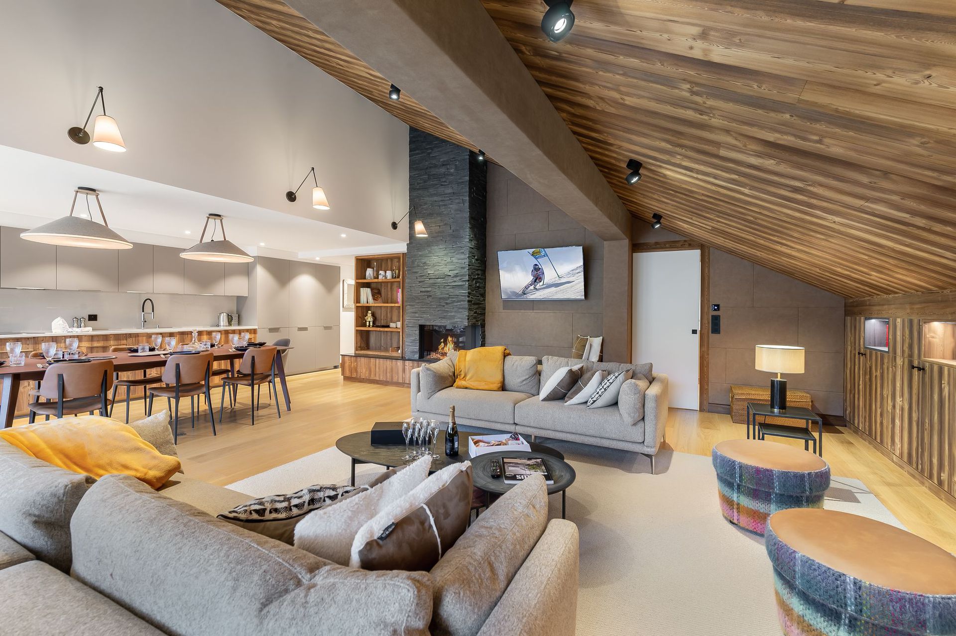 - Living and dining room with gaz fireplace, TV and balcony South facing