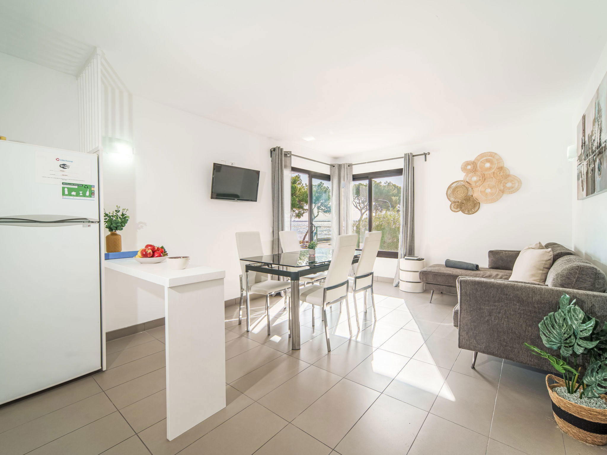 "Oratge Beach Views", 2-room apartment 57 m2 on 1st floor. Object suitable for 2 adults. Practical and comfortable furnishings: open living/dining room with dining table, digital TV, flat screen, air conditioning and forced-air heating. Exit to the balcony. 1 double bedroom with panoramic window with 1 french bed (150 cm, length 190 cm), digital TV, flat screen, air conditioning and forced-air heating. Open kitchen (oven, dishwasher, 3 ceramic glass hob hotplates, toaster, kettle, microwave, freezer, electric coffee machine). Shower/WC. Balcony. Balcony furniture. Marvellous view of the sea, the swimming pool, the countryside and the resort. Facilities: washing machine, iron, children's high chair, baby cot, hair dryer. Internet (WiFi, free). ETVPL/15860