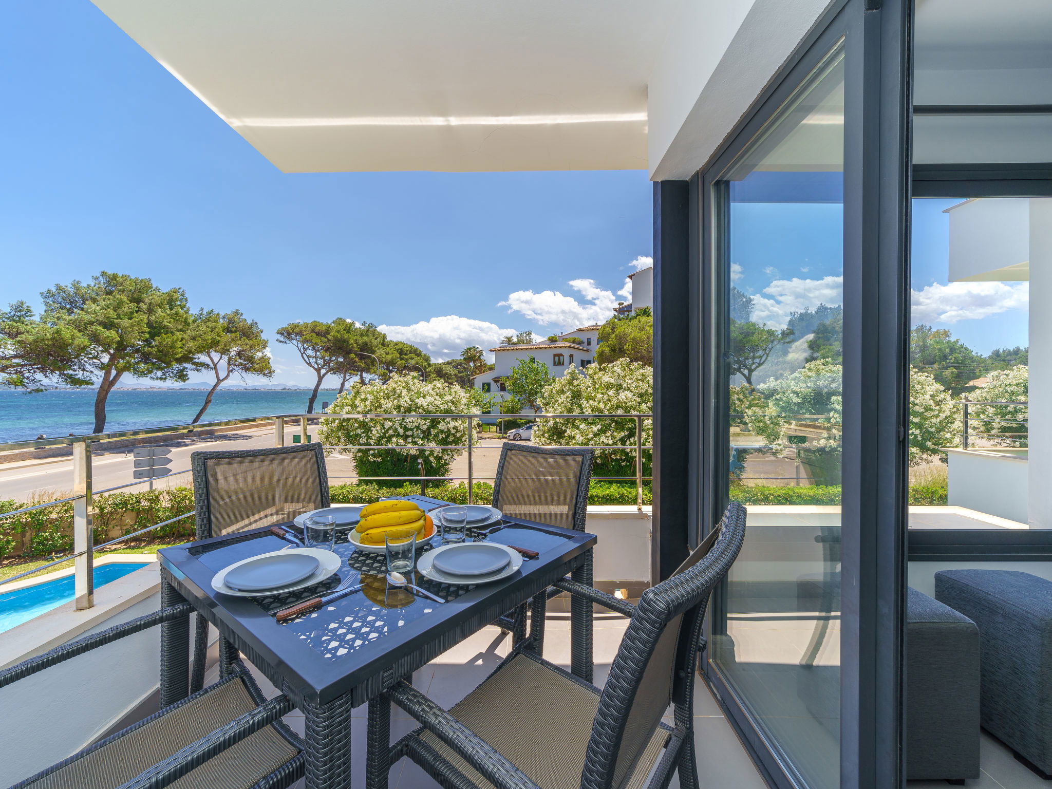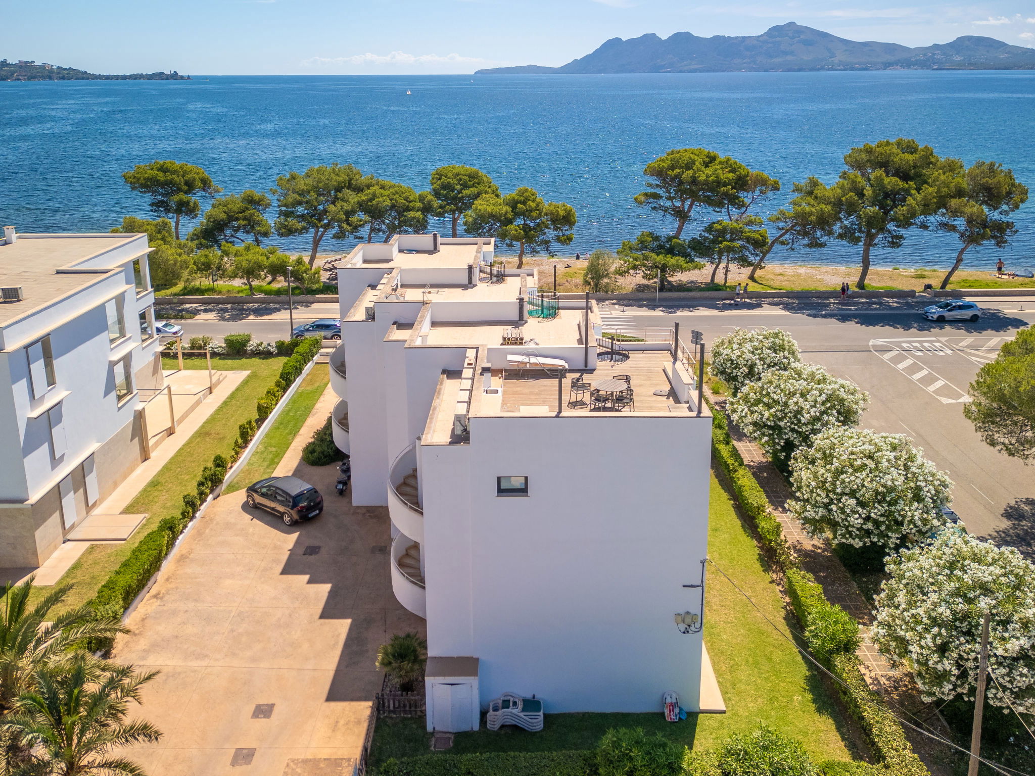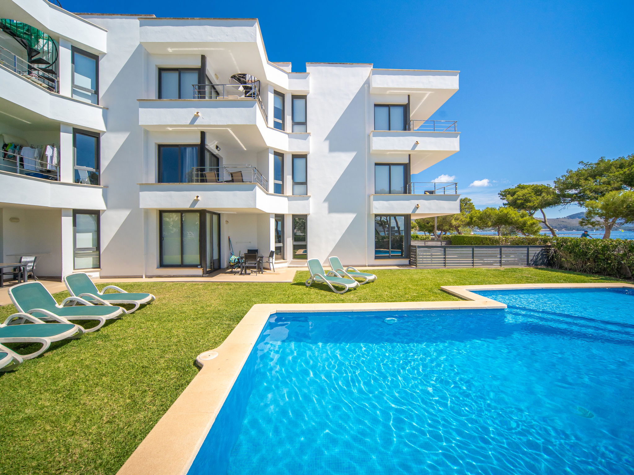Modern, beautiful, comfortable apartment block "Oratge Beach Views". In the resort 900 m from the centre of Port de Pollença, in a quiet, sunny position, excellent location: right in the centre but still quiet, 2.5 km from the edge of the forest, 10 m from the sea, 10 m from the beach, road to cross. For shared use: garden with lawn, swimming pool (8 x 4 m, depth 40 - 165 cm, seasonal availability: 01.Jan. - 31.Dec.). Outdoor shower. Private: terrace (6 m2). In the house: internet access, WiFi, air conditioning, washing machine. Public car park at 25 m, public parking on the road. Shop 1.2 km, grocery 500 m, supermarket 600 m, restaurant 50 m, bar 100 m, bakery 1.5 km, pedestrian zone 600 m, bicycle rental 900 m, pub garden 50 m, 10 minute walk to the centre, bus stop 500 m, sandy beach 10 m, shingle beach 50 m. Sports harbour 1.7 km, marina 1.7 km, golf course 9.8 km, tennis 2 km, walking paths from the house 1.5 km, cycle lane 1.5 km. Nearby attractions: Pollença Pueblo 6.7 km, Far de Formentor 23 km, Ciudad Romana de Alcúdia 7 km, Playa de Formentor 12 km, Cala Sant Vicenç 11.2 km, Mercado Local Miércoles 8-13h. Hiking paths: Cala Boquer, Atalaya de Alcúdia, Serra de Tramuntana. Please note: no lift. Object suitable for 2 adults. Airfield 66 km from the property. Neighbourhood highly sensitive to noise. Quietness and good behaviour expected.