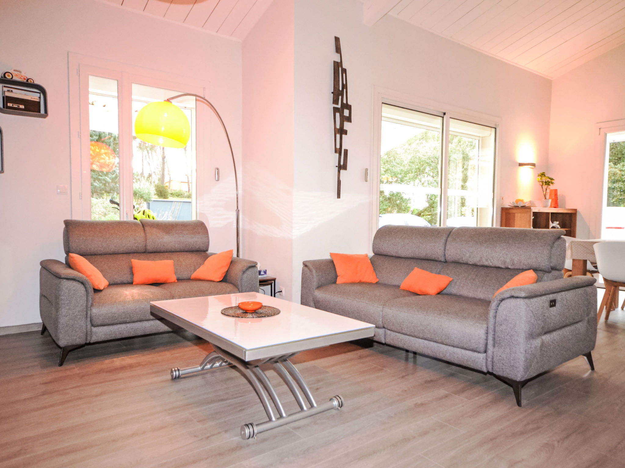living/dining room with open-hearth fireplace (only for decoration), dining table and TV. Exit to the terrace.