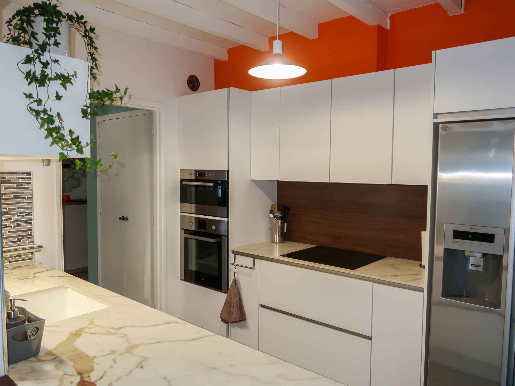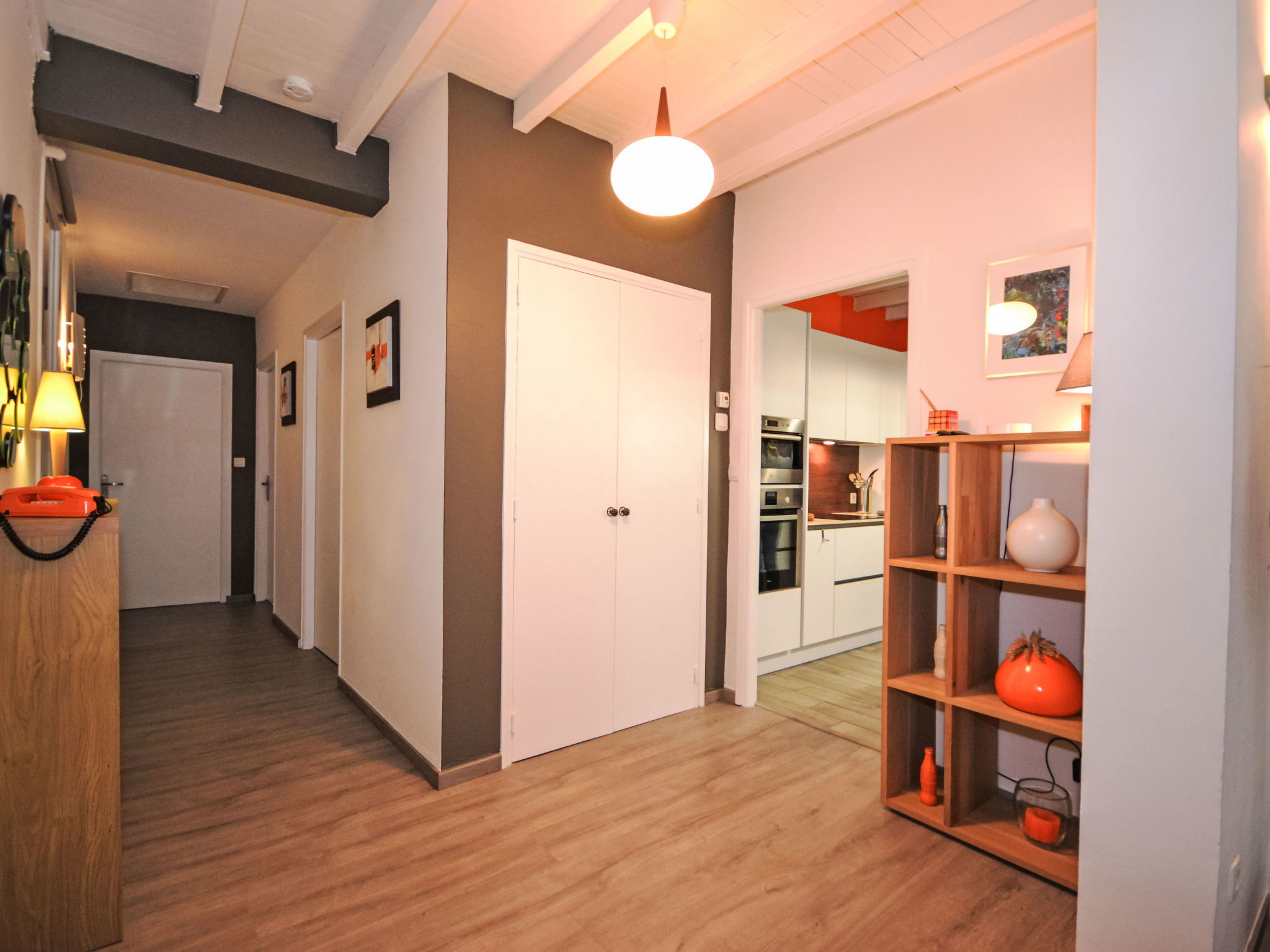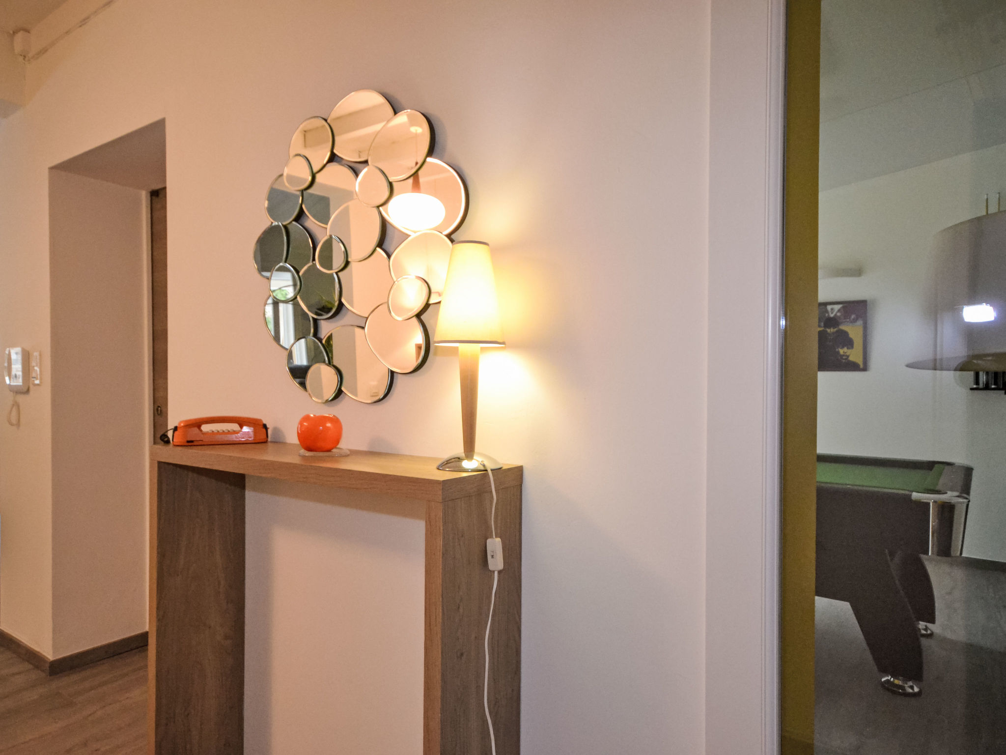 Open kitchen (oven, dishwasher, 4 induction hot plates, toaster, kettle, microwave, freezer, electric coffee machine). Exit to the terrace. Bathroom, sep. WC, double hand-basin.