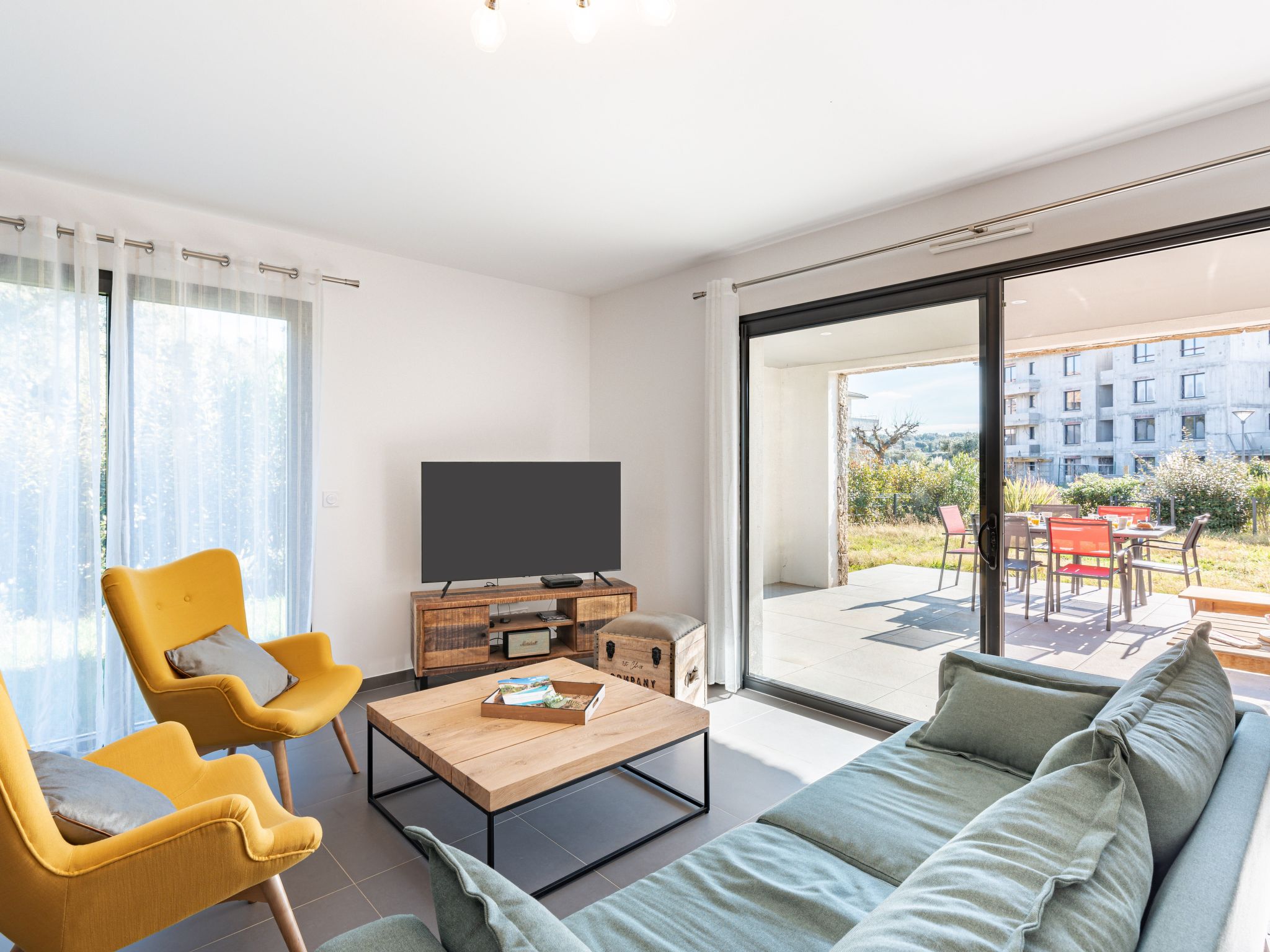 4-room apartment 110 m2, on the ground floor. Comfortable and modern furnishings: living/dining room with TV (flat screen). Exit to the terrace. 1 room with 1 french bed (160 cm, length 200 cm), shower. Exit to the garden. 1 room with 1 french bed (160 cm, length 200 cm). Exit to the terrace. 1 room with 2 beds (90 cm, length 190 cm). Exit to the garden. Open kitchen (4 hot plates, oven, dishwasher, toaster, kettle, microwave, electric coffee machine, Capsules for coffee machine (Nespresso) extra). Shower/WC, sep. WC. Electric heating, air-conditioning. 2 terraces 20 m2, small patio 40 m2. Terrace furniture, electric barbecue, deck chairs (4). Facilities: washing machine. Internet (WiFi, free). Reserved parking space n 772/773 (2 cars). Please note: apartment carpark side. Non-smokers only. Smoke alarm.
