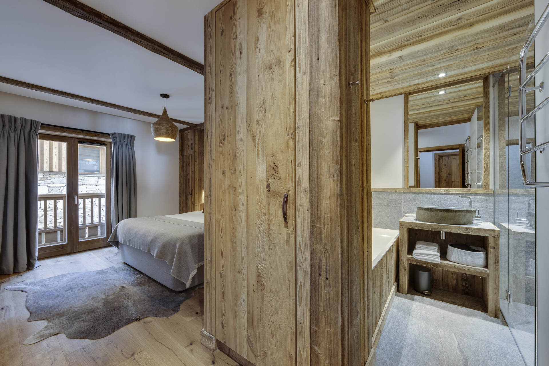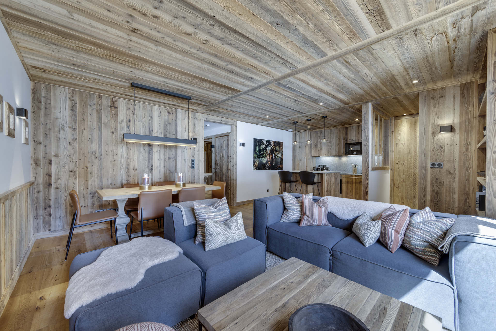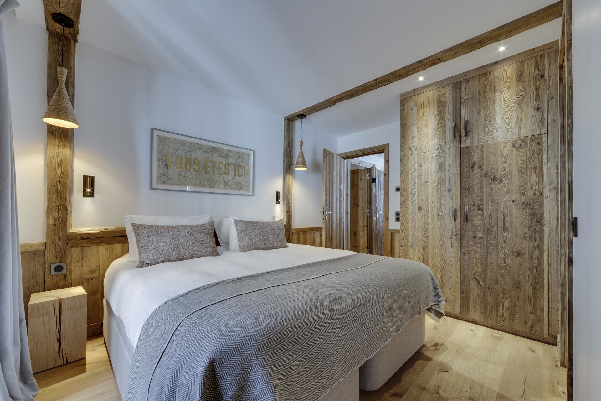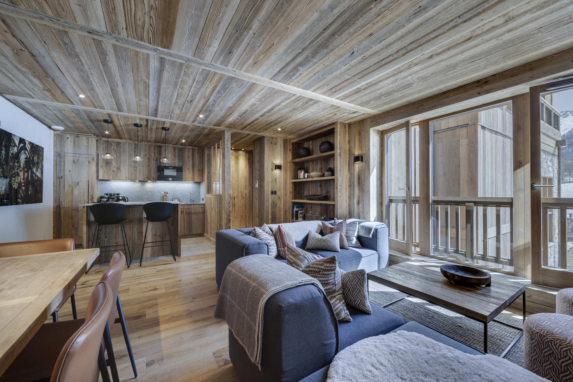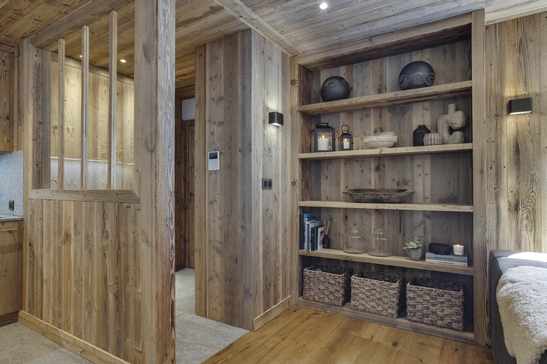 Interior of character combining contemporary decoration with an authentic Savoyard touch and warm architecture made of reclaimed timber and stone.