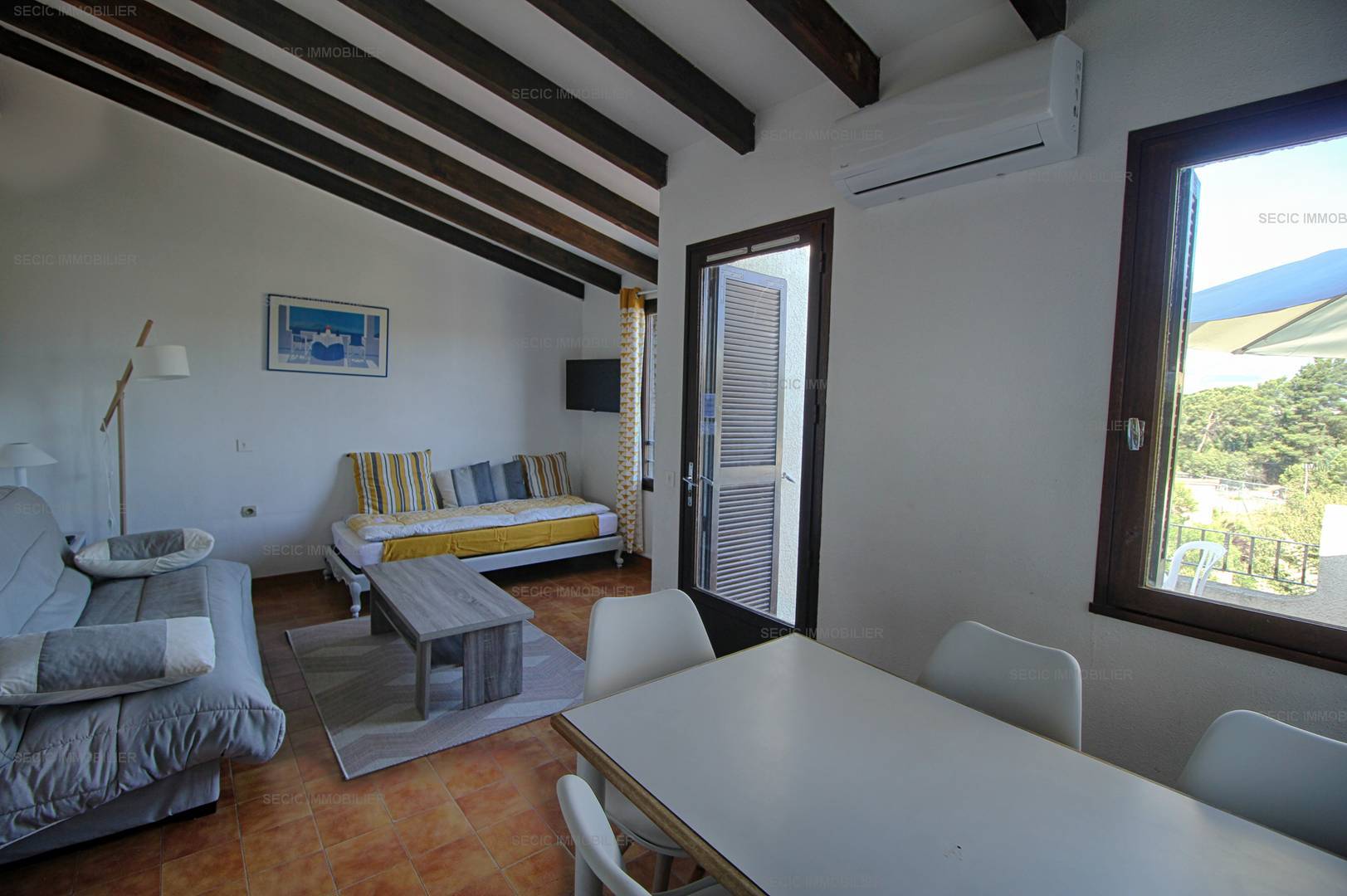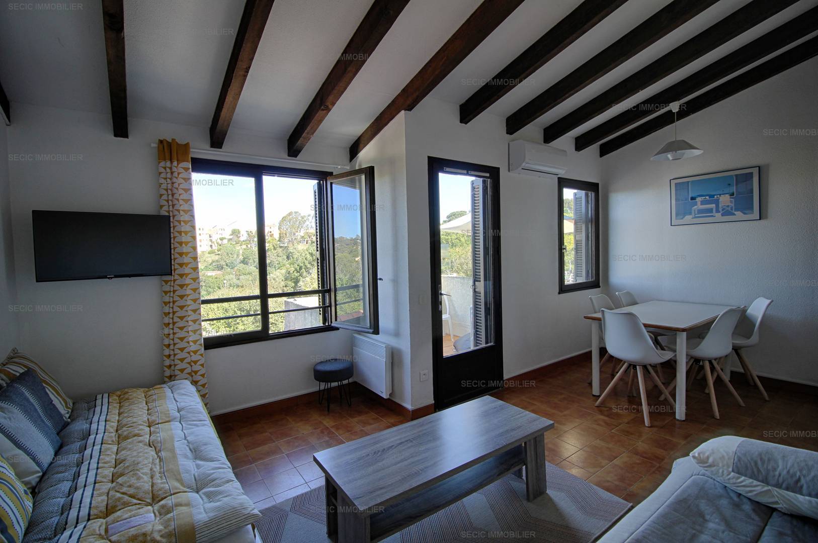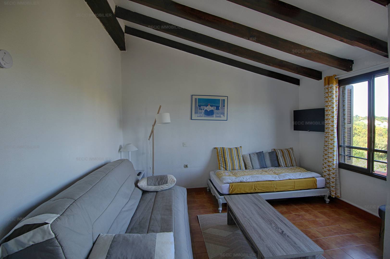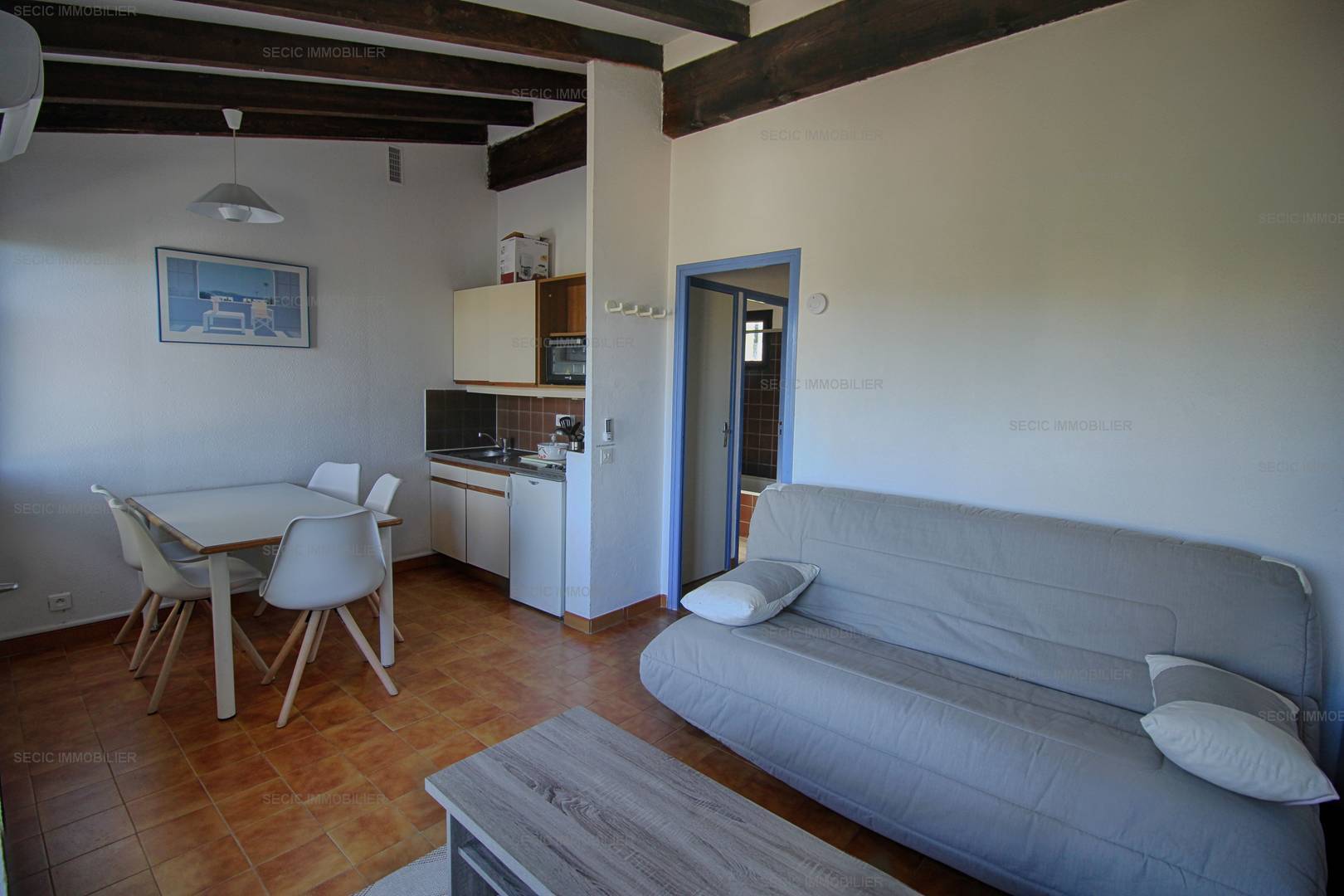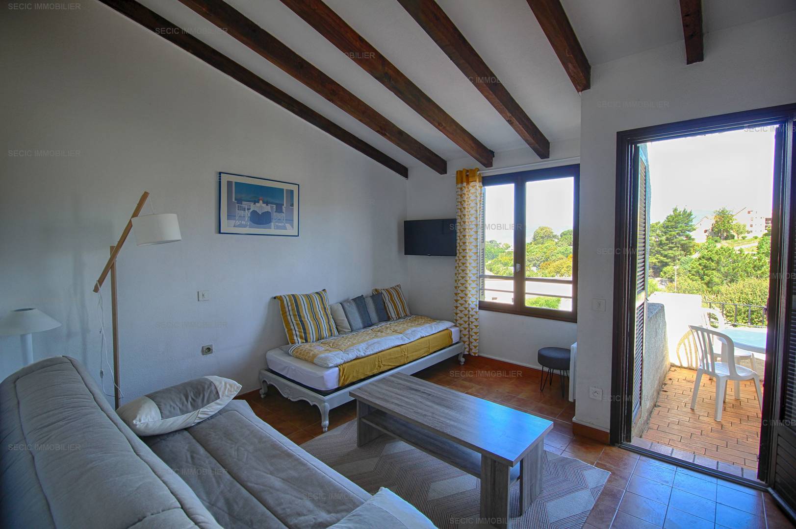 PORTICCIO (2A) - Apartment Apartment - approximately 32m2 - up to 4 people The Paesolu residence is located on the hillside, approximately 1.5 km from the beach, the center of Porticcio and its shops, composed of a small buildings of maximum 2 floors. You will have free access to the swimming pool of the residence open between mid-May and the end of September, as well as to the tennis courts. The proposed apartment, type F2, includes: an entrance with storage, a main room with kitchen area open to the living room dining room with sofa bed (sleeps 140) overlooking the terrace with sea view, a bedroom with two beds in 90 superimposed, an independent bathroom and an independent WC. Bed linen and towels as well as departure cleaning are included in the price. Only kitchen towels are not provided.