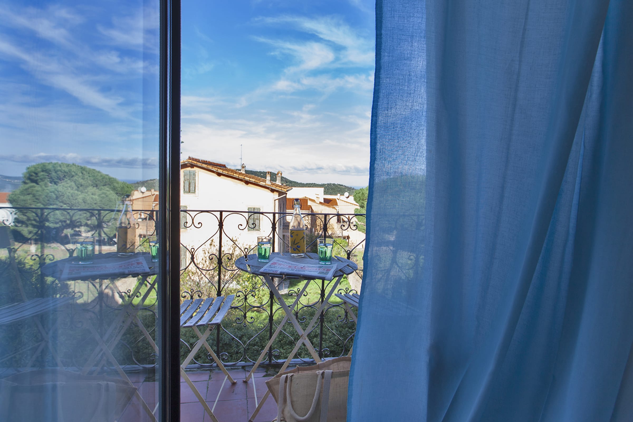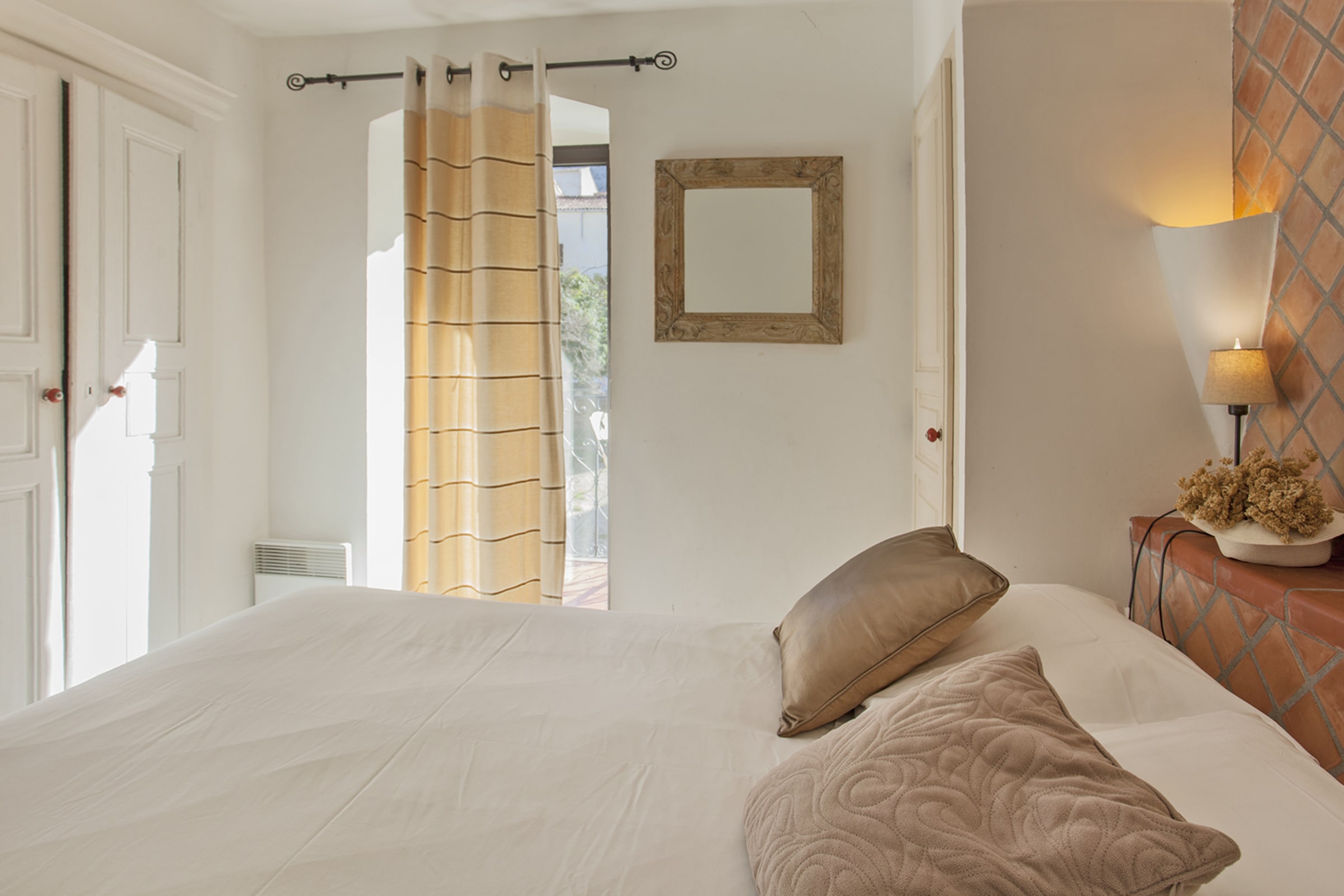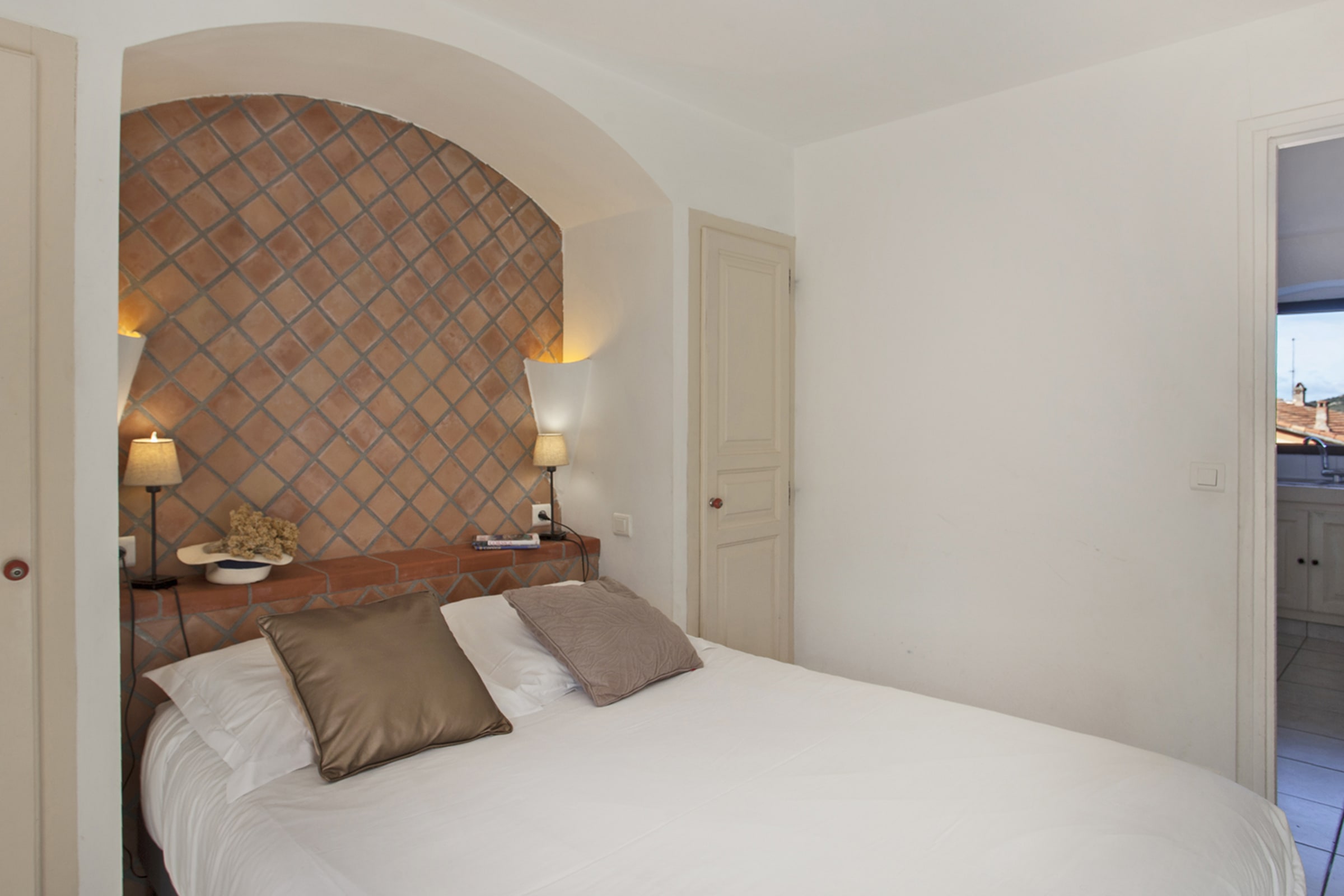 Apartment with a separate bedroom (bed 140 cm) opening onto a balcony above a small square clay.