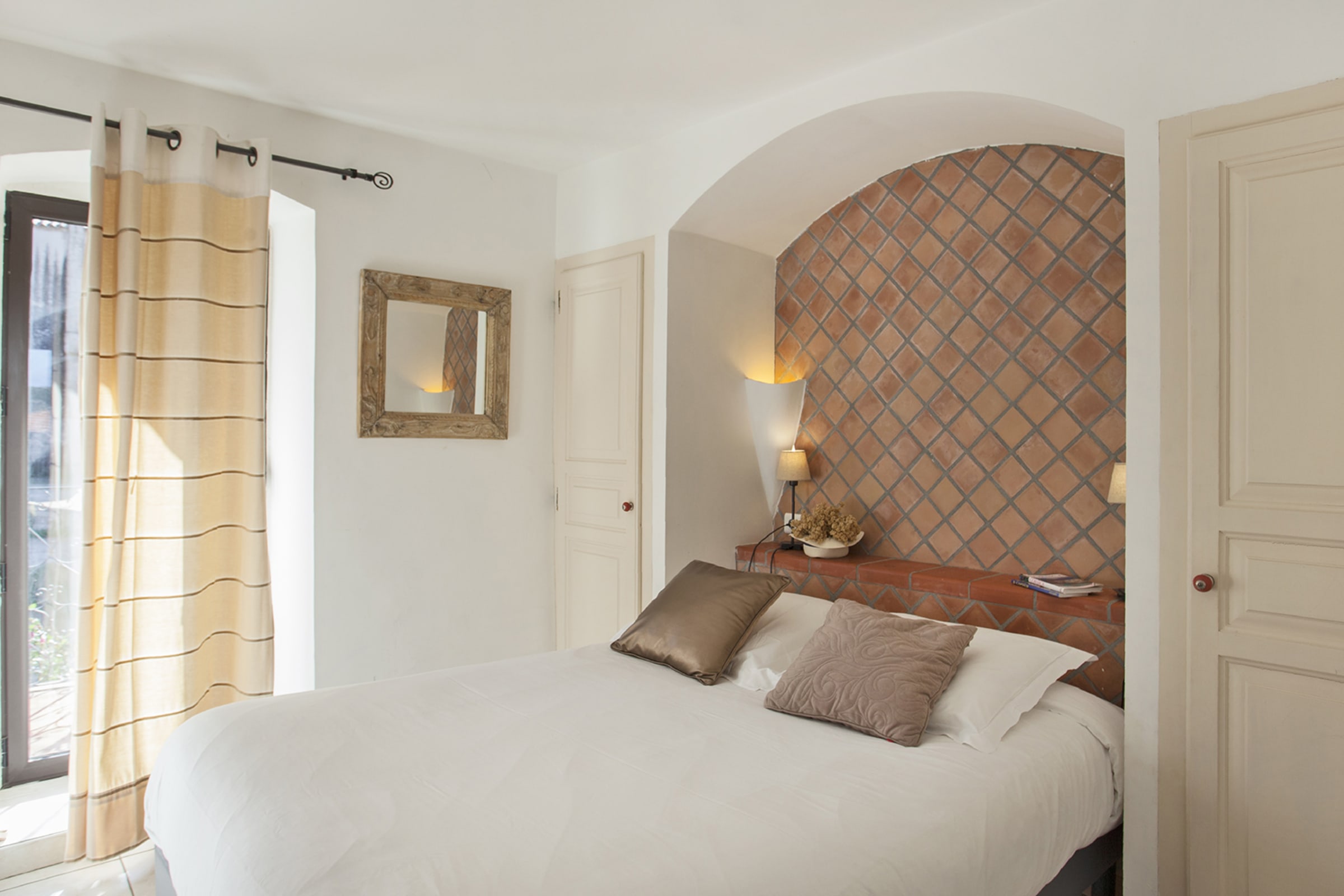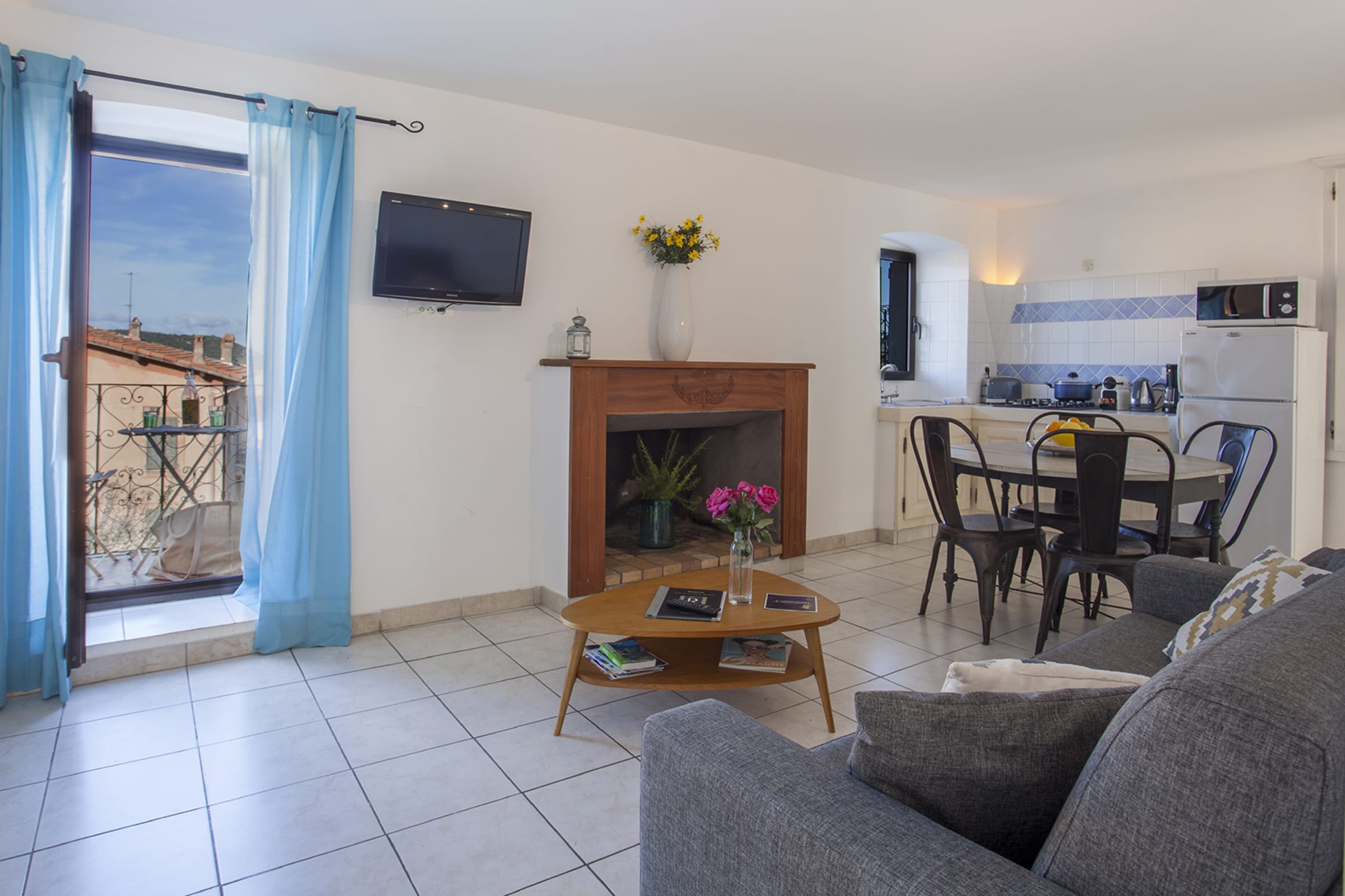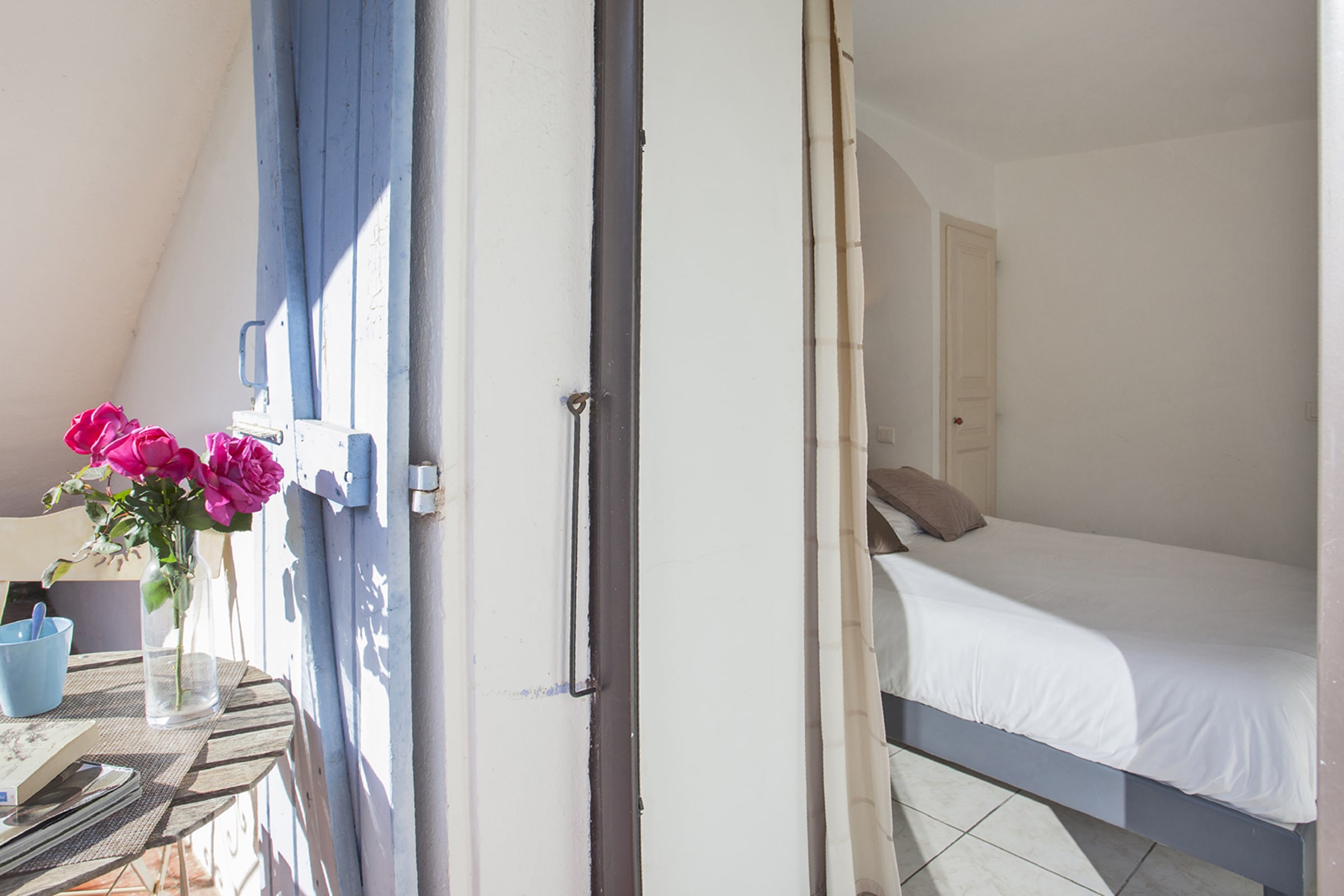 Apartment with a separate bedroom (bed 140 cm) opening onto a balcony above a small square clay.