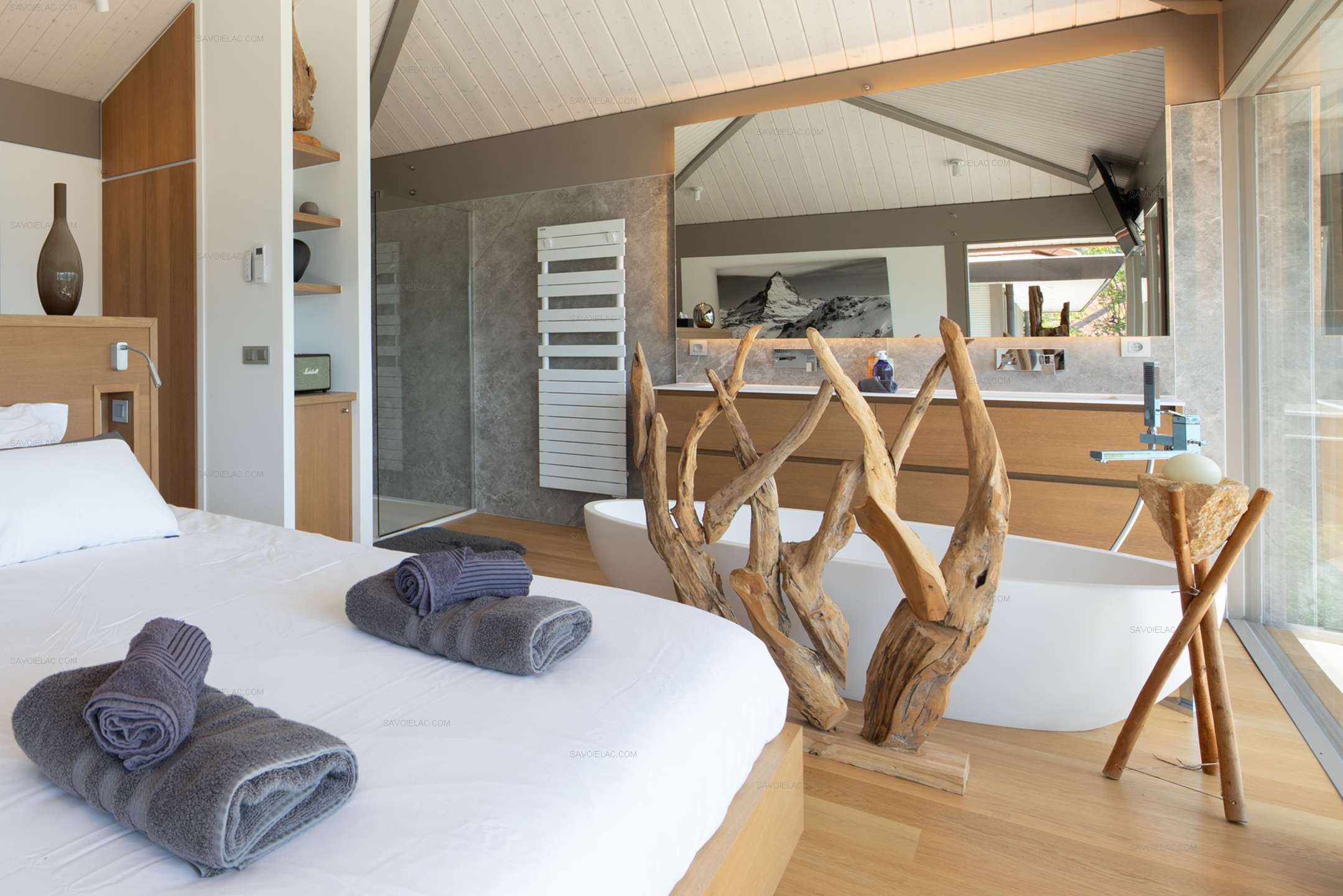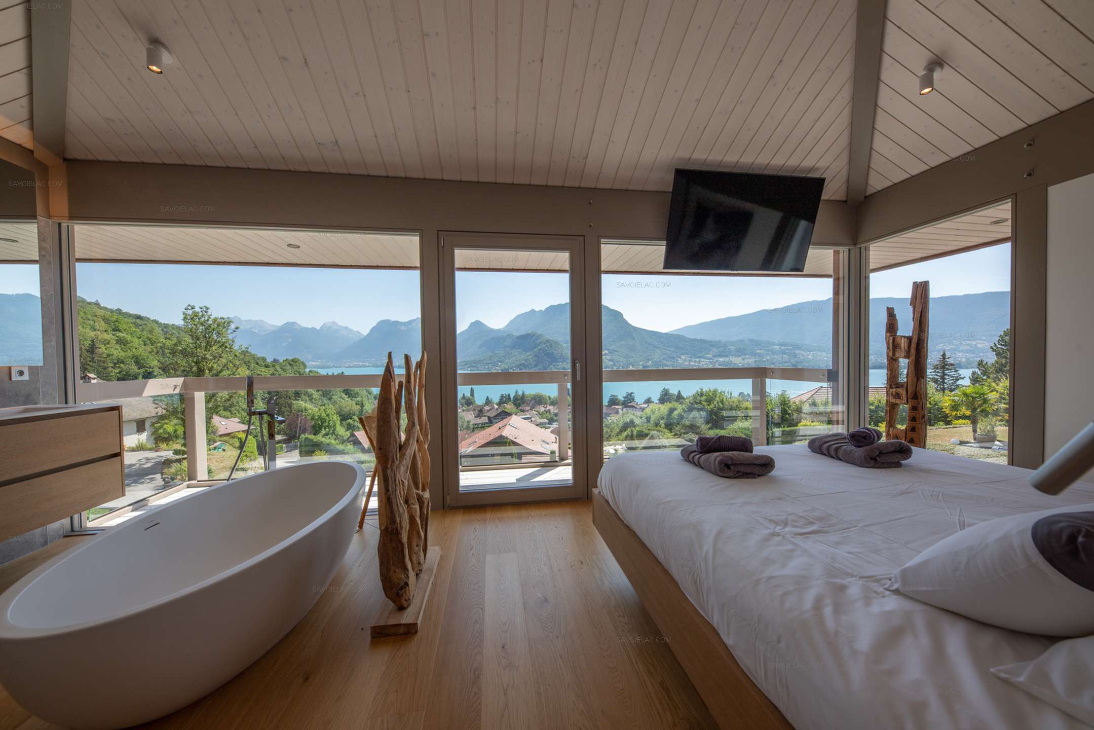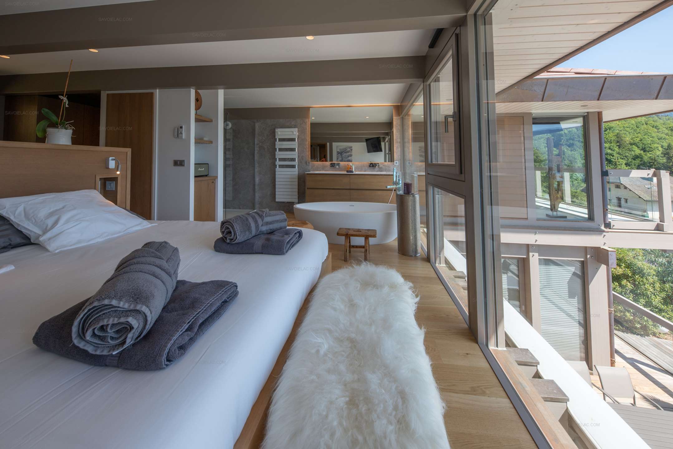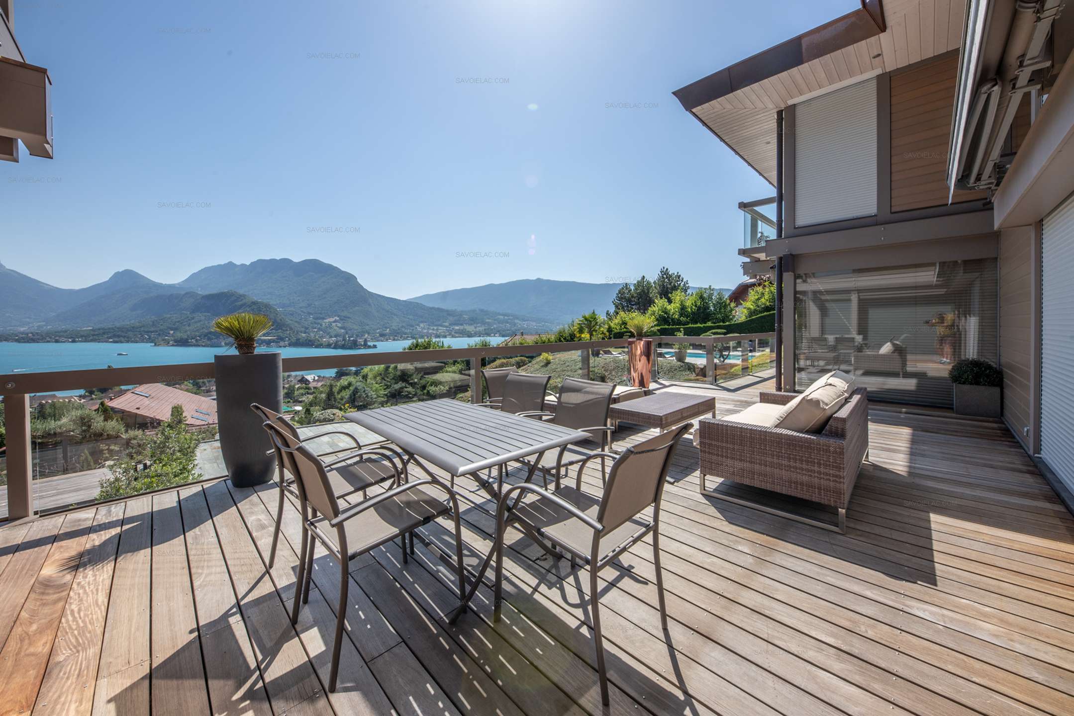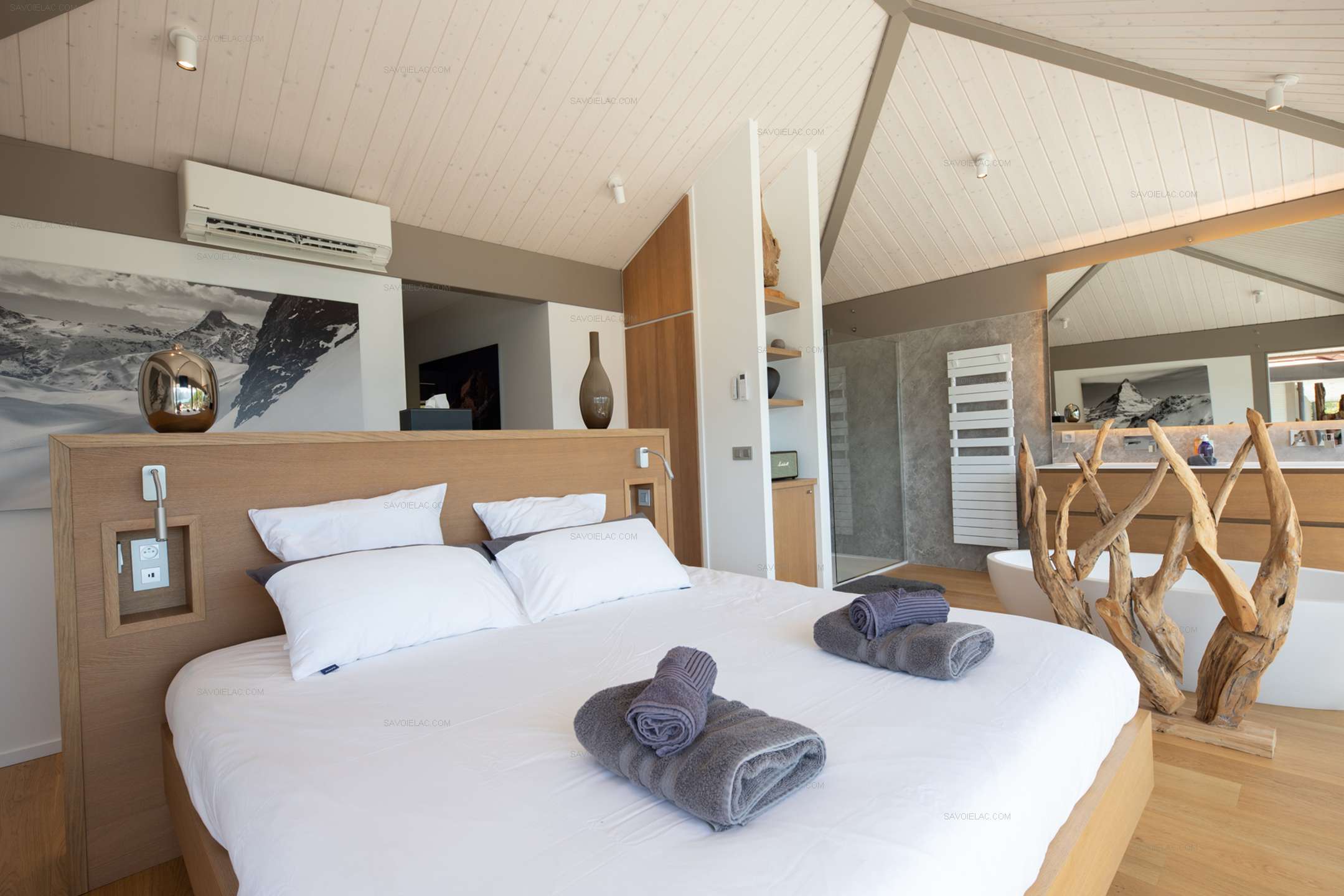 Relax on its large panoramic terrace offering you a view of the lake and mountains as well as its heated swimming pool with spa jets (temperature fluctuating depending on the outside temperature).