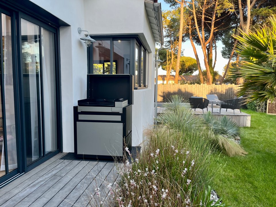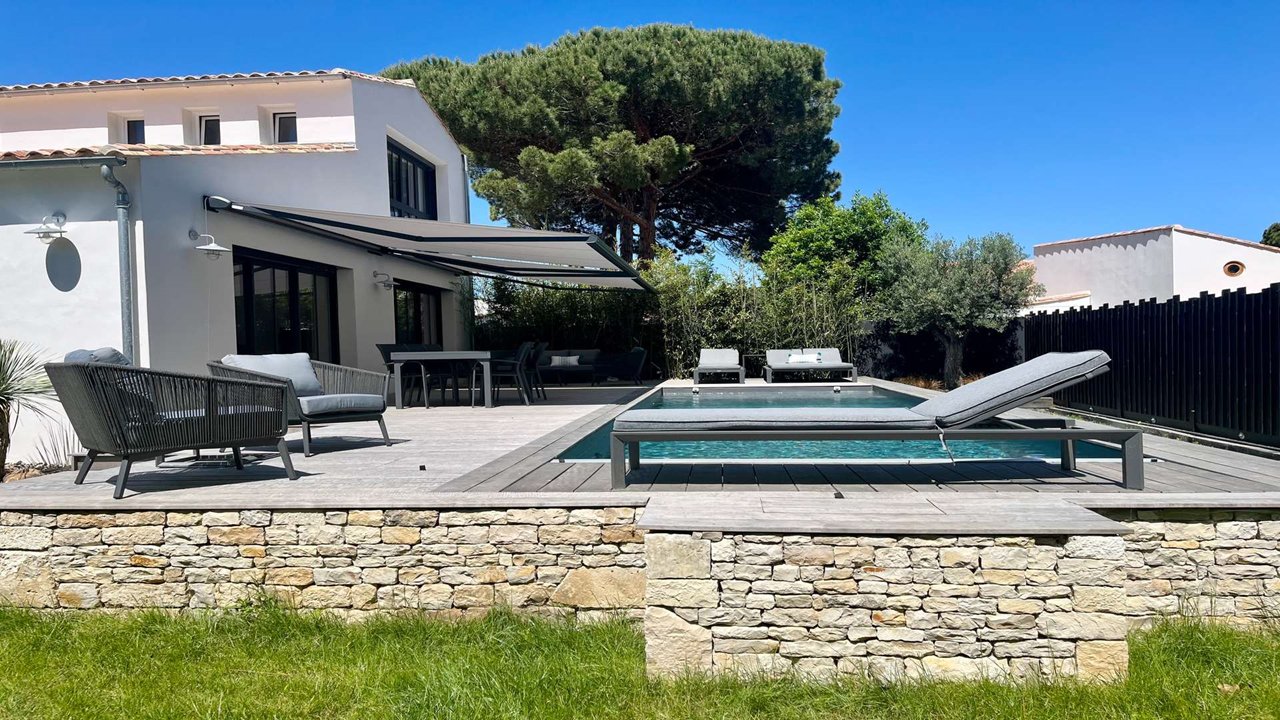 The exterior of the house, facing south-east, has a large wooden terrace of 70m² with its garden furniture, two awnings to shelter you from the sun and a heated swimming pool of 27m², secured by a electric curtain. (Heated swimming pool from May to October)